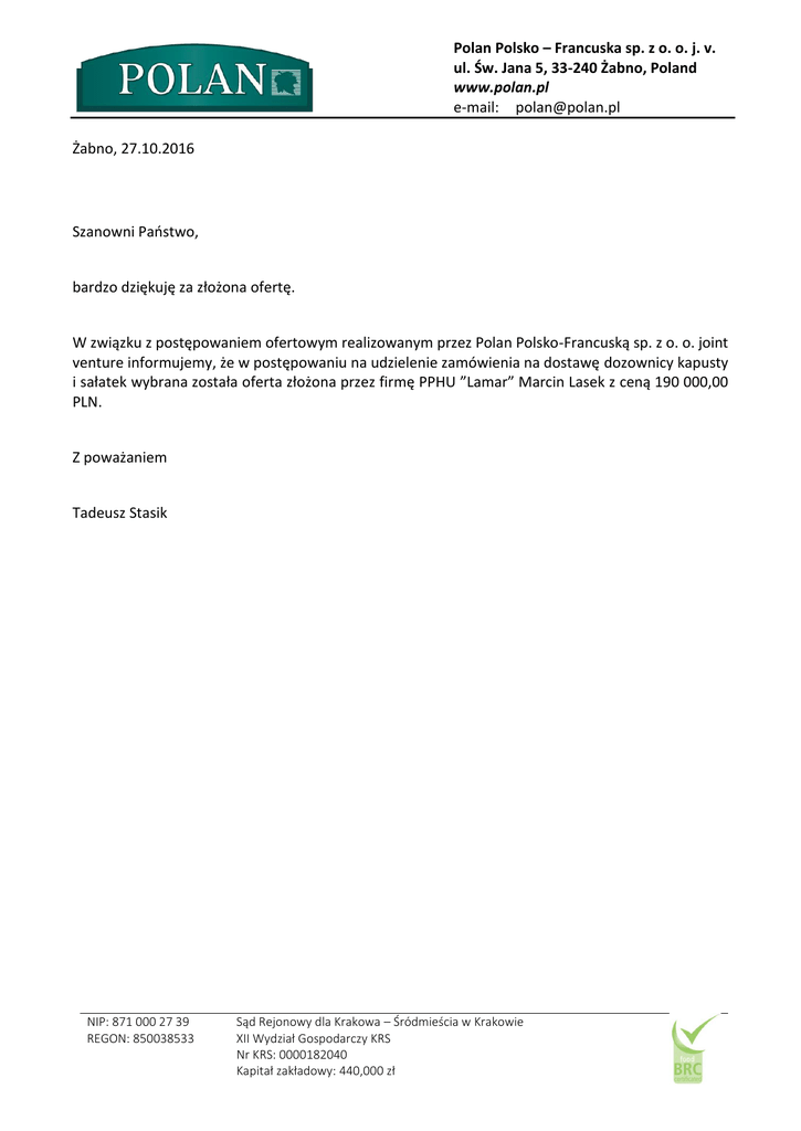 Polan Polsko – Francuska sp. z o. o. j. v. ul. Św. Jana 5, 33-240 Żabno, Poland www.polan.pl e-mail: [email protected] Żabno, 27.10.2016 Szanowni Państwo, bardzo dziękuję za złożona ofertę. W związku z postępowaniem ofertowym realizowanym przez Polan Polsko-Francuską sp. z o. o. joint venture informujemy, że w postępowaniu na udzielenie zamówienia na dostawę dozownicy kapusty i sałatek wybrana została oferta złożona przez firmę PPHU ”Lamar” Marcin Lasek z ceną 190 000,00 PLN. Z poważaniem Tadeusz Stasik NIP: 871 000 27 39 REGON: 850038533 Sąd Rejonowy dla Krakowa – Śródmieścia w Krakowie XII Wydział Gospodarczy KRS Nr KRS: 0000182040 Kapitał zakładowy: 440,000 zł