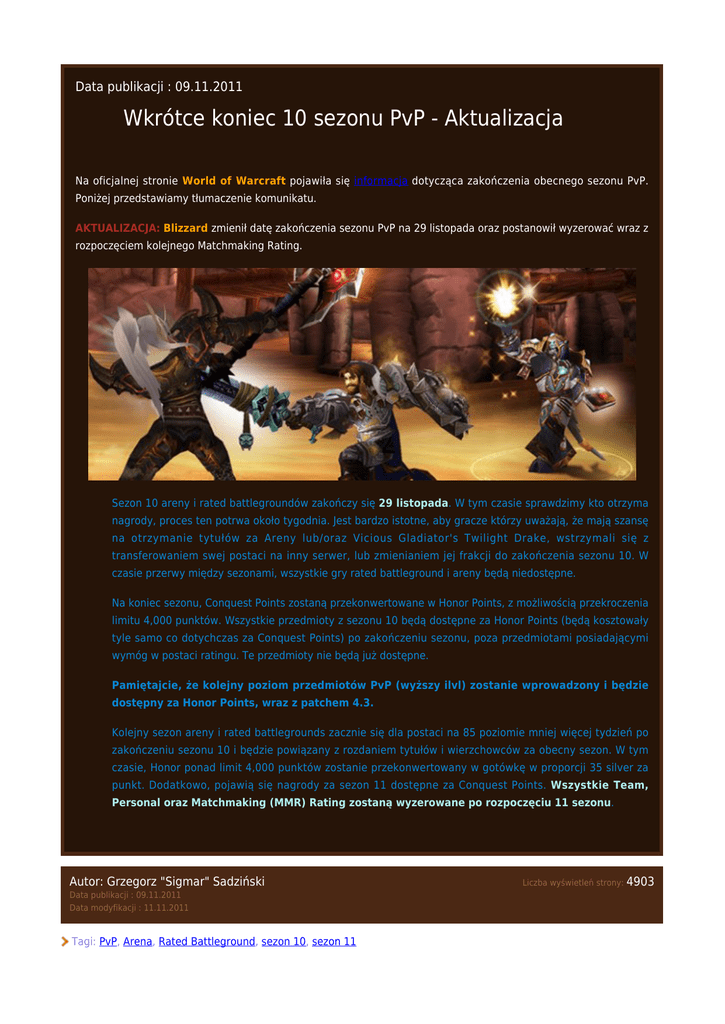 Data publikacji : 09.11.2011 Wkrótce koniec 10 sezonu PvP - Aktualizacja Na oficjalnej stronie World of Warcraft pojawiła się informacja dotycząca zakończenia obecnego sezonu PvP. Poniżej przedstawiamy tłumaczenie komunikatu. AKTUALIZACJA: Blizzard zmienił datę zakończenia sezonu PvP na 29 listopada oraz postanowił wyzerować wraz z rozpoczęciem kolejnego Matchmaking Rating. Sezon 10 areny i rated battlegroundów zakończy się 29 listopada. W tym czasie sprawdzimy kto otrzyma nagrody, proces ten potrwa około tygodnia. Jest bardzo istotne, aby gracze którzy uważają, że mają szansę na otrzymanie tytułów za Areny lub/oraz Vicious Gladiator's Twilight Drake, wstrzymali się z transferowaniem swej postaci na inny serwer, lub zmienianiem jej frakcji do zakończenia sezonu 10. W czasie przerwy między sezonami, wszystkie gry rated battleground i areny będą niedostępne. Na koniec sezonu, Conquest Points zostaną przekonwertowane w Honor Points, z możliwością przekroczenia limitu 4,000 punktów. Wszystkie przedmioty z sezonu 10 będą dostępne za Honor Points (będą kosztowały tyle samo co dotychczas za Conquest Points) po zakończeniu sezonu, poza przedmiotami posiadającymi wymóg w postaci ratingu. Te przedmioty nie będą już dostępne. Pamiętajcie, że kolejny poziom przedmiotów PvP (wyższy ilvl) zostanie wprowadzony i będzie dostępny za Honor Points, wraz z patchem 4.3. Kolejny sezon areny i rated battlegrounds zacznie się dla postaci na 85 poziomie mniej więcej tydzień po zakończeniu sezonu 10 i będzie powiązany z rozdaniem tytułów i wierzchowców za obecny sezon. W tym czasie, Honor ponad limit 4,000 punktów zostanie przekonwertowany w gotówkę w proporcji 35 silver za punkt. Dodatkowo, pojawią się nagrody za sezon 11 dostępne za Conquest Points. Wszystkie Team, Personal oraz Matchmaking (MMR) Rating zostaną wyzerowane po rozpoczęciu 11 sezonu. Autor: Grzegorz "Sigmar" Sadziński Data publikacji : 09.11.2011 Data modyfikacji : 11.11.2011 Tagi: PvP, Arena, Rated Battleground, sezon 10, sezon 11 Liczba wyświetleń strony: 4903 Komentarz (18) dodaj komentarz Możliwe też że wraz z rozpoczęciem tego sezonu, 24 listopada, wejdzie 4.3 :-) ~~Pozdro~Naloriak 2011/11/09 20:13 Zastawanie mnie tylko czemu jeszcze nie ma nowych setów PvP a jak chodzi o PvE to potrafią kilkanaście tygodni prędzej je pokazać.~balkan93 2011/11/09 20:44 juz sa na mmochampion ale dziwie sie ze nie ma preview na potrzeby transmogryfikacji..... no i sa raczej srednie jeslio idzie o stosunek do pve....~Taldoron 2011/11/09 20:46 http://www.wowheadnews.com/blog=195681/4-3-preview-season-11-pvp-sets tak nie ma nowych setów pvp......~ pandaren2 2011/11/10 12:19 "do zakończenia sezonu 9" literówa! nie 9 tylko 10 ;d swoją drogą ledwo czowiek ubrał alty w 10 a już 11... super, czekam tylko na kolejny zwrot honoru za nastepny sezon jak to miało miejsce parę miechów temu :)~Bzium 2011/11/10 13:16 Jakoś mnie nie dziwi, że się nie chwalą setami pvp patrząc na nie. Blizz olał graczy pvp ciepłym z wysokości. To trochę smutne, że nie mają już pomysłów na rozwijanie tej części rozgrywki, bo przecież nie samym raidowaniem człowiek żyje ~Elune 2011/11/10 13:35 to w takim razie byście chcieli by Blizz zmienił lub dodał w kwesti PVP ?~Arkadio 2011/11/10 13:52 Najlepiej żeby te lenie ponaprawiały bugi w PVP i zresetowały MMR i żeby w końcu wzieli się za hackerów.A nie mówią, że ich banują a wcale tak nie jest.Powinni też znerfić magów porządnie, bo już stanowczo za długo są OP.W PvE jakby ktoś hackował i czitował to odrazu by dostał bana jak to było za czasów wotlk z Ensidią.Skoro PvP jest w tej grze to może niech zaczną się tym interesować a nie tylko PvE i PvE >.<~Todiru 2011/11/10 16:36 taa i niech jeszcze znerfia troche resto shamka w pvp bo trza juz go calkowicie zabic w pve :(~zwyklygracz 2011/11/10 18:20 @Todiru Po pierwsze, nie tak łatwo wykryc hakera, jesli nikt go uprzednio nie zgłosi. Po drugie, gdzie ty widzisz brak zainteresowania PvP? Niedawno dodano dużo nowych mozliwosci rozgrywki, typu rated BG, War games. W 4.3 dojdą scenariusze (bardzo ciekawa koncepcja), dojdą walki kompanów i podobno maja zrobic cos, aby World PVP bylo ciekawsze i chętniej wybierane przez graczy :D Gdzie ty tu widzisz lenistwo? Po prostu czego by nie zrobili, to zkrytykujesz.~flaaj 2011/11/10 20:01 MOP dojdą scenariusze (bardzo ciekawa koncepcja), dojdą walki kompanów i podobno maja zrobic cos, aby World PVP bylo ciekawsze i chętniej wybierane przez graczy :D ...........~pandaren2 2011/11/10 20:13 News zaktualizowany - Blizzard zmienił datę zakończenia sezonu na 29 listopada oraz zdecydował się na reset Matchmaking Rating =)~Sigmar 2011/11/11 11:37 hackerzy w pvp? ja sie jeszcze z takim czyms nie spotkalem co do nerfow to kazda klasa jest dobra tylko trzeba ja opanowac, a mag wcale taki super nie jest jak wiesz jak go zabic~ GOPA 2011/11/11 11:41 ano w MOP. Nie wiem, czemu napisalem, ze w 4.3.~flaaj 2011/11/11 11:46 @ GOPA to, ze ty sie nie spotkales to nie znaczy ze ich nie ma. Wykorzystywanie bugow mmr to jest ta "hakerka". Ewentualnie force DC na graczach z przeciwnego teamu. I przestan pisac ze "kazda klasa jest dobra" do pvp.~Nekkro 2011/11/11 14:45 nie, nie przestane bo takie jest moje zdanie.Moze taki DK wybija sie ponad inne klasy ale bez przesady.Nie placzcie na patche, na dodatki, na pvp ze maja to w tylku.Nauczcie sie grac swoja klasa...... i zeby byla jasnosc sytuacji Nekkro, piszac pvp nie mam na mysli dueli pod stolica czy nawet areny 2 na 2.Prawdziwe pvp to RBG i areny min 3 na 3. Bo w pojedynkach 1 na 1 to nawet w simsach nie ma balansu :D~GOPA 2011/11/11 23:01 moze inaczej. Klasa kazda jest dobra, ale spec nie. Ile w tych arenach 3v3 masz np...fury warkow ? Combat rogues ? Boomkinow ? Prawdziwe pvp ? Nawet na rbg mozna chodzic ciekawymi specami, ale jezeli ktos traktuje to powazniej, to predzej wybierze t