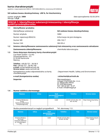 karta charakterystyki zgodnie z rozporządzeniem (WE) nr 1907/2006 (REACH), zmienionej 2015/830/UE Sól sodowa kwasu dezoksycholowy ≥98 %, for biochemistry numer artykułu: 3484 Wersja: 1.0 pl data sporządzenia: 02.03.2016 SEKCJA 1: Identyfikacja substancji/mieszaniny i identyfikacja spółki/przedsiębiorstwa 1.1 1.2 Identyfikator produktu Identyfikacja substancji Sól sodowa kwasu dezoksycholowy Numer artykułu 3484 Numer rejestracji (REACH) Informacja nie jest dostępna. Numer WE 206-132-7 Numer CAS 302-95-4 Istotne zidentyfikowane zastosowania substancji lub mieszaniny oraz zastosowania odradzane Zastosowania zidentyfikowane: 1.3 chemikalia laboratoryjna Dane dotyczące dostawcy karty charakterystyki Carl Roth GmbH + Co KG Schoemperlenstr. 3-5 D-76185 Karlsruhe Niemcy Telefon: +49 (0) 721 - 56 06 0 Fax: +49 (0) 721 - 56 06 149 e-mail: [email protected] Strona www: www.carlroth.de 1.4 Kompetentna osoba odpowiedzialna za kartę charakterystyki : Department Health, Safety and Environment e-mail (kompetentna osoba) : [email protected] Importer Wprowadzający: Linegal Chemicals Sp. z o.o. ul. Kasprzaka 44/52 01-224 Warszawa Tel: +48 22 631 16 27 E-mail: [email protected] Numer telefonu alarmowego Nazwa Ulica Kod pocztowy/miejscowość Telefon Strona www Łódź 42 631 47 24 (Fax: 42 657 42 95) http://www.imp.lodz.p l/ Instytut Medycyny Pracy Centrum Informacji Toksykologicznej Służba powiadamianych w nagłych przypadkach Nazwa Instytut Medycyny Pracy Centrum Informacji Toksykologicznej Polska (pl) Ulica Tel. alarmowy 112 . Kod pocztowy/miejscowość Telefon Łódź 42 631 47 24 (Fax: 42 657 42 95) Fax Strona www http://www.imp.lo dz.pl/ Strona 1 / 12 karta charakterystyki zgodnie z rozporządzeniem (WE) nr 1907/2006 (REACH), zmienionej 2015/830/UE Sól sodowa kwasu dezoksycholowy ≥98 %, for biochemistry numer artykułu: 3484 SEKCJA 2: Identyfikacja zagrożeń 2.1 Klasyfikacja substancji lub mieszaniny Klasyfikacja zgodnie z rozporządzeniem (WE) nr 1272/2008 (CLP) Klasyfikacja zg. z GHS Sekcja Klasa zagrożenia Klasa i kategoria zagrożenia Zwrot wskazujący rodzaj zagrożenia 3.1O toksyczność ostra (droga pokarmowa) (Acute Tox. 4) H302 3.2 działanie żrące/podrażniające na skórę (Skin Irrit. 2) H315 3.3 poważne uszkodzenie oczu/działanie drażniące na oczy (Eye Irrit. 2) H319 3.8R działanie toksyczne na narządy docelowe – narażenie jednorazowe (podrażnienia dróg oddechowych) (STOT SE 3) H335 Uwagi Pełny tekst zwrotów wskazujących rodzaj zagrożenia i zwrotów EUH: zob. SEKCJA 16. 2.2 Elementy oznakowania Oznakowania zgodnie z rozporządzeniem (WE) nr 1272/2008 (CLP) Hasło ostrzegawcze Uwaga Piktogramy Zwroty wskazujące rodzaj zagrożenia H302 H315 H319 H335 Działa szkodliwie po połknięciu. Działa drażniąco na skórę. Działa drażniąco na oczy. Może powodować podrażnienie dróg oddechowych. Zwroty wskazujące środki ostrożności Zwroty wskazujące środki ostrożności - zapobieganie P280 Stosować rękawice ochronne/ochronę oczu. Zwroty wskazujące środki ostrożności - reagowanie P305+P351+P338 P312 Polska (pl) W PRZYPADKU DOSTANIA SIĘ DO OCZU: ostrożnie płukać wodą przez kilka minut. Wyjąć soczewki kontaktowe, jeżeli są i można je łatwo usunąć. Kontynuować płukanie. W przypadku złego samopoczucia skontaktować się z OŚRODKIEM ZATRUĆ/lekarzem. Strona 2 / 12 karta charakterystyki zgodnie z rozporządzeniem (WE) nr 1907/2006 (REACH), zmienionej 2015/830/UE Sól sodowa kwasu dezoksycholowy ≥98 %, for biochemistry numer artykułu: 3484 Oznakowanie opakowań, których zawartość nie przekracza 125 ml Hasło ostrzegawcze: Uwaga Symbol(-e) 2.3 Inne zagrożenia Nie ma dodatkowych informacji. SEKCJA 3: Skład/informacja o składnikach 3.1 Substancje Nazwa substancji Dezoksycholan sodowy Numer WE 206-132-7 Numer CAS 302-95-4 Wzór cząsteczkowy C24 H39 NaO4 Masa cząsteczkowa 414,6 g/mol SEKCJA 4: Środki pierwszej pomocy 4.1 Opis środków pierwszej pomocy Uwagi ogólne Zdjąć zanieczyszczoną odzież. Po narażeniu przez drogi oddechowe Zapewnić dostęp do świeżego powietrza. Zasięgnąć porady lekarza w przypadku pojawienia się jakichkolwiek wątpliwości, lub jeżeli objawy nie ustępują. Po kontakcie ze skórą Spłukać skórę pod strumieniem wody/prysznicem. Należy udać się do dermatologa. Po kontakcie z oczami Spłukiwać obficie czystą, świeżą wodą, przez co najmniej 10 minut, utrzymując otwarte powieki. W przypadku podrażnienia oczu zasięgnąć porady lekarza okulisty. Po narażeniu przez przewód pokarmowy Wypłukać usta. W przypadku złego samopoczucia skontaktować się z lekarzem. 4.2 Najważniejsze ostre i opóźnione objawy oraz skutki narażenia Działanie drażniące, Kaszel, Pobudzenie, Nudności, Dolegliwości żołądkowo-jelitowe, Wymioty, Biegunka, Duszność Polska (pl) Strona 3 / 12 karta charakterystyki zgodnie z rozporządzeniem (WE) nr 1907/2006 (REACH), zmienionej 2015/830/UE Sól sodowa kwasu dezoksycholowy ≥98 %, for biochemistry numer artykułu: 3484 4.3 Wskazania dotyczące wszelkiej natychmiastowej pomocy lekarskiej i szczególnego postępowania z poszkodowanym żadne SEKCJA 5: Postępowanie w przypadku pożaru 5.1 Środki gaśnicze Odpowiednie środki gaśnicze Środki gaśnicze należy dostosować do otoczenia rozpylona woda, piana, suchy proszek gaśniczy, dwutlenek węgla (CO2) Niewłaściwe środki gaśnicze silny strumień wody 5.2 Szczególne zagrożenia związane z substancją lub mieszaniną Palny. Oary mogą tworzyć z powietrzem mieszaninę wybuchową. Produkty spalania stwarzające zagrożenie Podczas pożaru mogą powstawać: tlenek węgla (CO), dwutlenek węgla (CO2) 5.3 Informacje dla straży pożarnej Gasić pożar z rozsądnej odległości z zachowaniem zwykłych środków ostrożności. Nosić autonomiczny aparat oddechowy. SEKCJA 6: Postępowanie w przypadku niezamierzonego uwolnienia do środowiska 6.1 Indywidualne środki ostrożności, sprzęt ochronny
