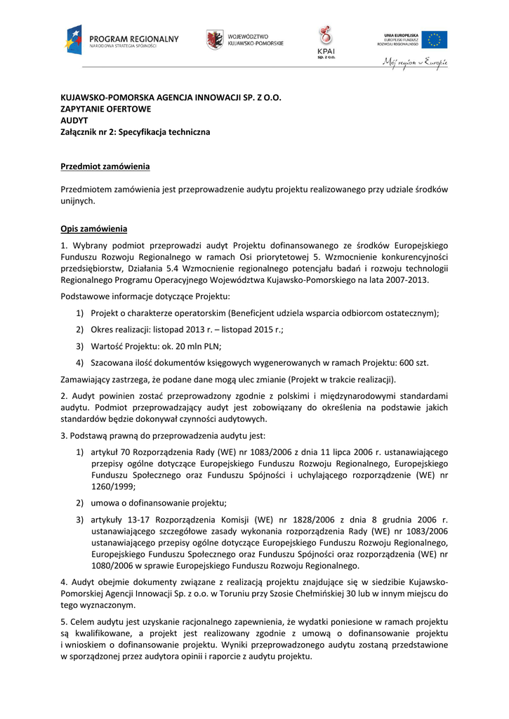 KUJAWSKO-POMORSKA AGENCJA INNOWACJI SP. Z O.O. ZAPYTANIE OFERTOWE AUDYT Załącznik nr 2: Specyfikacja techniczna Przedmiot zamówienia Przedmiotem zamówienia jest przeprowadzenie audytu projektu realizowanego przy udziale środków unijnych. Opis zamówienia 1. Wybrany podmiot przeprowadzi audyt Projektu dofinansowanego ze środków Europejskiego Funduszu Rozwoju Regionalnego w ramach Osi priorytetowej 5. Wzmocnienie konkurencyjności przedsiębiorstw, Działania 5.4 Wzmocnienie regionalnego potencjału badań i rozwoju technologii Regionalnego Programu Operacyjnego Województwa Kujawsko-Pomorskiego na lata 2007-2013. Podstawowe informacje dotyczące Projektu: 1) Projekt o charakterze operatorskim (Beneficjent udziela wsparcia odbiorcom ostatecznym); 2) Okres realizacji: listopad 2013 r. – listopad 2015 r.; 3) Wartość Projektu: ok. 20 mln PLN; 4) Szacowana ilość dokumentów księgowych wygenerowanych w ramach Projektu: 600 szt. Zamawiający zastrzega, że podane dane mogą ulec zmianie (Projekt w trakcie realizacji). 2. Audyt powinien zostać przeprowadzony zgodnie z polskimi i międzynarodowymi standardami audytu. Podmiot przeprowadzający audyt jest zobowiązany do określenia na podstawie jakich standardów będzie dokonywał czynności audytowych. 3. Podstawą prawną do przeprowadzenia audytu jest: 1) artykuł 70 Rozporządzenia Rady (WE) nr 1083/2006 z dnia 11 lipca 2006 r. ustanawiającego przepisy ogólne dotyczące Europejskiego Funduszu Rozwoju Regionalnego, Europejskiego Funduszu Społecznego oraz Funduszu Spójności i uchylającego rozporządzenie (WE) nr 1260/1999; 2) umowa o dofinansowanie projektu; 3) artykuły 13-17 Rozporządzenia Komisji (WE) nr 1828/2006 z dnia 8 grudnia 2006 r. ustanawiającego szczegółowe zasady wykonania rozporządzenia Rady (WE) nr 1083/2006 ustanawiającego przepisy ogólne dotyczące Europejskiego Funduszu Rozwoju Regionalnego, Europejskiego Funduszu Społecznego oraz Funduszu Spójności oraz rozporządzenia (WE) nr 1080/2006 w sprawie Europejskiego Funduszu Rozwoju Regionalnego. 4. Audyt obejmie dokumenty związane z realizacją projektu znajdujące się w siedzibie KujawskoPomorskiej Agencji Innowacji Sp. z o.o. w Toruniu przy Szosie Chełmińskiej 30 lub w innym miejscu do tego wyznaczonym. 5. Celem audytu jest uzyskanie racjonalnego zapewnienia, że wydatki poniesione w ramach projektu są kwalifikowane, a projekt jest realizowany zgodnie z umową o dofinansowanie projektu i wnioskiem o dofinansowanie projektu. Wyniki przeprowadzonego audytu zostaną przedstawione w sporządzonej przez audytora opinii i raporcie z audytu projektu. 6. Audytorzy sprawdzą, czy Projekt jest realizowany zgodnie z umową i wnioskiem o dofinansowanie projektu poprzez m.in. zweryfikowanie, czy wnioski o płatność są zgodne z wymaganiami zawartymi w umowie o dofinansowanie projektu, czy są one poparte odpowiednimi dokumentami finansowymi, czy poniesione wydatki zostały rzeczywiście poniesione i czy można uznać je za wydatki kwalifikowalne. Powyższe czynności dokonywane będą na podstawie ksiąg rachunkowych i dowodów księgowych (stanowiących podstawę dokonania w nich zapisów) oraz na podstawie dokumentów stanowiących zestawienie poniesionych wydatków w projekcie (wnioski o płatność wraz ze wszystkimi załącznikami), które powinny odpowiadać we wszystkich istotnych aspektach wymogom programu oraz prawidłowo, rzetelnie i jasno przedstawiać sytuację finansową i majątkową projektu według stanu na dzień sporządzenia ww. dokumentu. Ponadto audytorzy zbadają, czy system kontroli wewnętrznej Beneficjenta zapewnia, że ponoszone wydatki są kwalifikowane oraz rzetelnie przedstawione we wnioskach o płatność. 7. Audyt obejmie sprawdzenie: 1) czy Beneficjent realizuje projekt zgodnie z umową i wnioskiem o dofinansowanie oraz z obowiązującymi przepisami prawa, w tym m.in. z: a) Rozporządzeniem Rady (WE) nr 1083/2006 z dnia 11 lipca 2006 r. ustanawiającym przepisy ogólne dotyczące Europejskiego Funduszu Rozwoju Regionalnego, Europejskiego Funduszu Społecznego oraz Funduszu Spójności i uchylającym rozporządzenie nr 1260/1999, b) Rozporządzeniem (WE) nr 1081/2006 Parlamentu Europejskiego i Rady z dnia 5 lipca 2006 r. w sprawie Europejskiego Funduszu Rozwoju Regionalnego i uchylającym rozporządzenie (WE) nr 1783/1999, c) Rozporządzeniem Komisji (WE) nr 1828/2006 z dnia 8 grudnia 2006 r. ustanawiającym szczegółowe zasady wykonania rozporządzenia Rady (WE) nr 1083/2006 ustanawiającego przepisy ogólne dotyczące Europejskiego Funduszu Rozwoju Regionalnego, Europejskiego Funduszu Społecznego oraz Funduszu Spójności oraz rozporządzenia (WE) nr 1080/2006 w sprawie Europejskiego Funduszu Rozwoju Regionalnego, d) ustawą z dnia 6 grudnia 2006 r. o zasadach prowadzenia polityki rozwoju (Dz. U. z 2009 Nr 84, poz. 712 z późn. zm.), e) ustawą z dnia 29 stycznia 2004 r. Prawo zamówień publicznych (tj. Dz. U. z 2010 r. Nr 113, poz. 759 z późn. zm.), f) ustawą z dnia 29 września 1994 r. o rachunkowości (Dz. U. z 2009 Nr 152, poz. 1223 z późn. zm.) oraz z: g) Regionalnym Programem Operacyjnym Województwa Kujawsko-Pomorskiego na lata 20072013 przyjętym Uchwałą Nr 70/892/07 przez Zarząd Województwa Kujawsko-Pomorskiego z dnia 23 października 2007 r. z późniejszymi zmianami, h) Szczegółowym Opisem Priorytetów Regionalnego Programu Operacyjnego Województwa Kujawsko-Pomorskiego na lata 2007-2013 przyjętym Uchwałą Nr 16/170/09 Zarządu Województwa Kujawsko-Pomorskiego z dnia 26 lutego 2009 r. z późn. zm., i) wytycznymi Instytucji Zarządzającej Regionalnym Programem Operacyjnym Województwa Kujawsko-Pomorskiego na lata 2007-2013; 2) czy procedury kontroli wewnętrznej Beneficjenta zapewniają prawidłowość realizacji projektu, rzetelność wniosków o płatność, oraz że ponoszone wydatki są kwalifikowane; 3) czy Beneficjent posiada odpowiednie procedury finansowo-księgowe oraz procedury doty