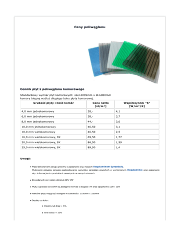 CENNIK Płyty poliwęglanowe komorowe oraz lite - Eskade