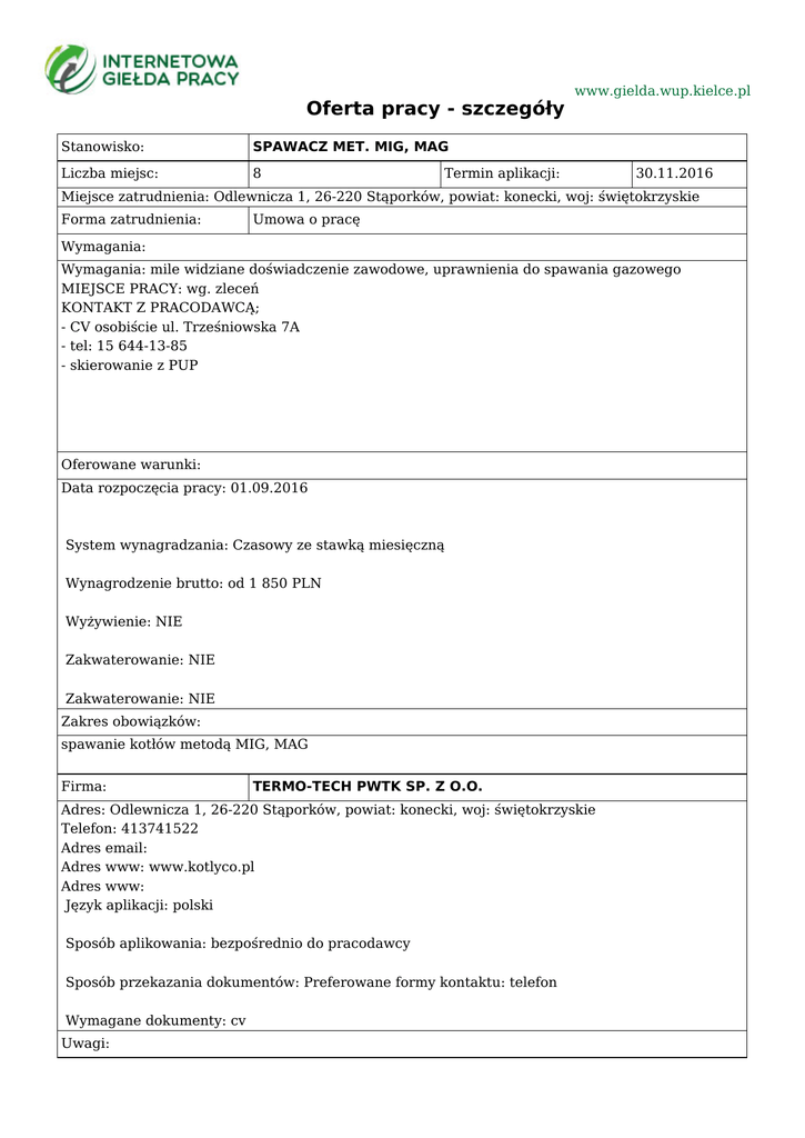 Oferta pracy - szczegóły Stanowisko: SPAWACZ MET. MIG, MAG Liczba miejsc: 8 www.gielda.wup.kielce.pl Termin aplikacji: 30.11.2016 Miejsce zatrudnienia: Odlewnicza 1, 26-220 Stąporków, powiat: konecki, woj: świętokrzyskie Forma zatrudnienia: Umowa o pracę Wymagania: Wymagania: mile widziane doświadczenie zawodowe, uprawnienia do spawania gazowego MIEJSCE PRACY: wg. zleceń KONTAKT Z PRACODAWCĄ; - CV osobiście ul. Trześniowska 7A - tel: 15 644-13-85 - skierowanie z PUP Oferowane warunki: Data rozpoczęcia pracy: 01.09.2016 System wynagradzania: Czasowy ze stawką miesięczną Wynagrodzenie brutto: od 1 850 PLN Wyżywienie: NIE Zakwaterowanie: NIE Zakwaterowanie: NIE Zakres obowiązków: spawanie kotłów metodą MIG, MAG Firma: TERMO-TECH PWTK SP. Z O.O. Adres: Odlewnicza 1, 26-220 Stąporków, powiat: konecki, woj: świętokrzyskie Telefon: 413741522 Adres email: Adres www: www.kotlyco.pl Adres www: Język aplikacji: polski Sposób aplikowania: bezpośrednio do pracodawcy Sposób przekazania dokumentów: Preferowane formy kontaktu: telefon Wymagane dokumenty: cv Uwagi: Identyfikator oferty: StPr/16/2193 Instytucja koordynująca ofertę: Powiatowy Urząd Pracy w Końskich Urząd Pracy dokłada wszelkich starań, aby oferty pracy będące w zasobach urzędu, były rzetelne i wiarygodne. Ponieważ wszystkie oferty pracy pochodzą od osób trzecich Urząd Pracy zastrzega, że odpowiedzialność za ewentualne rozbieżności pomiędzy warunkami pracy zaprezentowanymi w niniejszej ofercie a warunkami zaproponowanymi przez potencjalnego pracodawcę ponosi pracodawca.