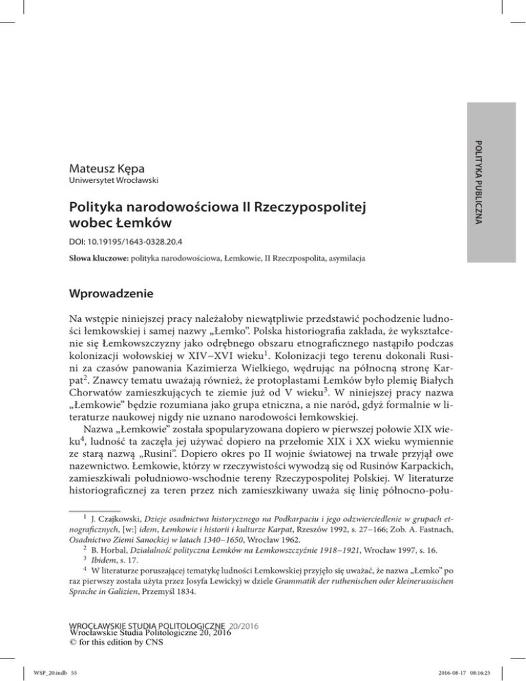 POLITYKA PUBLICZNA Mateusz Kępa Uniwersytet Wrocławski Polityka narodowościowa II Rzeczypospolitej wobec Łemków DOI: 10.19195/1643-0328.20.4 Słowa kluczowe: polityka narodowościowa, Łemkowie, II Rzeczpospolita, asymilacja Wprowadzenie Na wstępie niniejszej pracy należałoby niewątpliwie przedstawić pochodzenie ludności łemkowskiej i samej nazwy „Łemko”. Polska historiografia zakłada, że wykształcenie się Łemkowszczyzny jako odrębnego obszaru etnograficznego nastąpiło podczas kolonizacji wołowskiej w XIV−XVI wieku1. Kolonizacji tego terenu dokonali Rusini za czasów panowania Kazimierza Wielkiego, wędrując na północną stronę Karpat2. Znawcy tematu uważają również, że protoplastami Łemków było plemię Białych Chorwatów zamieszkujących te ziemie już od V wieku3. W niniejszej pracy nazwa „Łemkowie” będzie rozumiana jako grupa etniczna, a nie naród, gdyż formalnie w literaturze naukowej nigdy nie uznano narodowości łemkowskiej. Nazwa „Łemkowie” została spopularyzowana dopiero w pierwszej połowie XIX wieku4, ludność ta zaczęła jej używać dopiero na przełomie XIX i XX wieku wymiennie ze starą nazwą „Rusini”. Dopiero okres po II wojnie światowej na trwałe przyjął owe nazewnictwo. Łemkowie, którzy w rzeczywistości wywodzą się od Rusinów Karpackich, zamieszkiwali południowo-wschodnie tereny Rzeczypospolitej Polskiej. W literaturze historiograficznej za teren przez nich zamieszkiwany uważa się linię północno-połu1 J. Czajkowski, Dzieje osadnictwa historycznego na Podkarpaciu i jego odzwierciedlenie w grupach etnograficznych, [w:] idem, Łemkowie i historii i kulturze Karpat, Rzeszów 1992, s. 27−166; Zob. A. Fastnach, Osadnictwo Ziemi Sanockiej w latach 1340−1650, Wrocław 1962. 2 B. Horbal, Działalność polityczna Łemków na Łemkowszczyźnie 1918−1921, Wrocław 1997, s. 16. 3 Ibidem, s. 17. 4 W literaturze poruszającej tematykę ludności Łemkowskiej przyjęło się uważać, że nazwa „Łemko” po raz pierwszy została użyta przez Josyfa Lewickyj w dziele Grammatik der ruthenischen oder kleinerussischen Sprache in Galizien, Przemyśl 1834. WROCŁAWSKIE STUDIA POLITOLOGICZNE 20/2016 Wrocławskie Studia Politologiczne 20, 2016 © for this edition by CNS WSP_20 indb 55 2016-08-17 08:16:25 POLITYKA PUBLICZNA 56 Mateusz Kępa dniową łączącą Rymanów z Sanokiem oraz obszar od zachodniej strony rzeki Poprad, aż do pasma Wielkiego Działu leżącego na wschodzie5. Wart podkreślenia w kontekście tematyki niniejszej pracy jest fakt, że w okresie II Rzeczypospolitej Łemkowszczyznę zamieszkiwało około 150 tys. Łemków rozlokowanych w około 250 wsiach6. Na mocy ustaleń zawartych w traktacie wersalskim z 1919 roku oraz traktatu pokojowego z Austrią zawartego w Saint-Germain-en-Laye w tym samym roku Rada Ambasadorów zaaprobowała wschodnie granice, jakie miały być przyznane Rzeczypospolitej na mocy traktatu ryskiego z 1921 roku7. Postanowienie to zostało entuzjastycznie przyjęte przez polskie władze, aczkolwiek wynikły również obawy, które dotyczyły możliwości upomnienia się narodu ukraińskiego o swoje utracone ziemie i wniesienia interpelacji do Ligi Narodów. Warto zauważyć, że polityka rządu przedsanacyjnego dzięki wprowadzeniu pewnych rozwiązań prawnych ukształtowała relacje polsko-ukraińskie aż do wybuchu II wojny światowej. Podstawowe założenia tych regulacji prawnych to przede wszystkim zapewnienie trwałości posiadania ziem przyznanych na mocy wspomnianych traktatów. Osiągnięcie tego celu miało nastąpić poprzez kolonizację wojskową8, wzrost znaczenia Kościoła rzymskokatolickiego na ziemiach wschodnich kraju oraz rozwój szkolnictwa w duchu polskim9. Dwie koncepcje Kwestię ukraińską podjął ówczesny premier RP Władysław Sikorski, który skonkretyzował ją w swoim programie politycznym składającym się z dwóch dokumentów wydanych w marcu i kwietniu 1923 roku. Owe dokumenty, czyli odezwa do obywateli kresów wschodnich oraz tajne opracowanie w sprawie zaleceń polityki rządu na kresach10 zakładały normalizację i zrównoważenie stosunków polsko-ukraińskich poprzez zjednoczenie na stałe kresów z ojczystą krainą, co w efekcie miało doprowadzić do asymilacji narodu ukraińskiego11. Premier Sikorski dodatkowo postulował inicjatywę regionalizmu, która miała polegać na uwzględnieniu odmienności kulturowej i religijnej Ukraińców. Poprzez wynajdywanie określonych grup społecznych będących lojalnymi wobec władzy RP postulował utworzenie „ukraińskiej partii ugodowej”12. Władysław Sikorski słusznie twierdził, że po zapadłej decyzji Rady Ambasadorów, środowiska ukraińskie będą próbowały dążyć, współmiernie do władz polskich, do osiągnięcia porozumienia 5 B. Horbal, op. cit., s. 13−14. Ibidem, s. 14. 7 Zob. R. Torzecki, Kwestia ukraińska w Polsce w latach 1923−1929, Kraków 1989, s. 20−31. 8 Zob. T. Böhm, Osadnictwo wojskowe na Kresach Wschodnich w II Rzeczypospolitej, „Dzieje Najnowsze” 1992, z. 1−2, s. 3−12. 9 J. Lewandowski, Konflikt polsko-ukraiński na tle konfliktów narodowych w Europie środkowo-wschodniej w XIX i XX w., „Warszawskie Zeszyty Ukrainoznawcze” 1994, z. 2, s. 84. 10 R. Torzecki, op. cit., s. 21. 11 Ibidem, s. 23. 12 Ibidem, s. 25. 6 Wrocławskie Studia Politologiczne 20, 2016 © for this edition by CNS WSP_20 indb 56 2016-08-17 08:16:25 Polityka narodowościowa II Rzeczypospolitej wobec Łemków 57 POLITYKA PUBLICZNA zapewniającego pewną stabilizację między obydwoma narodami. Wobec przedstawianych założeń doszło do zapoczątkowania kontaktów ze stronnictwami opowiadającymi się za rządami Moskwy13. Proponowana przez premiera Sikorskiego droga polityki narodowościowej wobec ukraińskiej zaczęła tracić na znaczeniu w wyniku rozrastającego się wpływu stronnictw prawicowych w państwie. Już 25 stycznia 1924 roku minister spraw wewnętr