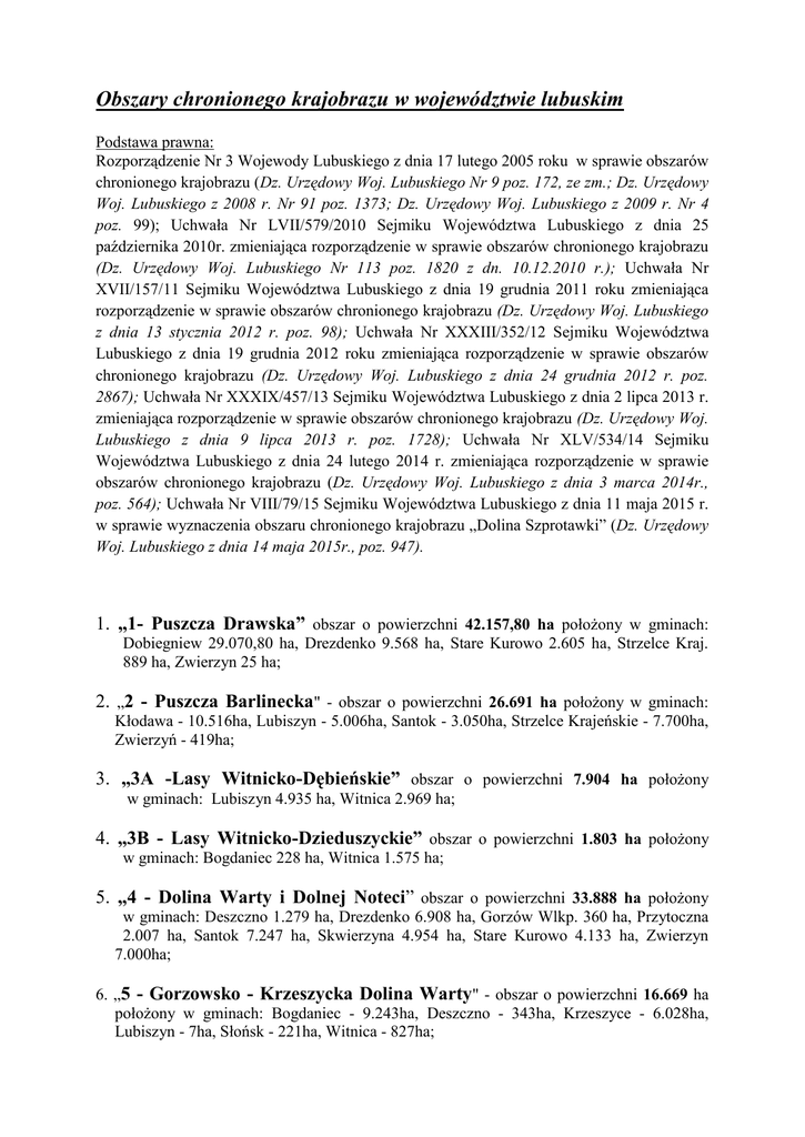 Obszary chronionego krajobrazu w województwie lubuskim Podstawa prawna: Rozporządzenie Nr 3 Wojewody Lubuskiego z dnia 17 lutego 2005 roku w sprawie obszarów chronionego krajobrazu (Dz. Urzędowy Woj. Lubuskiego Nr 9 poz. 172, ze zm.; Dz. Urzędowy Woj. Lubuskiego z 2008 r. Nr 91 poz. 1373; Dz. Urzędowy Woj. Lubuskiego z 2009 r. Nr 4 poz. 99); Uchwała Nr LVII/579/2010 Sejmiku Województwa Lubuskiego z dnia 25 października 2010r. zmieniająca rozporządzenie w sprawie obszarów chronionego krajobrazu (Dz. Urzędowy Woj. Lubuskiego Nr 113 poz. 1820 z dn. 10.12.2010 r.); Uchwała Nr XVII/157/11 Sejmiku Województwa Lubuskiego z dnia 19 grudnia 2011 roku zmieniająca rozporządzenie w sprawie obszarów chronionego krajobrazu (Dz. Urzędowy Woj. Lubuskiego z dnia 13 stycznia 2012 r. poz. 98); Uchwała Nr XXXIII/352/12 Sejmiku Województwa Lubuskiego z dnia 19 grudnia 2012 roku zmieniająca rozporządzenie w sprawie obszarów chronionego krajobrazu (Dz. Urzędowy Woj. Lubuskiego z dnia 24 grudnia 2012 r. poz. 2867); Uchwała Nr XXXIX/457/13 Sejmiku Województwa Lubuskiego z dnia 2 lipca 2013 r. zmieniająca rozporządzenie w sprawie obszarów chronionego krajobrazu (Dz. Urzędowy Woj. Lubuskiego z dnia 9 lipca 2013 r. poz. 1728); Uchwała Nr XLV/534/14 Sejmiku Województwa Lubuskiego z dnia 24 lutego 2014 r. zmieniająca rozporządzenie w sprawie obszarów chronionego krajobrazu (Dz. Urzędowy Woj. Lubuskiego z dnia 3 marca 2014r., poz. 564); Uchwała Nr VIII/79/15 Sejmiku Województwa Lubuskiego z dnia 11 maja 2015 r. w sprawie wyznaczenia obszaru chronionego krajobrazu „Dolina Szprotawki” (Dz. Urzędowy Woj. Lubuskiego z dnia 14 maja 2015r., poz. 947). 1. „1- Puszcza Drawska” obszar o powierzchni 42.157,80 ha położony w gminach: Dobiegniew 29.070,80 ha, Drezdenko 9.568 ha, Stare Kurowo 2.605 ha, Strzelce Kraj. 889 ha, Zwierzyn 25 ha; 2. „2 - Puszcza Barlinecka" - obszar o powierzchni 26.691 ha położony w gminach: Kłodawa - 10.516ha, Lubiszyn - 5.006ha, Santok - 3.050ha, Strzelce Krajeńskie - 7.700ha, Zwierzyń - 419ha; 3. „3A -Lasy Witnicko-Dębieńskie” obszar o powierzchni 7.904 ha położony w gminach: Lubiszyn 4.935 ha, Witnica 2.969 ha; 4. „3B - Lasy Witnicko-Dzieduszyckie” obszar o powierzchni 1.803 ha położony w gminach: Bogdaniec 228 ha, Witnica 1.575 ha; 5. „4 - Dolina Warty i Dolnej Noteci” obszar o powierzchni 33.888 ha położony w gminach: Deszczno 1.279 ha, Drezdenko 6.908 ha, Gorzów Wlkp. 360 ha, Przytoczna 2.007 ha, Santok 7.247 ha, Skwierzyna 4.954 ha, Stare Kurowo 4.133 ha, Zwierzyn 7.000ha; 6. „5 - Gorzowsko - Krzeszycka Dolina Warty" - obszar o powierzchni 16.669 ha położony w gminach: Bogdaniec - 9.243ha, Deszczno - 343ha, Krzeszyce - 6.028ha, Lubiszyn - 7ha, Słońsk - 221ha, Witnica - 827ha; 7. „6 - Pojezierze Puszczy Noteckiej” obszar o powierzchni 12.000 ha położony w gminie Drezdenko; 8. „7 - Gorzycko” obszar o powierzchni 8.720 ha położony w gminach: Przytoczna 1.030 ha, Pszczew 7.690 ha; 9. „8A-Dolina Obry” obszar o powierzchni 10.092 ha położony w gminach: Bledzew 4.834 ha, Międzyrzecz 4.769 ha, Pszczew 357 ha, Skwierzyna 132 ha; 10. „8B-Dolina Jeziornej Strugi” obszar o powierzchni 5.708 ha położony w gminach: Łagów 48 ha, Sulęcin 5.000 ha, Międzyrzecz 160 ha, Bledzew 500 ha; 11.„9-Pojezierze Lubniewicko-Sulęcińskie” obszar o powierzchni 14.917 ha położony w gminach: Bledzew 326 ha, Krzeszyce 708 ha, Lubniewice 6.617 ha, Sulęcin 6.166 ha, Torzym 977 ha, Łagów 123 ha; 12. „10-Dolina Postomii” obszar o powierzchni 2.457,35 ha położony w gminach: Krzeszyce 1.160,35 ha, Sulęcin 1.297 ha; 13. „11A-Ośniańska Rynna z Jeziorem Radachowskim” obszar o powierzchni 2.223 ha położony w gminach: Ośno Lub. 150 ha, Słońsk 2.073 ha; 14. „11B-Ośnieńska Rynna z Jeziorem Busko” obszar o powierzchni 2.145 ha położony w gminach: Ośno Lub. 1.972 ha, Rzepin 173 ha; 15. „12-Zbąszyńska Dolina Obry” obszar o powierzchni 1.050 ha położony w gminie Trzciel; 16. „13-Rynna Paklicy i Ołoboku” obszar o powierzchni 20.505,30 ha położony w gminach: Czerwieńsk 641 ha, Świebodzin 5.445,30 ha, Lubrza 5.520 ha, Międzyrzecz 4.842 ha, Skąpe 4.057 ha; 17. „14-Dolina Ilanki” obszar o powierzchni 7.864 ha położony w gminach: Cybinka 1.138ha, Rzepin 2.421 ha, Słubice 136 ha, Torzym 4.169 ha; 18. „15-Słubicka Dolina Odry” obszar o powierzchni 14.075 ha położony w gminach: Cybinka 4.673 ha, Słubice 9.174 ha, Górzyca 228 ha; 19. „16-Puszcza nad Pliszką” obszar o powierzchni 32.244 ha położony w gminach: Cybinka 6.359 ha, Bytnica 900 ha, Maszewo 4.200 ha, Skąpe 136 ha, Torzym 12.633 ha, Łagów 8.016 ha; 20. „17-Rynny Obrzycko-Obrzańskie” obszar o powierzchni 23.375 ha położony w gminach: Babimost 2.169 ha, Bojadła 4.695 ha, Świebodzin 446 ha, Kargowa 4.242 ha, Kolsko 2.889 ha, Międzyrzecz 500 ha, Nowa Sól 831 ha, Sulechów 1.561 ha, Szczaniec 2.355 ha, Trzciel 925 ha, Trzebiechów 1.403 ha, Zbąszynek 1.359 ha; 21. „18-Krośnieńska Dolina Odry” obszar o powierzchni 13.265 ha położony w gminach: Czerwieńsk 4.578 ha, Gubin 49 ha, Krosno Odrz. 4.225 ha, Sulechów 2.550 ha, Zielona Góra 1.863 ha; 22. „19-Gubińskie Mokradła” obszar o powierzchni 1.884 ha położony w gminie Gubin; 23. „20-Pojezierze Sławsko-Przemęckie” obszar o powierzchni 16.737 ha położony w gminach: Kolsko 1.541 ha, Nowa Sól 1.659 ha, Sława 9.801 ha, Wschowa 3.736 ha; 24. „21-Nowosolska Dolina Odry” obszar o powierzchni 9.852 ha położony w gminach: Bojadła 1.727 ha, Nowa Sól 2.985 ha, Siedlisko 380 ha, Otyń 271 ha, Sulechów 287 ha, Trzebiechów 1.133 ha, Zabór 2.771 ha, Zielona Góra 298 ha; 25. „22-Wzniesienia Zielonogórskie” obszar o powierzchni 3.573 ha położony w gminie Świdnica; 26. „23-Dolina Śląskiej Ochli” obszar o powierzchni 10.350 ha położony w gminach: Świdnica 2.996 ha, Kożuchów 452 ha, Nowogród Bobrzański 123 ha, Ot