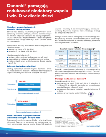 dla zdrowia Danonki® pomagają Żywność redukować niedobory wapnia i wit. D w diecie dzieci Niedobory wapnia i witaminy D stanowią istotny problem Zdrowa dieta dziecka, rozumiana jako prawidłowo skomponowany codzienny jadłospis, powinna zawierać wszystkie składniki odżywcze niezbędne dla rozwoju organizmu. W 2007 roku wraz z Instytutem Matki i Dziecka przeprowadzono badanie, którego celem była ocena sposobu żywienia czterolatków. Wyniki badań pokazały, że w dietach dzieci istnieją znaczące niedobory, w tym: wapnia – w diecie u 50,5% dzieci, witaminy D – w diecie u 98,5% dzieci. Niedobór wapnia i witaminy D: wpływa niekorzystnie na budowę oraz rozwój kości, prowadzi do zmniejszania gęstości mineralnej kośćca, może wystąpić nawet u dzieci pozornie dobrze rozwijających się. Zalecenia żywieniowe dla dzieci wiek Według najnowszych zaleceń Instytutu Żywności i Żywienia należy zapewnić dzieciom i młodzieży dzienne spożycie wapnia i witaminy D w ilościach zależnych od wieku. WAPŃ 500 – 1300 mg Od 11 do 18 lat 1300 mg Dzienne zapotrzebowanie na wapń wiek Dlatego właśnie bardzo ważną rolę w diecie spełniają mleko i produkty mleczne, uznawane za najlepsze źródło wapnia. Jednak nie wszystkie te produkty zawierają jednakowe ilości tego składnika. (Tabela 1.) Tabela 1. Zawartość wapnia i witaminy D w jednej porcji[2] Produkt Wielkość porcji Wapń (mg) Witamina D (µg) Mleko szklanka 200 ml 236 0,06 Jogurt pojemniczek 150 g 255 0,05 Jaja gotowane 1 sztuka 50 g 21 0,74 Masło na 1 kromce 10 g 8 0,07 serek Danonki®³ 2 kubeczki 100 g 180 1,25 Danonki® zawierają wapń i witaminę D, które są potrzebne dla prawidłowego wzrostu i rozwoju kości u dzieci. Danonki® powinny stanowić element wartościowego, zbilansowanego jadłospisu. Dlaczego warto polecać Danonki®? Od 1 do 10 lat Od 1 do 18 lat wapnia i witaminy D jest niewystarczające, proces prowadzący do poboru wapnia z kości powoduje, że stają się one porowate i słabe[¹]. Danonki to serki dla dzieci: wzbogacone w wapń (180 mg/100 g) i witaminę D (1,25 µg/100 g), składniki niezbędne do prawidłowego rozwoju i budowy zdrowych kości, pomagające eliminować niedobory wapnia i witaminy D w diecie, polecane przez Instytut Matki i Dziecka. WITAMINA D 5 µg (200 IU) Dzienne zapotrzebowanie na witaminę D Wapń i witamina D sprzymierzeńcami w budowie zdrowych i mocnych kości Odpowiednie spożycie wapnia, białka i witaminy D oraz aktywność fizyczna są uznawane za podstawowy element optymalnego rozwoju kości u dzieci. Gdy spożycie 22 Piśmiennictwo [1] Fifth International Conference on Children’s Bone Health, 24 czerwiec 2009, Cambridge, Wielka Brytania [2] Nadolna I., Przygoda B., Troszyńska A., Kunachowicz H.: Tabela wartości odżywczej produktów spożywczych. Witaminy. Praca IŻŻ 99, Warszawa 2000 [3] Produkt wzbogacony w wapń i witaminę D www.danonki.pl