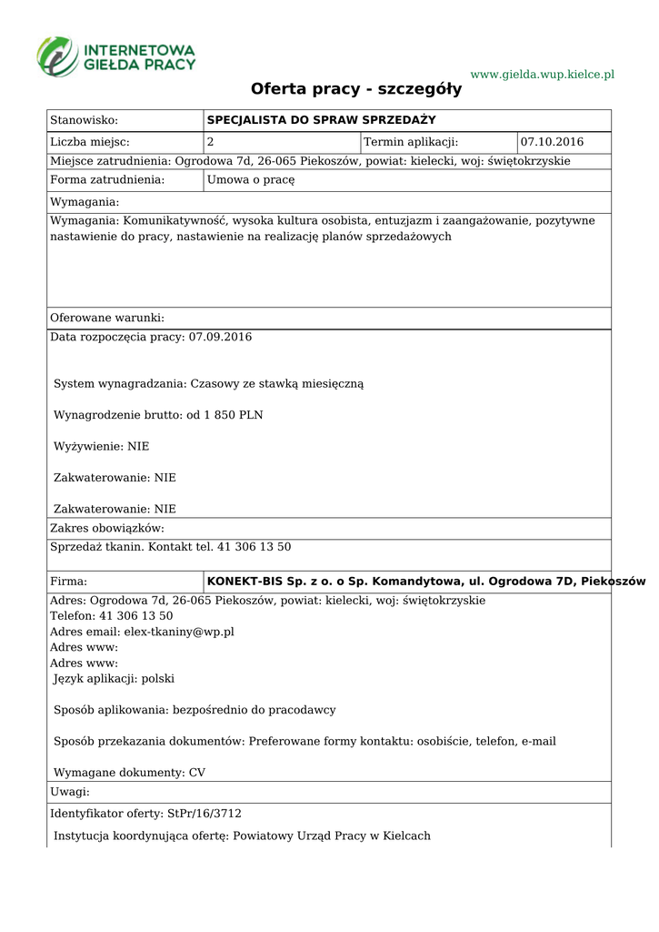 Oferta pracy - szczegóły Stanowisko: SPECJALISTA DO SPRAW SPRZEDAŻY Liczba miejsc: 2 www.gielda.wup.kielce.pl Termin aplikacji: 07.10.2016 Miejsce zatrudnienia: Ogrodowa 7d, 26-065 Piekoszów, powiat: kielecki, woj: świętokrzyskie Forma zatrudnienia: Umowa o pracę Wymagania: Wymagania: Komunikatywność, wysoka kultura osobista, entuzjazm i zaangażowanie, pozytywne nastawienie do pracy, nastawienie na realizację planów sprzedażowych Oferowane warunki: Data rozpoczęcia pracy: 07.09.2016 System wynagradzania: Czasowy ze stawką miesięczną Wynagrodzenie brutto: od 1 850 PLN Wyżywienie: NIE Zakwaterowanie: NIE Zakwaterowanie: NIE Zakres obowiązków: Sprzedaż tkanin. Kontakt tel. 41 306 13 50 Firma: KONEKT-BIS Sp. z o. o Sp. Komandytowa, ul. Ogrodowa 7D, Piekoszów Adres: Ogrodowa 7d, 26-065 Piekoszów, powiat: kielecki, woj: świętokrzyskie Telefon: 41 306 13 50 Adres email: [email protected] Adres www: Adres www: Język aplikacji: polski Sposób aplikowania: bezpośrednio do pracodawcy Sposób przekazania dokumentów: Preferowane formy kontaktu: osobiście, telefon, e-mail Wymagane dokumenty: CV Uwagi: Identyfikator oferty: StPr/16/3712 Instytucja koordynująca ofertę: Powiatowy Urząd Pracy w Kielcach Urząd Pracy dokłada wszelkich starań, aby oferty pracy będące w zasobach urzędu, były rzetelne i wiarygodne. Ponieważ wszystkie oferty pracy pochodzą od osób trzecich Urząd Pracy zastrzega, że odpowiedzialność za ewentualne rozbieżności pomiędzy warunkami pracy zaprezentowanymi w niniejszej ofercie a warunkami zaproponowanymi przez potencjalnego pracodawcę ponosi pracodawca.