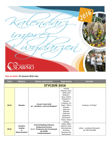 Stan na dzień: 22 sierpnia 2016 roku Data Miejsce Nazwa wydarzenia Organizator Kontakt STYCZEŃ 2016 06.01 Sławsko Orszak Trzech Króli pn. „Chodźcie z nami do Betlejem” 09.01 świetlica wiejska w Bobrowiczkach 24 Finał Wielkiej Orkiestry Świątecznej Pomocy 4 x 4 – Przeprawa Aut Terenowych dla WOŚP w Bobrowiczkach Parafia Sławsko, Stow. „Moja wieś Sławsko”, Stow. Kobiet Wiejskich w Sławsku, Fundacja „Po Piąte”, OSP w Sławsku, Sołectwo Sławsko, Sołectwo Radosław, Staniewice, Tokary, Skauci Europy Sołtys, Rada Sołecka, Stow. Mieszkańców Na Rzecz Rozwoju Wsi Bobrowiczki Fundacja „Po Piąte” sołtys – Jarosław Ostrowski, tel. 601-676-688 Data 20.01 godz. 10.00 21.01 godz.11.00 21.01 godz. 11.30 22.01 godz. 10.00 22.01 godz.11.00 22.01 22.01 Miejsce Filia Przedszkola Gminnego w Boleszewie Filia Przedszkola Gminnego w Sławsku świetlica wiejska we Wrześnicy świetlica wiejska w Sławsku Przedszkole Gminne w Gwiazdowie świetlica wiejska w Janiewicach SP w Bobrowicach 23.01 godz. 16.00 świetlica wiejska we Wrześnicy 23.01 godz. 16.00 świetlica wiejska w Tychowie 23.01 świetlica wiejska w Brześciu 28.01. godz. 10.00 29.01 godz. 9.00 29.01 godz. 10.00 29.01 godz. 15.00 29.01 godz. 17.00 29.01 29.01 29.01 29.01 Filia Przedszkola Gminnego w Sławsku Filia Przedszkola Gminnego w Boleszewie Przedszkole Gminne w Gwiazdowie Nazwa wydarzenia Cała nasza gromadka kocha babcię i dziadka – Dzień Babci i Dziadka Cała nasza gromadka kocha babcię i dziadka – Dzień Babci i Dziadka Święto Babci i Dziadka – występy artystyczne Dzień Seniora Cała nasza gromadka kocha babcię i dziadka – Dzień Babci i Dziadka Organizator Filia Przedszkola Gminnego w Boleszewie Filia Przedszkola Gminnego w Sławsku ZS Wrześnica ZS Sławsko, Rada Rodziców SP Przedszkole Gminne w Gwiazdowie tel. 500-753-102 tel. 665-914-111 [email protected] tel. 59 810-88-23 [email protected] tel./fax. 59 810-38-02 [email protected] tel. 59 858-22-20 [email protected] Dzień Babci i Dziadka oraz zabawa choinkowa dla dzieci Sołtys, Rada Sołecka sołtys – Wioletta Łysko tel. 535-417-926 Dzień Babci i Dziadka SP Bobrowice tel./fax. 59 810-33 14 [email protected] Noworoczne Spotkanie Seniorów połączone z Dniem Babci i Dziadka Sołtys, Rada Sołecka, Koło Gospodyń Wiejskich we Wrześnicy sołtys – Agnieszka Szczepaniec tel. 535-418-193 SP Warszkowo tel. 59 810 54 13 [email protected] Sołtys, Rada Sołecka sołtys – Dorota Skrobek, tel. 664-479-114 Jasełka Bożonarodzeniowe – przedstawienie dla społeczności lokalnej Zabawa choinkowa dla dzieci oraz Dzień Babci i Dzień Dziadka dla mieszkańców Brześcia ZS w Sławsku Połowinki dla klas II gimnazjum świetlica wiejska w Pomiłowie ZS we Wrzesnicy SP w Warszkowie SP w Bobrowicach Jasełka Bożonarodzeniowe – przedstawienie dla społeczności lokalnej Pomiłowa Filia Przedszkola Gminnego w Sławsku Filia Przedszkola Gminnego w Boleszewie Przedszkole Gminne w Gwiazdowie ZS Sławsko, Rada Rodziców G Świetlica Wiejska, SP Warszkowo Bal karnawałowy ZS Wrześnica Bal karnawałowy dla uczniów SP Warszkowo SP Warszkowo Dzień Babci i Dziadka SP Bobrowice Zabawa karnawałowa dla dzieci i młodzieży, uczniów Zespołu Szkół w Sławsku ZS Sławsko, Rada Rodziców SP i G ZS w Sławsku Kontakt „Dziś w przedszkolu śpiew i tańce, tańczą różne przebierańce” – bal karnawałowy „Dziś w przedszkolu śpiew i tańce, tańczą różne przebierańce” – bal karnawałowy „Dziś w przedszkolu śpiew i tańce, tańczą różne przebierańce” – bal karnawałowy tel. 665-914-111 [email protected] tel. 500-753-102 tel. 59 858-22-20 [email protected] tel./fax. 59 810-38-02 [email protected] tel. 59 810 54 13 [email protected] tel. 59 810-88-23 [email protected] tel. 59 810 54 13 [email protected] tel./fax. 59 810-33 14 [email protected] tel./fax. 59 810-38-02 [email protected] Data Miejsce Nazwa wydarzenia 30.01 świetlica wiejska w Bobrowiczkach 30.01 świetlica wiejska w Łętowie Dzień Babci i Dziadka 30.01 świetlica wiejska w Sławsku Wieczór Seniora 30.01 świetlica wiejska w Bobrowicach Zabawa karnawałowa dla dzieci i młodzieży z Bobrowic Zabawa choinkowa dla dzieci Organizator Kontakt Sołtys, Rada Sołecka, Świetlica Wiejska Sołtys, Rada Sołecka, Świetlica Wiejska Sołtys, Rada Sołecka, Stow. Kobiet Wiejskich sołtys – Karol Kruk tel. 535-418-411 opiekun świetlicy – Agnieszka Kiedrowicz tel. 59 846-10-56 Świetlica Wiejska opiekun świetlicy – Sylwia Ozdoba tel. 507-588-188 [email protected] sołtys – Jarosław Ostrowski, tel. 601-676-688 sołtys – Mariusz Krzymiński tel. 535-416-681 LUTY 2016 06.02 06.02 07.02 godz. 17.00 13.02 26.02 świetlica wiejska w Bobrowicach świetlica wiejska w Łętowie świetlica przy OSP w Starym Krakowie świetlica wiejska w Bobrowicach SP Warszkowo Zabawa karnawałowa dla dorosłych Świetlica Wiejska opiekun świetlicy – Sylwia Ozdoba tel. 507-588-188 [email protected] Zabawa karnawałowa dla dzieci Świetlica Wiejska opiekun świetlicy – Agnieszka Kiedrowicz tel. 59 846-10-56 Zabawa choinkowa Sołtys, Rada Sołecka, Świetlica Wiejska Walentynkowe spotkanie rodzinne Świetlica Wiejska Dzień patrona Szkoły Podstawowej w Warszkowie – uroczysta akademia SP Warszkowo sołtys – Mateusz Łanik tel. 663-114-994 opiekun świetlicy – o. Rafał tel. 500-125-031 opiekun świetlicy – Sylwia Ozdoba tel. 507-588-188 [email protected] tel. 59 810 54 13 [email protected] MARZEC 2016 marzec 01.03 godz. 11.00 02.03 godz. 11.00 03.03 godz. 11.00 ZS we Wrześnicy Przedszkole Gminne w Gwiazdowie Filia Przedszkola Gminnego w Sławsku Filia Przedszkola Gminnego w Boleszewie Tydzień dobrych uczynków „Baw, ucz się i rośnij z nami” – dzień otwarty przedszkola „Baw, ucz się i rośnij z nami” – dzień otwarty przedszkola „Baw, ucz się i rośnij z nami” – dzień otwarty przedszkola ZS Wrześnica Przedszkole Gminne w Gwiazdowie Filia Prz