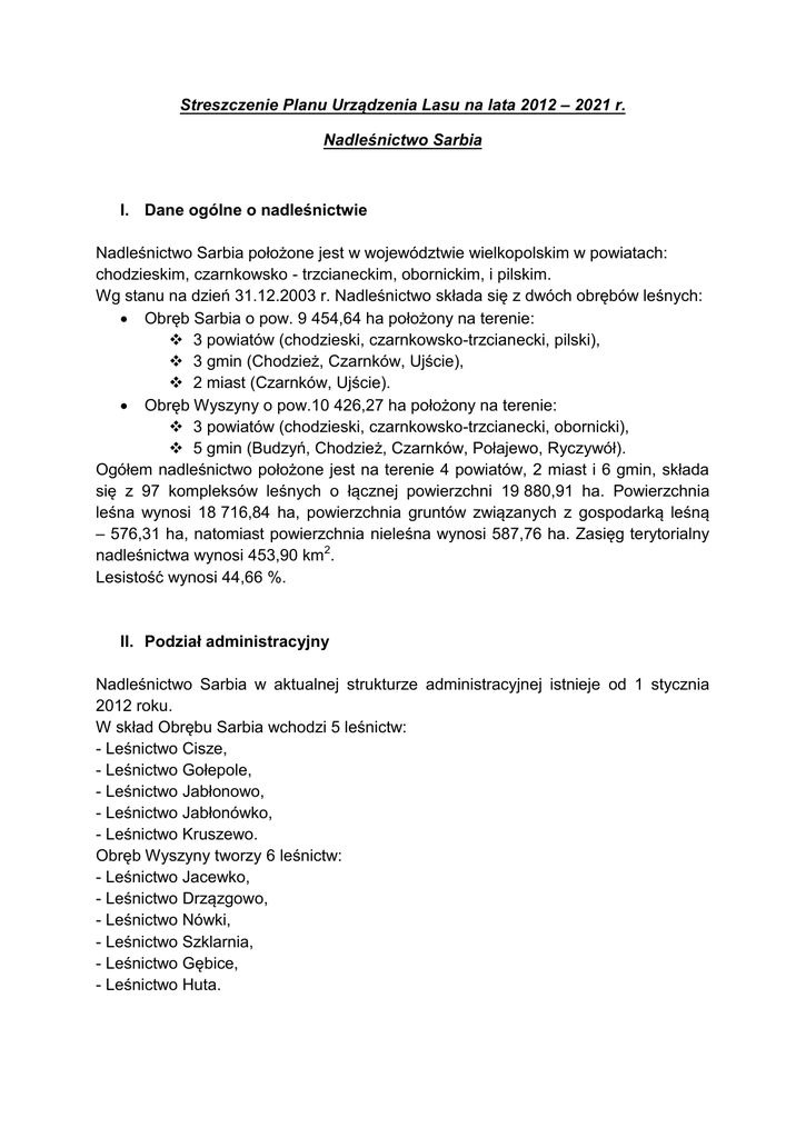 Streszczenie Planu Urządzenia Lasu na lata 2012 – 2021 r. Nadleśnictwo Sarbia I. Dane ogólne o nadleśnictwie Nadleśnictwo Sarbia położone jest w województwie wielkopolskim w powiatach: chodzieskim, czarnkowsko - trzcianeckim, obornickim, i pilskim. Wg stanu na dzień 31.12.2003 r. Nadleśnictwo składa się z dwóch obrębów leśnych: Obręb Sarbia o pow. 9 454,64 ha położony na terenie: 3 powiatów (chodzieski, czarnkowsko-trzcianecki, pilski), 3 gmin (Chodzież, Czarnków, Ujście), 2 miast (Czarnków, Ujście). Obręb Wyszyny o pow.10 426,27 ha położony na terenie: 3 powiatów (chodzieski, czarnkowsko-trzcianecki, obornicki), 5 gmin (Budzyń, Chodzież, Czarnków, Połajewo, Ryczywół). Ogółem nadleśnictwo położone jest na terenie 4 powiatów, 2 miast i 6 gmin, składa się z 97 kompleksów leśnych o łącznej powierzchni 19 880,91 ha. Powierzchnia leśna wynosi 18 716,84 ha, powierzchnia gruntów związanych z gospodarką leśną – 576,31 ha, natomiast powierzchnia nieleśna wynosi 587,76 ha. Zasięg terytorialny nadleśnictwa wynosi 453,90 km2. Lesistość wynosi 44,66 %. II. Podział administracyjny Nadleśnictwo Sarbia w aktualnej strukturze administracyjnej istnieje od 1 stycznia 2012 roku. W skład Obrębu Sarbia wchodzi 5 leśnictw: - Leśnictwo Cisze, - Leśnictwo Gołepole, - Leśnictwo Jabłonowo, - Leśnictwo Jabłonówko, - Leśnictwo Kruszewo. Obręb Wyszyny tworzy 6 leśnictw: - Leśnictwo Jacewko, - Leśnictwo Drzązgowo, - Leśnictwo Nówki, - Leśnictwo Szklarnia, - Leśnictwo Gębice, - Leśnictwo Huta. III. Charakterystyka geologiczna. Rzeźba terenu na obszarze nadleśnictwa jest wynikiem działania lodowca podczas zlodowacenia bałtyckiego stadiału poznańskiego, jak i procesów po ustąpieniu lodowca. Na terenie nadleśnictwa ciągnie się pas moreny dennej w okolicach Sarbii, Gębic, Białężyna, Huty i Brzeźna przechodzącej w okolicach Śmieszkowa w pagórkowaty teren moreny czołowej. IV. Warunki klimatyczne Nadleśnictwo Sarbia znajduje się w północno-zachodniej części XV Środkowowielkopolskiego regionu klimatycznego. Obszar ten charakteryzuje się wiatrami wiejącymi z zachodu i południowego – zachodu, a średnia prędkość wiejących wiatrów wynosi 2,8 m/s. W ostatnim dziesięcioleciu działalność wiatru spowodowała uszkodzenia w drzewostanach. W roku 2009 i 2010 dwukrotnie odnotowano ostatnie szkody spowodowane działalnością huraganów. Na obszarze Nadleśnictwa Sarbia średnia roczna suma opadów wyniosła 541 mm, a średnia roczna temperatura powietrza wyniosła 8,9°C. Długość okresu wegetacyjnego to 219 dni. V. Rejonizacja przyrodniczo – leśna Nadleśnictwo Sarbia położone jest w Krainie Wielkopolsko - Pomorskiej (III), na terenie dwóch dzielnic. Dzielnicy Kotliny Gorzowskiej (III.4) i Mezoregionu Puszczy Noteckiej oraz Dzielnicy Wielkopolsko – Kujawskiej (III.7) i Mezoregionu Pojezierza Wielkopolskiego (III.7.b) VI. Charakterystyka drzewostanów 1) Przeciętna zasobność – 232 m3/ha 2) Przeciętny wiek – 57 lat 3) Przeciętny roczny przyrost – 51,35 m3/ha 4) Charakterystyka siedlisk Lasy Nadleśnictwa Sarbia charakteryzują się następującym udziałem procentowym typów siedliskowych: - siedliska borowe – 95,2%, - siedliska lasowe – 4,3%, - olsy – 0,5%. 5) Stopień niezgodności siedlisk Powierzchnia siedlisk zniekształconych wynosi 2039,02 ha, co stanowi 10,93% powierzchni leśnej nadleśnictwa. Siedliska zdegradowane nie występują. 6) Skład gatunkowy Głównym panującym gatunkiem lasotwórczym jest sosna, która tworzy monolityczne drzewostany. Ponadto gatunkami współpanującymi lub w niewielkiej ilości panującymi są: brzoza, dąb, buk, olcha i jesion. Jest to jednak tylko kilka procent. W warunkach naturalnych nadleśnictwa najbardziej właściwe są drzewostany sosnowe z niewielkim udziałem dęba, buka, i brzozy. VII. Gospodarka leśna Podstawą prowadzenia gospodarki leśnej w bieżącym okresie jest plan urządzania lasu opracowany na okres 2012-2021 r. przez Biuro Urządzania Lasu i Geodezji Leśnej Oddział w Poznaniu. Trwałe i zróżnicowanie zagospodarowania lasu jako zarządzanie i użytkowanie terenów leśnych prowadzi się wg planu urządzania lasu, w sposób, który zapewnia utrzymanie ich różnorodności biologicznej, produktywności, zdolności regeneracyjnych, żywotności, właściwych funkcji ekologicznych, ekonomicznych i socjalnych. 1. Przyjęte wieki rębności: - Db, Js, Wz – 140 lat; - Bk – 110 lat; - So, Md, Dg, Kl, Jw – 100 lat; - Św, Brz, Ol, GB, AK – 80 lat; - Os, Ol odr – 60 lat, - Tp, Olsz, Wb – 40 lat. 2. Pozyskanie drewna Wielkość użytkowania rębnego na terenie Nadleśnictwa Sarbia jest wynikiem analizy lokalizacji cięć rębnych, uwzględniającej ład przestrzenny i czasowy oraz przyrodnicze i ekologiczne aspekty wielofunkcyjnej gospodarki leśnej. Dzięki temu prowadzona jest racjonalna i zrównoważona gospodarka leśna. Wielkość pozyskania przyjęta i zatwierdzona przez Ministra Środowiska na okres 2012-2021 wynosi: - Użytkowanie rębne – 436511m3; - Użytkowanie przedrębne – 460800m3. 4. Pielęgnowanie lasu Pielęgnowanie lasu wykonuje się stosując następujące zabiegi: - pielęgnowanie gleby, - czyszczenia wczesne, - czyszczenia późne. Pielęgnowanie gleby wykonuje się na żyźniejszych glebach, gdzie roślinność po usunięciu drzewostanu oraz w wyniku otrzymania pełnego naświetlenia bujnie się rozwija. W ramach czyszczeń wczesnych usuwa się zbędne naloty gatunków lekkonasiennych, reguluje się skład gatunkowy, równocześnie prowadzi się redukcję ilości drzew na powierzchni oraz usuwa drzewa wadliwe lub opanowane przez szkodliwe owady i grzyby. Łączna powierzchnia projektowanych czyszczeń wczesnych wynosi 2006,95 ha. Do głównych zadań czyszczeń późnych należy kształtowanie młodnika pod kątem jego właściwego składu gatunkowego i prawidłowej struktury. Należy usuwać 
