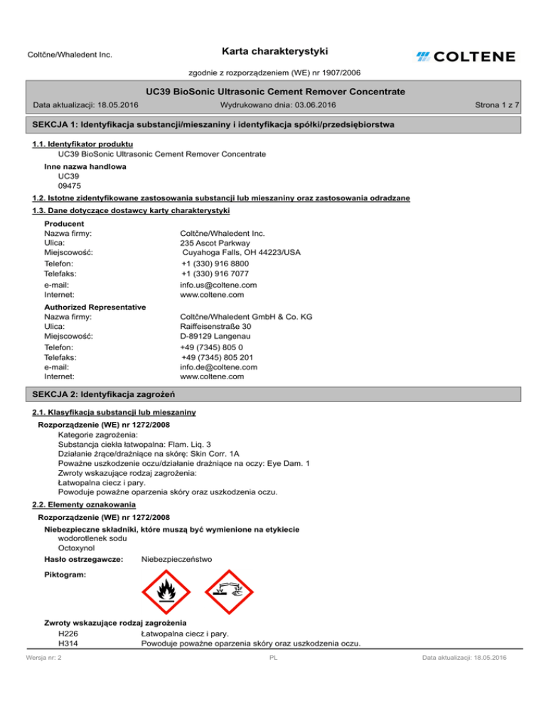 Karta charakterystyki Coltčne/Whaledent Inc. zgodnie z rozporządzeniem (WE) nr 1907/2006 UC39 BioSonic Ultrasonic Cement Remover Concentrate Wydrukowano dnia: 03.06.2016 Data aktualizacji: 18.05.2016 Strona 1 z 7 SEKCJA 1: Identyfikacja substancji/mieszaniny i identyfikacja spółki/przedsiębiorstwa 1.1. Identyfikator produktu UC39 BioSonic Ultrasonic Cement Remover Concentrate Inne nazwa handlowa UC39 09475 1.2. Istotne zidentyfikowane zastosowania substancji lub mieszaniny oraz zastosowania odradzane 1.3. Dane dotyczące dostawcy karty charakterystyki Producent Nazwa firmy: Ulica: Miejscowość: Telefon: Telefaks: Coltčne/Whaledent Inc. 235 Ascot Parkway Cuyahoga Falls, OH 44223/USA +1 (330) 916 8800 +1 (330) 916 7077 e-mail: Internet: [email protected] www.coltene.com Authorized Representative Nazwa firmy: Ulica: Miejscowość: Coltčne/Whaledent GmbH & Co. KG Raiffeisenstraße 30 D-89129 Langenau Telefon: Telefaks: e-mail: Internet: +49 (7345) 805 0 +49 (7345) 805 201 [email protected] www.coltene.com SEKCJA 2: Identyfikacja zagrożeń 2.1. Klasyfikacja substancji lub mieszaniny Rozporządzenie (WE) nr 1272/2008 Kategorie zagrożenia: Substancja ciekła łatwopalna: Flam. Liq. 3 Działanie żrące/drażniące na skórę: Skin Corr. 1A Poważne uszkodzenie oczu/działanie drażniące na oczy: Eye Dam. 1 Zwroty wskazujące rodzaj zagrożenia: Łatwopalna ciecz i pary. Powoduje poważne oparzenia skóry oraz uszkodzenia oczu. 2.2. Elementy oznakowania Rozporządzenie (WE) nr 1272/2008 Niebezpieczne składniki, które muszą być wymienione na etykiecie wodorotlenek sodu Octoxynol Hasło ostrzegawcze: Niebezpieczeństwo Piktogram: Zwroty wskazujące rodzaj zagrożenia H226 Łatwopalna ciecz i pary. H314 Powoduje poważne oparzenia skóry oraz uszkodzenia oczu. Wersja nr: 2 PL Data aktualizacji: 18.05.2016 Karta charakterystyki Coltčne/Whaledent Inc. zgodnie z rozporządzeniem (WE) nr 1907/2006 UC39 BioSonic Ultrasonic Cement Remover Concentrate Wydrukowano dnia: 03.06.2016 Data aktualizacji: 18.05.2016 Strona 2 z 7 Zwroty wskazujące środki ostrożności P210 Przechowywać z dala od źródeł ciepła, gorących powierzchni, źródeł iskrzenia, otwartego ognia i innych źródeł zapłonu. Nie palić. P233 Przechowywać pojemnik szczelnie zamknięty. P240 Uziemić/połączyć pojemnik i sprzęt odbiorczy. P241 Używać elektrycznego/wentylującego/oświetleniowego przeciwwybuchowego sprzętu. P242 Używać wyłącznie nieiskrzących narzędzi. P243 Przedsięwziąć środki ostrożności zapobiegające statycznemu rozładowaniu. P260 Nie wdychać pyłu/dymu/gazu/mgły/par/rozpylonej cieczy. P264 Dokładnie umyć ręce po użyciu. P280 Stosować rękawice ochronne/odzież ochronną/ochronę oczu/ochronę twarzy. P301+P330+P331 W PRZYPADKU POŁKNIĘCIA: wypłukać usta. NIE wywoływać wymiotów. P303+P361+P353 W PRZYPADKU KONTAKTU ZE SKÓRĄ (lub z włosami): Natychmiast zdjąć całą zanieczyszczoną odzież. Spłukać skórę pod strumieniem wody/prysznicem. P363 Wyprać zanieczyszczoną odzież przed ponownym użyciem . P304+P340 W PRZYPADKU DOSTANIA SIĘ DO DRÓG ODDECHOWYCH: wyprowadzić lub wynieść poszkodowanego na świeże powietrze i zapewnić mu warunki do swobodnego oddychania. P310 Natychmiast skontaktować się z OŚRODKIEM ZATRUĆ/lekarzem. P305+P351+P338 W PRZYPADKU DOSTANIA SIĘ DO OCZU: Ostrożnie płukać wodą przez kilka minut. Wyjąć soczewki kontaktowe, jeżeli są i można je łatwo usunąć. Nadal płukać. P310 Natychmiast skontaktować się z OŚRODKIEM ZATRUĆ/lekarzem. P403+P235 Przechowywać w dobrze wentylowanym miejscu. Przechowywać w chłodnym miejscu. P405 Przechowywać pod zamknięciem. P501 Gospodarka odpadami zgodnie z obowiązującymi przepisami. SEKCJA 3: Skład/informacja o składnikach 3.2. Mieszaniny Składniki niebezpieczne Nr CAS Nazwa chemiczna Nr WE Ilość Nr Index Nr REACH Klasyfikacja zgodnie z rozporządzeniem (WE) nr 1272/2008 [CLP] 1310-73-2 wodorotlenek sodu 215-185-5 10 - < 15 % 011-002-00-6 Skin Corr. 1A; H314 67-63-0 propan-2-ol; alkohol izopropylu; izopropanol 200-661-7 1-<5% 603-117-00-0 Flam. Liq. 2, Eye Irrit. 2, STOT SE 3; H225 H319 H336 67-56-1 metanol; alkohol metylowy 200-659-6 <3 % 603-001-00-X Flam. Liq. 2, Acute Tox. 3, Acute Tox. 3, Acute Tox. 3, STOT SE 1; H225 H331 H311 H301 H370 ** Wydźwięk zdań H i EUH: patrz sekcja 16. SEKCJA 4: Środki pierwszej pomocy 4.1. Opis środków pierwszej pomocy W przypadku wdychania Należy zadbać o należytą wentylację. Przy wystąpieniu objawów lub w razie wątpliwości zasięgnąć porady lekarza. Wersja nr: 2 PL Data aktualizacji: 18.05.2016 Karta charakterystyki Coltčne/Whaledent Inc. zgodnie z rozporządzeniem (WE) nr 1907/2006 UC39 BioSonic Ultrasonic Cement Remover Concentrate Data aktualizacji: 18.05.2016 Wydrukowano dnia: 03.06.2016 Strona 3 z 7 W przypadku kontaktu ze skórą W przypadku kontaktu ze skórą natychmiast przemyć dużą ilością: Woda i mydło. Należy udać się do dermatologa. W przypadku kontaktu z oczami Zanieczyszczone oczy przemyć natychmiast dużą ilością wody i zasięgnąć porady lekarza. W przypadku połknięcia NIE wywoływać wymiotów. Podać do wypicia dużą ilość wody w małych łykach (efekt rozcieńczenia). Zaczerpnąć porady lekarza. SEKCJA 5: Postępowanie w przypadku pożaru 5.1. Środki gaśnicze Odpowiednie środki gaśnicze Rozpylony strumień wody. Piana. Suchy środek gaśniczy. Dwutlenek węgla (CO2). Piasek. Informacja uzupełniająca Środki gaśnicze należy dostosować do otoczenia. SEKCJA 6: Postępowanie w przypadku niezamierzonego uwolnienia do środowiska 6.1. Indywidualne środki ostrożności, sprzęt ochronny i procedury w sytuacjach awaryjnych Patrz punkt 7 i 8 środki ochronnne. 6.2. Środki ostrożności w zakresie ochrony środowiska Nie odprowadzać do kanalizacji i zbiorników wodnych. 6.3. Metody i materiały zapobiegające rozprzestrzenianiu się skażenia i służące do usuwania skażenia Wł