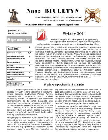 N a s z B I U L E TY N STOWARZYSZENIE PRYWATNYCH PRZEDSIĘBIORCÓW WARSZAWSKIEGO TRAKTU KRÓLEWSKIEGO www.stare-miasto.com [email protected] październik 2011 Wybory 2011 Rok 12, Numer 2/2011 W tym numerze: Wybory do Sejmu i Senatu 2011 Spotkania Zarządu 1 1, 2 Umowy poprawiające ekonomię naszych firm 2 Święto Starówki 2 Wywiad z wicemarszałkiem woj. mazowieckiego 3 Akcja charytatywna podjęcie przygotowań 4 Witamy nowych członków 4 Programy partyjne dla przedsiębiorców? 4 W dniu 4 sierpnia 2011 Prezydent Rzeczypospolitej Polskiej Bronisław Komorowski ogłosił termin wyborów do Sejmu i Senatu. Wybory odbędą się w dniu 9 października 2011. Zarząd zawraca się z apelem do wszystkich członków i sympatyków Stowarzyszenia o wzięcie udziału w wyborach, które odbędą się w najbliższą niedzielę. Jesteśmy organizacją apolityczną, co nie znaczy że nie mamy swoich przekonań i sympatii. W całym okresie działalności Stowarzyszenia staraliśmy się zawsze współpracować z każdą opcją polityczną dla dobra naszych członków, dla rozwoju naszych firm, dla dobra Starego Miasta i naszej stolicy. Okres przedwyborczy sprzyja wielu obietnicom o których zapomina się niedługo po wyborach, (mieliśmy wiele takich przykładów). W interesie każdej władzy szczególnie prawodawczej - jest stanowienie takiego prawa, które zapewnia stabilizację ekonomiczną i perspektywę rozwoju. Wybierzmy zatem Posłanki i Posłów, których choć trochę znamy i których program bodaj w części będzie zbieżny z naszymi postulatami i dążeniami (stabilizacja czynszów, wykup lokali użytkowych, umowy wieloletnie, itd..). Idźmy wszyscy na wybory. Ważne spotkania Zarządu 1. Na początku września 2011 członkowie Zarządu SPPWTK odbyli spotkanie z wiceburmistrzem Dzielnicy Śródmieście Panem Piotrem Królikiewiczem dotyczące m.in. polityki czynszowej miasta. Na spotkaniu tym zostaliśmy poinformowani, że do końca bieżącego roku pozostawia się bez zmian ustalenia wynikające z protokołu ustaleń przyjętych w dniu 07.03.2008 roku. Oznacza to m.in., że ci spośród naszych członków, którzy nie odbyli jeszcze negocjacji w sprawie czynszów dla swoich lokali, będą traktowani wg dotychczasowych zasad. Perspektywy na kolejne lata jednak nie rysują się najlepiej, bo przyszłe negocjacje mają się opierać na zupełnie nowym audycie opracowanym w marcu 2011 przez firmę Cushman & Wakefield. Jak należało się spodziewać wyjściowe stawki czynszowe będą wyższe. Na razie wszystko ma się odbywać na dotychczasowych zasadach, a czas pokaże jakie propozycje uda nam się wynegocjować. Jest oczywiste, że przed wyborami nikt nie podjął tego trudnego tematu, a ponieważ kampania wyborcza dotyczy wyborów do Sejmu i Senatu, problemy nasze wydają się zbyt przyziemne, choć miejmy nadzieję, że nie dla wszystkich. 2. Kolejne spotkanie Zarząd SPPWTK odbył z wicemarszałkiem Sejmiku Mazowieckiego Panem Marcinem Kierwińskim. Przedstawiliśmy nasze problemy związane z problematyką negocjacji czynszów, a także w zakresie wykupu lokali. O szczegółach poinformujemy na stronie 3 (wywiad). Pan Kierwiński jest także wiceprzewodniczącym warszawskiej PO i kandyduje w tegorocznych wyborach do Sejmu z listy Platformy Obywatelskiej. Uzgodniono także ew. wsparcie Sejmiku Mazowieckiego dla akcji charytatywnej. 2 Ważne spotkania Zarządu cd. 3. W dniu 21 września 2011 r. na posiedzenie Zarządu przybył pan poseł Ryszard Kalisz były minister Spraw Wewnętrznych i Administracji. Członkowie Zarządu oraz niektórzy członkowie stowarzyszenia, zapoznali pana posła z realiami naszej działalności na Starym Mieście, problemami dotyczącymi czynszów, wykupu lokali, a przede wszystkim z pogarszającymi się warunkami gospodarowania małych przedsię- biorstw. Bardzo ciekawie odniósł się pan poseł do naszych postulatów w świetle obowiązującego prawa, teorii prawa i zasad konstytucyjnych. Jak wynikało z wypowiedzi naszego gościa, jest on zwolennikiem uproszczenia procedur prawnych, dokończenia prywatyzacji poprzez sprzedaż lokali dotychczasowym najemcom oraz tworzenia odpowiednich warunków dla rozwoju małych i średnich przedsiębiorstw. Umowy poprawiające ekonomię naszych firm. Szukamy oszczędności, staramy się obniżać koszty prowadzenia naszych przedsiębiorstw. Te działania są oczywiste dla zmniejszenia choćby częściowo obciążeń finansowych jakie nakładane są na nasze firmy. Przy stosunkowo (statystycznie) niskiej inflacji, drożeją niewspółmiernie do niej wszelkie media, podnoszone są czynsze, drożeją także koszty pracy. Dlatego każda oferta czy propozycja zmniejszenia naszych obciążeń witana jest z uznaniem. Od kilku miesięcy nasi przedsiębiorcy prowadzą rozmowy zarówno z przedstawicielami firmy e-Service w zakresie obsługi kart płatniczych jak i z firmą PGE w zakresie sprzedaży energii elektrycznej. W przypadku obydwu firm negocjacje jak i konkretne propozycje dla naszych członków spotkały się z dużym zainteresowaniem i spora grupa naszych sklepów i zakładów gastronomicznych działa już pod auspicjami nowych korzystnych ustaleń. Firma e-Service zaproponowała naszym członkom obsługę w zakresie akceptacji kart płatniczych i najmu zestawów POS na bezkonkurencyjnych warunkach wobec inny firm oferujących podobne usługi. Zostaliśmy potraktowani jako klient korporacyjny i stąd możliwe niskie stawki za bezgotówkowa obsługę naszych klientów. Nie piszemy o szczegółach, ale każdy łatwo może porównać bieżącą ofertę firmy e-Service z dotychczas płaconymi stawkami, w rozmowach indywidualnych które już wiele przeprowadzono. Należy podkreślić, że nasz nowy kontrahent jest częścią banku PKO BP, a więc odpadają koszty pośrednictwa i stawki mogą być odpowiednio niskie. Druga umowa dotyczy sprzedaży energii elektrycznej. Znowelizowanie prawa energetycznego wprowadziło możliwość