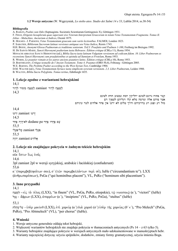 1.2 Wersje antyczne (W. Węgrzyniak, Lo stolto ateo. Studio dei Salmi 14 e 53, Lublin 2014, ss.38-54)