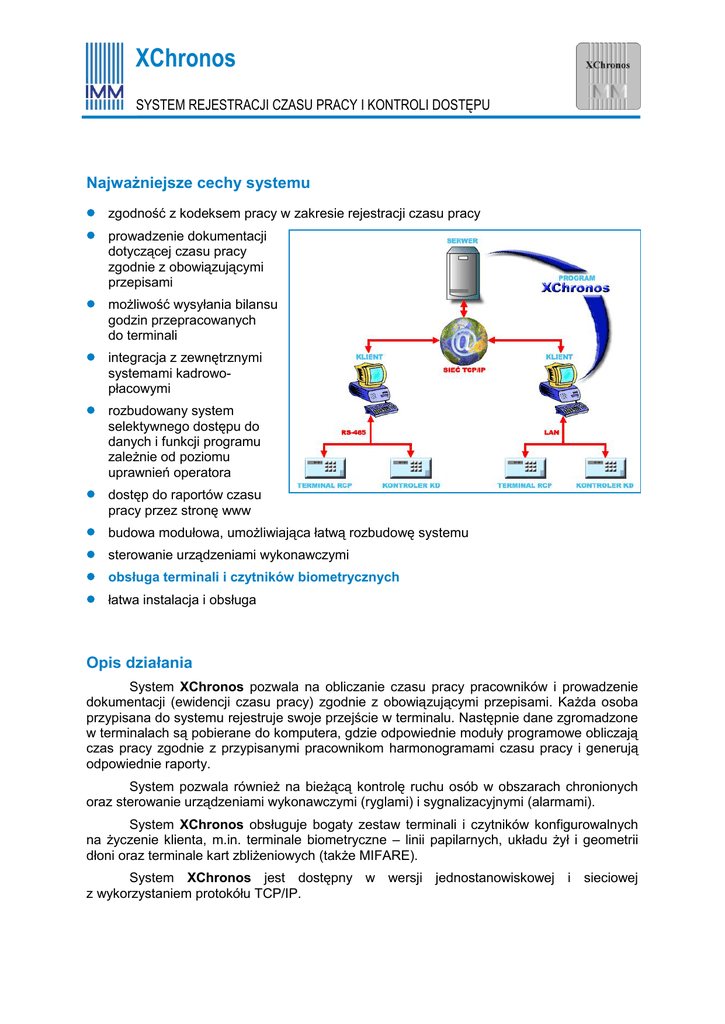 XChronos SYSTEM REJESTRACJI CZASU PRACY I KONTROLI DOSTĘPU Najważniejsze cechy systemu zgodność z kodeksem pracy w zakresie rejestracji czasu pracy prowadzenie dokumentacji dotyczącej czasu pracy zgodnie z obowiązującymi przepisami możliwość wysyłania bilansu godzin przepracowanych do terminali integracja z zewnętrznymi systemami kadrowopłacowymi rozbudowany system selektywnego dostępu do danych i funkcji programu zależnie od poziomu uprawnień operatora dostęp do raportów czasu pracy przez stronę www budowa modułowa, umożliwiająca łatwą rozbudowę systemu sterowanie urządzeniami wykonawczymi obsługa terminali i czytników biometrycznych łatwa instalacja i obsługa Opis działania System XChronos pozwala na obliczanie czasu pracy pracowników i prowadzenie dokumentacji (ewidencji czasu pracy) zgodnie z obowiązującymi przepisami. Każda osoba przypisana do systemu rejestruje swoje przejście w terminalu. Następnie dane zgromadzone w terminalach są pobierane do komputera, gdzie odpowiednie moduły programowe obliczają czas pracy zgodnie z przypisanymi pracownikom harmonogramami czasu pracy i generują odpowiednie raporty. System pozwala również na bieżącą kontrolę ruchu osób w obszarach chronionych oraz sterowanie urządzeniami wykonawczymi (ryglami) i sygnalizacyjnymi (alarmami). System XChronos obsługuje bogaty zestaw terminali i czytników konfigurowalnych na życzenie klienta, m.in. terminale biometryczne – linii papilarnych, układu żył i geometrii dłoni oraz terminale kart zbliżeniowych (także MIFARE). System XChronos jest dostępny w wersji jednostanowiskowej i sieciowej z wykorzystaniem protokółu TCP/IP. Opis funkcjonalny programu Rejestracja czasu pracy obliczanie czasu pracy zgodnie z kodeksem pracy tworzenie harmonogramów i kalendarzy opisujących różne typy organizacji czasu pracy przypisywanie harmonogramów pracy oddzielnie każdemu pracownikowi wprowadzanie przez administratora korekt dotyczących godzin wejścia i wyjścia tworzenie i drukowanie różnorodnych raportów o czasie pracy, spóźnieniach, obecnościach, harmonogramach itp. wprowadzanie wybranych informacji o pracowniku definiowanie nazw stanowisk, zakładów, działów i grup obowiązujących w firmie definiowanie świąt, godzin pracy uważanych za pracę w nocy i w święta Kontrola dostępu rejestracja zdarzeń i na bieżąco kontrola ruchu osób w strefach chronionych definiowanie i nadawanie użytkownikom uprawnień dostępu do obszarów chronionych definiowanie uprawnień dostępu do stref chronionych z uwzględnieniem stref czasowych raporty o ruchu w poszczególnych strefach informowanie operatora o alarmach i próbach wejścia osób nieuprawnionych wyświetlanie alarmów o naruszeniu praw dostępu do stref lub próbie zniszczenia urządzeń zabezpieczających Moduły sprzętowe systemu IMMSkan 300 IMMPro IMMFVein HandPunch 3000 IMMProx biometryczny terminal linii papilarnych biometryczny terminal wieloaplikacyjny biometryczny terminal układu żył palca biometryczny czytnik geometrii dłoni terminal zbliżeniowy Wymagania techniczne (zalecane) Wersja jednostanowiskowa: Wersja sieciowa: komputer PC 2,0 GHz, RAM 1 GB HDD z wolnym obszarem pamięci 100 MB system MS Windows XP/Vista/7 serwer – komputer PC, procesor dwurdzeniowy 2,3 GHz, RAM 2 GB klient – komputer PC, procesor 1,7 GHz, RAM 1 GB HDD z wolnym obszarem pamięci 500 MB system MS Windows XP/Vista/7 sieć komputerowa oparta o protokół TCP/IP INSTYTUT MASZYN MATEMATYCZNYCH 02-078 Warszawa, ul. Krzywickiego 34, tel. (22) 621 75 17, fax. (22) 629 92 70 e-mail: [email protected], www.imm.org.pl