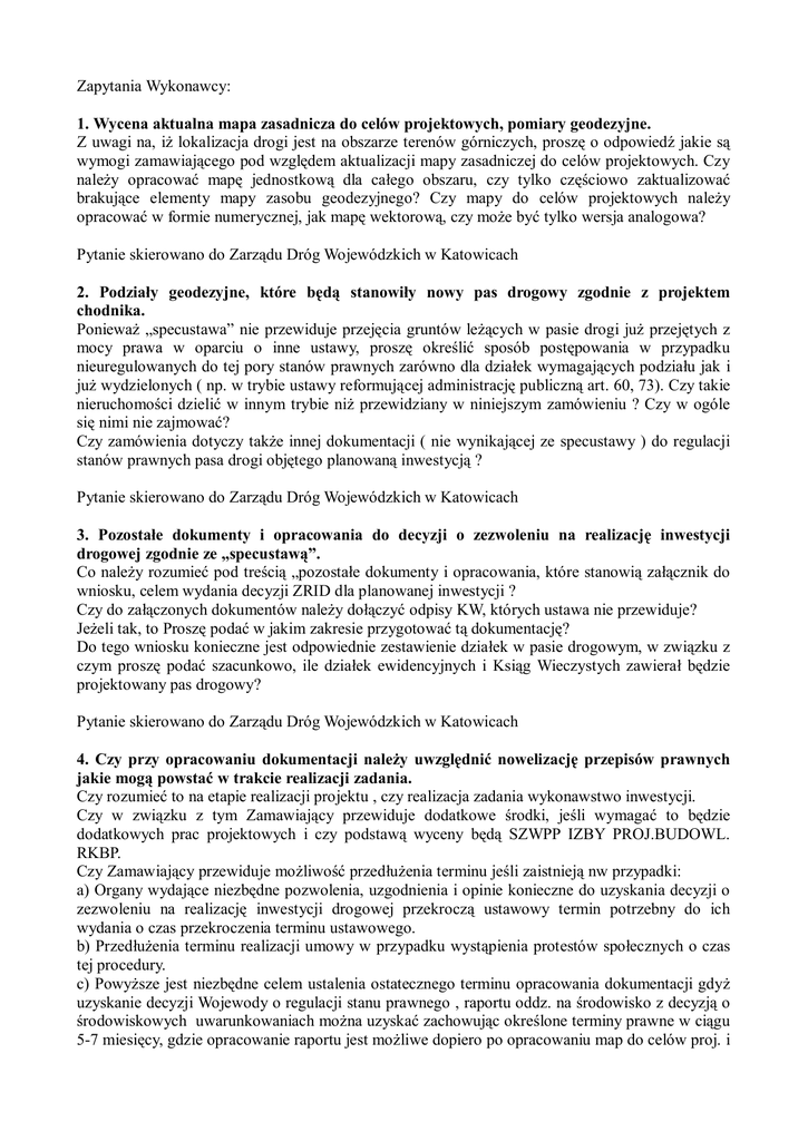 Zapytania Wykonawcy: 1. Wycena aktualna mapa zasadnicza do celów projektowych, pomiary geodezyjne. Z uwagi na, i lokalizacja drogi jest na obszarze terenów górniczych, prosz o odpowied jakie s wymogi zamawiaj cego pod wzgl dem aktualizacji mapy zasadniczej do celów projektowych. Czy nale y opracowa map jednostkow dla ca ego obszaru, czy tylko cz ciowo zaktualizowa brakuj ce elementy mapy zasobu geodezyjnego? Czy mapy do celów projektowych nale y opracowa w formie numerycznej, jak map wektorow , czy mo e by tylko wersja analogowa? Pytanie skierowano do Zarz du Dróg Wojewódzkich w Katowicach 2. Podzia y geodezyjne, które b stanowi y nowy pas drogowy zgodnie z projektem chodnika. Poniewa „specustawa” nie przewiduje przej cia gruntów le cych w pasie drogi ju przej tych z mocy prawa w oparciu o inne ustawy, prosz okre li sposób post powania w przypadku nieuregulowanych do tej pory stanów prawnych zarówno dla dzia ek wymagaj cych podzia u jak i ju wydzielonych ( np. w trybie ustawy reformuj cej administracj publiczn art. 60, 73). Czy takie nieruchomo ci dzieli w innym trybie ni przewidziany w niniejszym zamówieniu ? Czy w ogóle si nimi nie zajmowa ? Czy zamówienia dotyczy tak e innej dokumentacji ( nie wynikaj cej ze specustawy ) do regulacji stanów prawnych pasa drogi obj tego planowan inwestycj ? Pytanie skierowano do Zarz du Dróg Wojewódzkich w Katowicach 3. Pozosta e dokumenty i opracowania do decyzji o zezwoleniu na realizacj inwestycji drogowej zgodnie ze „specustaw ”. Co nale y rozumie pod tre ci „pozosta e dokumenty i opracowania, które stanowi za cznik do wniosku, celem wydania decyzji ZRID dla planowanej inwestycji ? Czy do za czonych dokumentów nale y do czy odpisy KW, których ustawa nie przewiduje? Je eli tak, to Prosz poda w jakim zakresie przygotowa t dokumentacj ? Do tego wniosku konieczne jest odpowiednie zestawienie dzia ek w pasie drogowym, w zwi zku z czym prosz poda szacunkowo, ile dzia ek ewidencyjnych i Ksi g Wieczystych zawiera b dzie projektowany pas drogowy? Pytanie skierowano do Zarz du Dróg Wojewódzkich w Katowicach 4. Czy przy opracowaniu dokumentacji nale y uwzgl dni nowelizacj przepisów prawnych jakie mog powsta w trakcie realizacji zadania. Czy rozumie to na etapie realizacji projektu , czy realizacja zadania wykonawstwo inwestycji. Czy w zwi zku z tym Zamawiaj cy przewiduje dodatkowe rodki, je li wymaga to b dzie dodatkowych prac projektowych i czy podstaw wyceny b SZWPP IZBY PROJ.BUDOWL. RKBP. Czy Zamawiaj cy przewiduje mo liwo przed enia terminu je li zaistniej nw przypadki: a) Organy wydaj ce niezb dne pozwolenia, uzgodnienia i opinie konieczne do uzyskania decyzji o zezwoleniu na realizacj inwestycji drogowej przekrocz ustawowy termin potrzebny do ich wydania o czas przekroczenia terminu ustawowego. b) Przed enia terminu realizacji umowy w przypadku wyst pienia protestów spo ecznych o czas tej procedury. c) Powy sze jest niezb dne celem ustalenia ostatecznego terminu opracowania dokumentacji gdy uzyskanie decyzji Wojewody o regulacji stanu prawnego , raportu oddz. na rodowisko z decyzj o rodowiskowych uwarunkowaniach mo na uzyska zachowuj c okre lone terminy prawne w ci gu 5-7 miesi cy, gdzie opracowanie raportu jest mo liwe dopiero po opracowaniu map do celów proj. i koncepcji tj. ju min 4 miesi ce ( uzyskanie map ). Pytanie skierowano do Zarz du Dróg Wojewódzkich w Katowicach 5. Prosz okre li ilo nieprecyzyjne. koncepcji (wariantów) jak nale y opracowa . Okre lenie „kilka” jest Odpowied : Zamawiaj cy pod „okre leniem” kilka rozumie 3 warianty (koncepcje), które nale y opracowa . 6. Prosimy o precyzyjne okre lenie zakresy opracowania. Z SIWZ wynika, i opracowanie dotyczy chodnika 500m, natomiast w cz ci opisowej dot. pomiarów ruchu drogowego mówi si o prognozie ruchu i przepustowo ci skrzy owania itd. O które skrzy owanie chodzi? Odpowied : Chodzi o skrzy owanie DW nr 925 z drogami powiatowymi: ul. Palowicka nr 5311S i ul.. Wolno ci nr 5614S.
