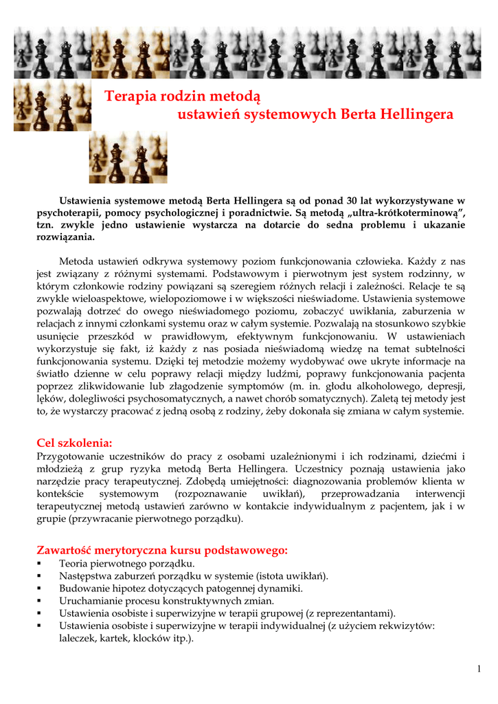 Terapia rodzin metodą ustawień systemowych Berta Hellingera Ustawienia systemowe metodą Berta Hellingera są od ponad 30 lat wykorzystywane w psychoterapii, pomocy psychologicznej i poradnictwie. Są metodą „ultra-krótkoterminową”, tzn. zwykle jedno ustawienie wystarcza na dotarcie do sedna problemu i ukazanie rozwiązania. Metoda ustawień odkrywa systemowy poziom funkcjonowania człowieka. Każdy z nas jest związany z różnymi systemami. Podstawowym i pierwotnym jest system rodzinny, w którym członkowie rodziny powiązani są szeregiem różnych relacji i zależności. Relacje te są zwykle wieloaspektowe, wielopoziomowe i w większości nieświadome. Ustawienia systemowe pozwalają dotrzeć do owego nieświadomego poziomu, zobaczyć uwikłania, zaburzenia w relacjach z innymi członkami systemu oraz w całym systemie. Pozwalają na stosunkowo szybkie usunięcie przeszkód w prawidłowym, efektywnym funkcjonowaniu. W ustawieniach wykorzystuje się fakt, iż każdy z nas posiada nieświadomą wiedzę na temat subtelności funkcjonowania systemu. Dzięki tej metodzie możemy wydobywać owe ukryte informacje na światło dzienne w celu poprawy relacji między ludźmi, poprawy funkcjonowania pacjenta poprzez zlikwidowanie lub złagodzenie symptomów (m. in. głodu alkoholowego, depresji, lęków, dolegliwości psychosomatycznych, a nawet chorób somatycznych). Zaletą tej metody jest to, że wystarczy pracować z jedną osobą z rodziny, żeby dokonała się zmiana w całym systemie. Cel szkolenia: Przygotowanie uczestników do pracy z osobami uzależnionymi i ich rodzinami, dziećmi i młodzieżą z grup ryzyka metodą Berta Hellingera. Uczestnicy poznają ustawienia jako narzędzie pracy terapeutycznej. Zdobędą umiejętności: diagnozowania problemów klienta w kontekście systemowym (rozpoznawanie uwikłań), przeprowadzania interwencji terapeutycznej metodą ustawień zarówno w kontakcie indywidualnym z pacjentem, jak i w grupie (przywracanie pierwotnego porządku). Zawartość merytoryczna kursu podstawowego: Teoria pierwotnego porządku. Następstwa zaburzeń porządku w systemie (istota uwikłań). Budowanie hipotez dotyczących patogennej dynamiki. Uruchamianie procesu konstruktywnych zmian. Ustawienia osobiste i superwizyjne w terapii grupowej (z reprezentantami). Ustawienia osobiste i superwizyjne w terapii indywidualnej (z użyciem rekwizytów: laleczek, kartek, klocków itp.). 1 Metoda: Szkolenie na charakter warsztatowy z elementami wykładowymi; uczestnicy poznają założenia teoretyczne i praktykę ustawień systemowych. Będą mieli okazję doświadczyć ustawień z różnych pozycji: obserwatora, reprezentanta, klienta; będą uczyć się ustawień poprzez osobistą pracę nad problemami własnymi lub zawodowymi (superwizje), warunkiem uczestnictwa w szkoleniu jest więc gotowość do zaangażowania i otwartości. Adresaci szkolenia: terapeuci uzależnień i współuzależnienia, psycholodzy, socjoterapeuci, pedagodzy oraz inne osoby pracujące w obszarze pomagania. Czas trwania szkolenia: 144 godziny dydaktyczne (6 trzydniowych sesji szkoleniowych) Terminy kursu podstawowego: I sesja II sesja III sesja IV sesja V sesja VI sesja 02 – 04 września 2011 r. 14 – 16 października 2011 r. 16 – 18 grudnia 2011 r. 02 – 04 marca 2012 r. 20 – 22 kwietnia 2012 r. 29 czerwca – 01 lipca 2012 r. Koszt szkolenia: bez kosztów wyżywienia i noclegu - 1.560,00 zł, wraz z noclegiem i pełnym wyżywieniem w czasie wszystkich sesji - 2.760,00 zł. Istnieje możliwość zapłaty w 6 ratach. Numer konta bankowego: 84 1440 1101 0000 0000 0394 0306 Nordea Bank S.A. Fundacja ETOH ul. Mszczonowska 6 01-254 Warszawa Prowadzący szkolenie: Małgorzata Rajchert-Lewandowska – absolwentka Wydziału Psychologii UW, certyfikowany psychoterapeuta Europejskiego Stowarzyszenia Psychoterapii. Prowadzi zajęcia z psychologii na Uniwersytecie im. Kardynała Stefana Wyszyńskiego. Pełniła funkcję zastępcy ordynatora Oddziału Nerwic Szpitala Specjalistycznego MSWiA w Otwocku. Prowadzi terapię indywidualną i grupową, kursy psychoedukacyjne, współprowadzi kursy certyfikacyjne, szkoli psychoterapeutów, współprowadzi zajęcia superwizyjne dla psychologów w ramach Czteroletniego Studium Neurolingwistycznej Psychoterapii. Od kilku lat związana z Centrum Pomocy Profesjonalnej w Warszawie. Członek Polskiej Federacji Psychoterapii. Miejsce szkolenia: Szczegółowych informacji udziela: Fundacja ETOH ul. Mszczonowska 6, 01-254 Warszawa tel. 022 836 80 80, 022 836 80 89 www.etoh.edu.pl Dział Profilaktyki Fundacji ETOH tel. 022 836 80 80, 022 836 80 89 wew. 34 tel. kom. 604 660 231 2 UWAGA: Osoby, które ukończą kurs podstawowy mogą doskonalić swoje kompetencje w szkoleniu zaawansowanym. W szkoleniu zaawansowanym mogą uczestniczyć także osoby, które odbyły kursy podstawowe ustawień systemowych B. Hellingera, prowadzone poza Fundacją ETOH. Z uwagi na duże zainteresowanie proponowanymi szkoleniami prosimy o przesyłanie zgłoszeń w celu rezerwacji miejsc. O przyjęciu na poszczególne szkolenia decyduje kolejność zgłoszeń. Zawartość merytoryczna kursu zaawansowanego: Prace ustawieniowe własnych systemów rodzinnych – generacyjnych, aktualnych, związków partnerskich. Ustawienia superwizyjne pacjentów prowadzonych przez uczestników grupy Systemowa diagnoza sytuacji pacjenta Diagnoza relacji terapeuta - pacjent Diagnoza trudności terapeuty Uruchamianie procesu konstruktywnych zmian Etyka terapeuty pracującego metodą ustawień Ustawienia w organizacjach. Rozwiązywanie konfliktów i problemów w systemach zawodowych i zespołach. Zastosowanie ustawień w pracy z symptomami (dolegliwościami psychosomatycznymi, uzależnieniami, chorobami somatycznymi, zaburzeniami nerwicowymi i depresją). Kontynuacja prac ustawieniowych w kontakcie indywidualnym ( z użyciem rekwizytów: laleczek, kartek, klocków). Korzyści wynikające z metody ustawień na figurkach