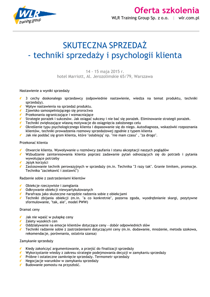 Oferta szkolenia WLR Training Group Sp. z o.o. | wlr.com.pl SKUTECZNA SPRZEDAŻ - techniki sprzedaży i psychologii klienta 14 - 15 maja 2015 r. hotel Marriott, Al. Jerozolimskie 65/79, Warszawa Nastawienie a wyniki sprzedaży 3 cechy doskonałego sprzedawcy (odpowiednie nastawienie, wiedza na temat produktu, techniki sprzedaży). Wpływ nastawienia na sprzedaż produktu. Zjawisko samospełniającego się proroctwa Przekonania ograniczające i wzmacniające Strategie porażek i sukcesów. Jak osiągać sukcesy i nie bać się porażek. Eliminowanie strategii porażek. Techniki zwiększające własną motywacje do osiągnięcia założonego celu Określenie typu psychologicznego klienta i dopasowanie się do niego. Autodiagnoza, wskazówki rozpoznania klientów, techniki prowadzenia rozmowy sprzedażowej zgodnie z typem klienta Jak nie poddać się grom klienta, które "osłabiają" np. "nie mam czasu" , "za drogo". Przekonać klienta Otwarcie klienta. Wywoływanie u rozmówcy zaufania i stanu akceptacji naszych poglądów Wzbudzanie zainteresowania klienta poprzez zadawanie pytań odnoszących się do potrzeb i pytania wywołujące potrzeby Język korzyści Zastosowanie technik perswazyjnych w sprzedaży (m.in. Technika "3 razy tak". Granie limitem, promocje. Technika "zaciekawić i zostawić") Radzenie sobie z zastrzeżeniami klientów Obiekcje rzeczywiste i zamglania Odkrywanie obiekcji niewyartykułowanych Parafraza jako skuteczne narzędzie radzenia sobie z obiekcjami Techniki zbijania obiekcji (m.in. "a co konkretnie", pozorna zgoda, wyodrębnianie skargi, pozytywne sformułowanie, "tak, ale", model PWW) Dramat ceny Jak nie wpaść w pułapkę ceny Zalety wysokich cen Oddziaływanie na emocje klientów dotyczące ceny - dobór odpowiednich słów Techniki radzenie sobie z zastrzeżeniami dotyczącymi ceny (m.in. dodawanie, mnożenie, metoda szokowa, rekomendacje, porównania, ostatnia szansa) Zamykanie sprzedaży Kiedy zakończyć argumentowanie, a przejść do finalizacji sprzedaży Wykorzystanie wiedzy z zakresu strategie podejmowania decyzji w zamykaniu sprzedaży Próbne i ostateczne zamknięcie sprzedaży. Termometr sprzedaży Negocjacje warunków w zamykaniu sprzedaży Budowanie pomostu na przyszłość. Harmonogram szkolenia 14 - 15 maja: 09:45 - 10:00 Rejestracja i przywitanie uczestników 10:00 - 11:30 Szkolenie 11:30 - 11:45 Przerwa kawowa 11:45 - 13:30 Szkolenie 13:30 - 14:00 Lunch 14:00 - 16:00 Szkolenie 16:00 Zakończenie szkolenia Katarzyna Majewska Psycholog, trener, coach. Od 2000 roku pracuje jako trener szkoleń miękkich, od 2006 roku jako trener biznesu. Szkoli przedstawicieli handlowych, sprzedawców, menedżerów, urzędników. Absolwentka psychologii Uniwersytetu im. Adama Mickiewicza w Poznaniu. Posiada certyfikat NLP – Practitioner wydany przez Instytut Miltona H. Eriksona z Berlina. Ukończyła Podyplomowe Studia z zakresu Coachingu w Wyższej Szkole Bankowej w Poznaniu. Była Dyrektorem ds. Metodycznych w firmie specjalizującej się w nauczaniu dorosłych, gdzie do jej głównych obowiązków należała opieka nad poznańskim zespołem trenerskim. Odpowiedzialna była również za metodykę kursu szybkiego czytania oraz przygotowanie przyszłych trenerów z całej Polski do pracy trenerskiej. Swoją przygodę w szkoleniach biznesowych rozpoczęła w jednej z poznańskich firm szkoleniowych, w której była również Kierownikiem ds. Szkoleń i Rozwoju, gdzie do jej obowiązków należała także aktywna sprzedaż szkoleń. Przez krótki czas pracowała również jako trener wewnętrzny branży FMCG, gdzie do jej zadań należało wspomaganie działu sprzedaży poprzez wspieranie rozwoju kompetencji menedżerskich Koordynatorów Sprzedaży oraz prowadzenie szkoleń sprzedażowych dla Przedstawicieli Handlowych i telesprzedawców. FORMULARZ ZGŁOSZENIOWY Prosimy przesłać faksem: 22 632 23 72 lub: [email protected] SKUTECZNA SPRZEDAŻ - techniki sprzedaży i psychologii klienta 14 - 15 maja 2015 r. hotel Marriott, Al. Jerozolimskie 65/79, Warszawa Imiona, nazwiska oraz stanowiska uczestników: Nazwa firmy: NIP: Adres firmy: Tel: Fax: Proszę o przesłanie potwierdzenia na mój e-mail Proszę o wystawienie faktury VAT E-mail: Uwagi: Cena uczestnictwa 1190 zł + 23% VAT - koszt udziału jednej osoby, zgłoszenia przesłane do 30 kwietnia 1490 zł + 23% VAT - koszt udziału jednej osoby, zgłoszenia przesłane po 30 kwietnia Warunki uczestnictwa • • • • • • • • • • • • Cena obejmuje: prelekcje, materiały, certyfikat oraz wyżywienie. Po otrzymaniu zgłoszenia prześlemy Państwu potwierdzenie udziału w szkoleniu oraz fakturę pro forma. Prosimy o dokonanie wpłaty zgodnie z terminem płatności podanym na fakturze proforma. Wpłaty należy dokonać na konto: 69 1140 2004 0000 3302 7499 3004 Rezygnację z udziału należy przesyłać listem poleconym na adres organizatora. W przypadku rezygnacji w terminie mniejszym niż 14 dni przed rozpoczęciem szkolenia pobierane jest 100% opłaty za udział bez względu na termin wysłania formularza zgłoszeniowego. Nieodwołanie zgłoszenia lub niewzięcie udziału w szkoleniu powoduje obciążenie pełnymi kosztami udziału. Niedokonanie wpłaty nie jest jednoznaczne z rezygnacją z udziału. Zamiast zgłoszonej osoby w szkoleniu może wziąć udział inny pracownik firmy. Organizator zastrzega sobie prawo do zmian w programie. W przypadku, gdy wykładowca z przyczyn losowych nie będzie mógł przeprowadzić zajęć w podanym wcześniej terminie WLR Training Group zastrzega sobie prawo zmiany terminu zajęć. Uczestnicy szkolenia wskazani przez osobę zgłaszającą zostaną niezwłocznie poinformowani o tym fakcie. Wyrażam zgodę na przetwarzanie danych osobowych dla celów marketingowych przez WLR Training Group zgodnie z Ustawą o ochronie danych osobowych (Dz.U. nr 133/97, poz. 883), a w szczególności zgadzam się na otrzymywanie informacji handlowej od WLR Training Group w rozumieni