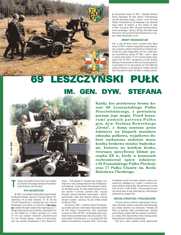 do leszczyñskich koszar. W 1967 r. Rozkazem Ministra Obrony Narodowej 80 Pu³k Artylerii Przeciwlotniczej otrzyma³ dziedzictwo tradycji, historiê i numer 69 Pu³ku Artylerii Przeciwlotniczej. Od nastêpnego roku obchodzi³ swoje œwiêto 16 kwietnia, w dniu wejœcia do walki w 1945 r. 3 wrzeœnia 1994 r. 69 paplot otrzyma³ sztandar, miano wyró¿niaj¹ce i patrona. Od tego dnia pe³na nazwa Pu³ku brzmi: 69 Leszczyñski Pu³k Przeciwlotniczy im. gen. dyw. Stefana Roweckiego „Grota”. ZMIANY ORGANIZACYJNE Pu³k w swej 60-letniej historii przeszed³ wiele takich zmian. W 1954 r. w wyniku reorganizacji w jego sk³ad wesz³y 2 dywizjony artylerii przeciwlotniczej œredniego kalibru (85 mm), jeden ma³ego kalibru (37 mm) i jeden dywizjon przeciwlotniczy szkolny. W 1962 r. jeden z daplot w miejsce armat kalibru 37 mm otrzyma³ zestawy artyleryjskie S-60. W 1970 r. wprowadzono w Pu³ku strukturê bateryjn¹. Funkcjonowa³o 6 baterii po 8 armat przeciwlotniczych kalibru 57 mm. Na prze³omie lat 1979-1980 Pu³k zosta³ przezbrojony w przeciwlotnicze zestawy rakietowe KUB. Otrzyma³o je 5 baterii. W 1995 r. w sk³adzie jednost- 69 LESZCZYÑSKI PU£K IM. GEN. DYW. Ka¿dy, kto przekroczy bramê koszar 69 Leszczyñskiego Pu³ku Przeciwlotniczego, z pewnoœci¹ poczuje jego magiê. Przed koszarami pomnik patrona Pu³ku gen. dyw. Stefana Roweckiego „Grota”, z dum¹ noszona przez ¿o³nierzy na klapach munduru odznaka pu³kowa, wyj¹tkowo dobrze zachowane stuletnie mury, kostka brukowa miêdzy budynkami, historia na ka¿dym kroku, tworz¹ca specyficzny klimat pocz¹tku XX w., kiedy w koszarach rozbrzmiewa³ œpiew ¿o³nierzy z 55 Poznañskiego Pu³ku Piechoty oraz 17 Pu³ku U³anów im. Króla Boles³awa Chrobrego. Fot.: Arch. ZRWL T STEFANA radycjê orê¿a w³aœnie tych formacji oraz przyby³ego z Gubina 5 Kresowego Dywizjonu Przeciwlotniczego dziedziczy dziœ 69 Lpplot. RYS HISTORYCZNY W 1944 r. na podstawie Rozkazu Naczelnego Dowództwa Wojska Polskiego utworzono 3 Dywizjê Artylerii Przeciwlotniczej. W jej sk³ad wchodzi³y: 61, 66, 69 oraz 75 Pu³k Przeciwlotniczy. 2 wrzeœnia tego roku w Kolonii Wrotkowskiej (na po³udnie od Lublina) mjr Iwan Agurajew, dowódca 69 paplot, wyda³ rozkaz organizacyjny nr 1, którego datê przyjmuje siê za to¿sam¹ z utworzeniem Pu³ku. Pu³k sk³ada³ siê z 4 baterii ogniowych po 6 armat 37 mm oraz kompanii karabinów przeciwlotniczych 12,7 mm. Pierwsze zadanie – os³ony linii komunikacyjnych oraz rejonów zeœrodkowania 2 Armii Wojska Pol- skiego – Pu³k wykona³ 27 listopada tego samego roku, kiedy wraz z ca³¹ 3 Dywizj¹ wykona³ marsz do Miêdzyrzeca Podlaskiego. Chrzest bojowy Pu³k przeszed³ 16 kwietnia nad Nys¹ £u¿yck¹. W czasie dzia³añ bojowych 69 paplot zestrzeli³ 4 samoloty, uszkodzi³ jeden, zniszczy³ 24 punkty ogniowe karabinów maszynowych i artylerii, wyeliminowa³ z walki oko³o batalionu piechoty, zniszczy³ transport czo³gów z amunicj¹. Na polu chwa³y poleg³o 34 ¿o³nierzy Pu³ku. We wrzeœniu 1945 r. 3 Dywizja Artylerii Przeciwlotniczej zosta³a czêœciowo rozformowana. Na jej bazie powsta³ 86 Pu³k Artylerii Przeciwlotniczej, który stacjonowa³ w Lesznie do 1948 r. W 1951 r. na podstawie planu rozbudowy formacji przeciwlotniczych utworzona zosta³a 11 Dywizja Artylerii Przeciwlotniczej, a w jej sk³adzie 80 Pu³k Artylerii Przeciwlotniczej. W grudniu 1955 r. Pu³k przyby³ ki dodatkowo zosta³ sformowany dywizjon artylerii przeciwlotniczej, sk³adaj¹cy siê z 3 baterii, o strukturze mieszanej rakietowo-artyleryjskiej. By³ wyposa¿ony w armaty S-60, ZU-23-2 i S-2M. W 2001 r. Pu³k przeszed³ na strukturê dywizjonow¹. W jego sk³ad w³¹czony zosta³ dywizjon przeciwlotniczy zestawu OSA. OBECNA STRUKTURA I PRZEZNACZENIE W swojej obecnej strukturze organizacyjnej Pu³k posiada ró¿norodne systemy rozpoznania radiolokacyjnego oraz zestawy rakietowe oraz artyleryjskie. Podstaw¹ si³y Pu³ku s¹ dywizjony rakiet przeciwlotniczych: dywizjon przeciwlotniczy zestawu KUB oraz dywizjon przeciwlotniczy zestawu OSA. Bezpoœredni¹ os³onê realizuj¹ pododdzia³y dywizjonu rakietowo-artyleryjskiego. Pu³k jest w stanie zapewniæ os³onê wyznaczonych Okrêgu Wojskowego. Trzykrotnie, w latach 1982, 1983 i 1986, otrzyma³ Medal Pami¹tkowy „Za osi¹gniêcia w s³u¿bie wojskowej”. Dwukrotnie jego ówczesny dowódca p³k dypl. Miros³aw Rochmankowski odbiera³ „Znak honorowy Si³ Zbrojnych RP”. Po raz pierwszy w 1995 r. od Szefa Sztabu Generalnego, po raz drugi w 1999 r. od Ministra Obrony Narodowej. Dwa razy, w 1974 r i w 1984 r., by³ odznaczany „Medalem za zas³ugi dla ŒOW”. Nie mniej istotny jest Krzy¿ Zas³ugi dla ZHP z 1990 r. CYWILE I MY PRZECIWLOTNICZY – W moim przekonaniu wyró¿nikiem tego Pu³ku jest z jednej strony bogata tradycja, a z drugiej szczególna wiêŸ z mieszkañcami regionu i miasta – mówi dowódca 69 Lpplot pp³k Ryszard Kretkowski. – Oczywiœcie jedno wynika z drugiego. Pe³ni¹c s³u¿bê w innych jednostkach, nie obserwowa³em tak za¿y³ej wiêzi emocjonalnej miêdzy wojskiem i mieszkañcami. Tutejsi parlamentarzyœci, mieszkañcy, w³adze lokalne sami wp³ywaj¹ na te kontakty, s¹ ¿ywo zainteresowani wspó³prac¹. Czasem s¹ wrêcz ambasadorami naszych dzia³añ. To wspania³e, ¿e chc¹ byæ tak silnie zwi¹zani z nasz¹ jednostk¹, ¿e s¹ tak otwarci i przyjaŸni i... domagaj¹ siê od nas sukcesów, bo jesteœmy 69 Leszczyñskim Pu³kiem Przeciwlotniczym. Opracowa³a: Agnieszka SZKODA Zdjêcia: archiwum 69 Lpplot ROWECKIEGO „GROTA” obiektów ugrupowania bojowego wojsk oraz podj¹æ skuteczn¹ walkê ze œrodkami napadu powietrznego przeciwnika w ró¿nych warunkach zak³óceñ radiolokacyjnych zarówno w dzieñ jak i w nocy. OSI¥GNIÊCIA Pierwsze strzelania bojowe w 1981 r. na poligonie w ówczesnym Zwi¹zku Radzieckim w Asza³uku Pu³k wykona³ na ocenê dobr¹, a kolejne, w 1985 i 1988 r., na ocenê bardzo dobr¹. Po raz pierwszy w kraju odby³ strzelani