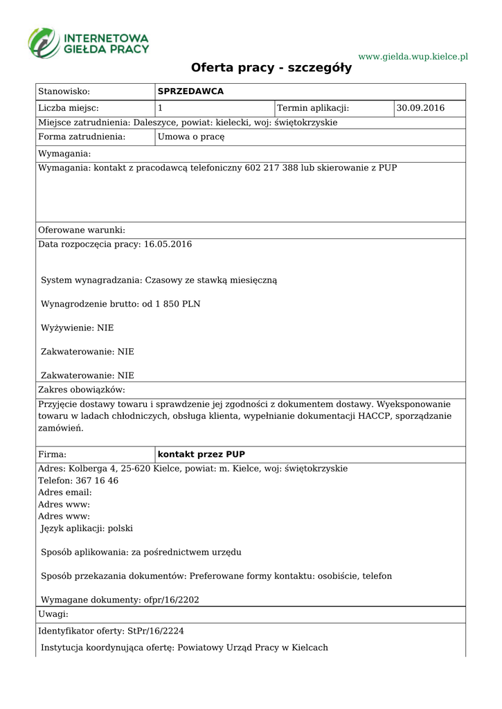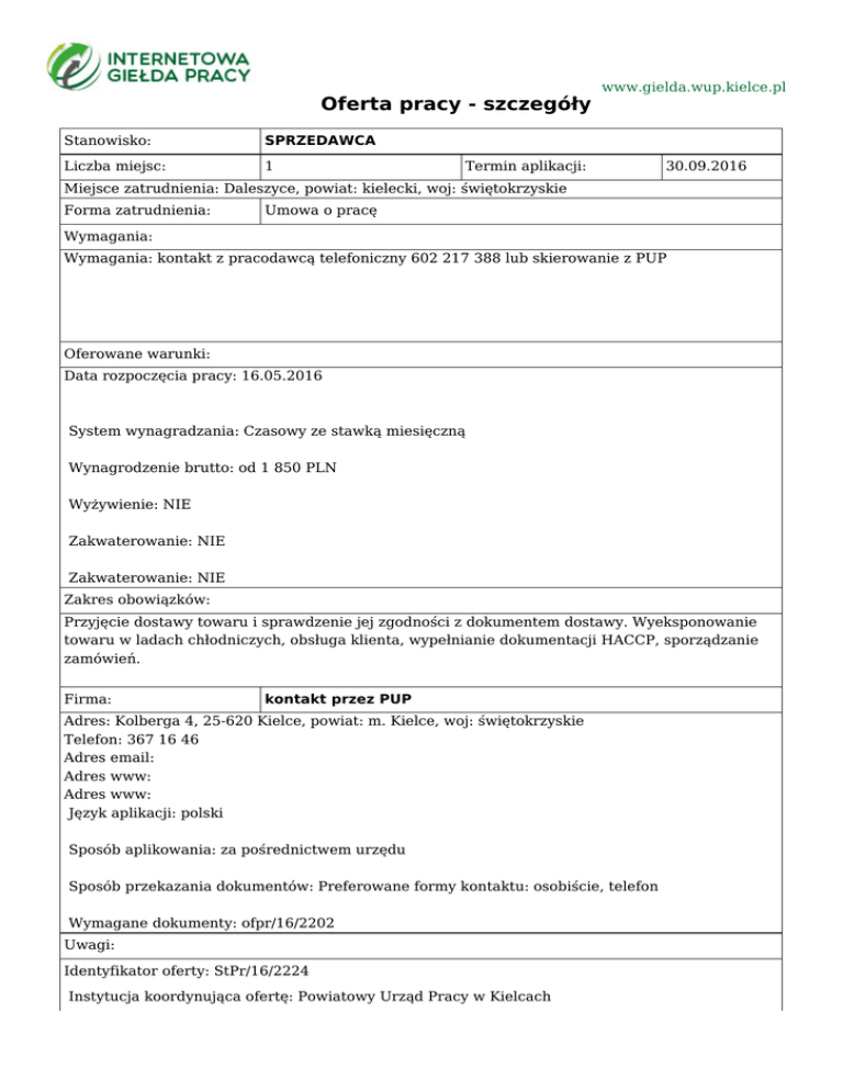 Oferta pracy - szczegóły Stanowisko: SPRZEDAWCA Liczba miejsc: 1 www.gielda.wup.kielce.pl Termin aplikacji: 30.09.2016 Miejsce zatrudnienia: Daleszyce, powiat: kielecki, woj: świętokrzyskie Forma zatrudnienia: Umowa o pracę Wymagania: Wymagania: kontakt z pracodawcą telefoniczny 602 217 388 lub skierowanie z PUP Oferowane warunki: Data rozpoczęcia pracy: 16.05.2016 System wynagradzania: Czasowy ze stawką miesięczną Wynagrodzenie brutto: od 1 850 PLN Wyżywienie: NIE Zakwaterowanie: NIE Zakwaterowanie: NIE Zakres obowiązków: Przyjęcie dostawy towaru i sprawdzenie jej zgodności z dokumentem dostawy. Wyeksponowanie towaru w ladach chłodniczych, obsługa klienta, wypełnianie dokumentacji HACCP, sporządzanie zamówień. Firma: kontakt przez PUP Adres: Kolberga 4, 25-620 Kielce, powiat: m. Kielce, woj: świętokrzyskie Telefon: 367 16 46 Adres email: Adres www: Adres www: Język aplikacji: polski Sposób aplikowania: za pośrednictwem urzędu Sposób przekazania dokumentów: Preferowane formy kontaktu: osobiście, telefon Wymagane dokumenty: ofpr/16/2202 Uwagi: Identyfikator oferty: StPr/16/2224 Instytucja koordynująca ofertę: Powiatowy Urząd Pracy w Kielcach Urząd Pracy dokłada wszelkich starań, aby oferty pracy będące w zasobach urzędu, były rzetelne i wiarygodne. Ponieważ wszystkie oferty pracy pochodzą od osób trzecich Urząd Pracy zastrzega, że odpowiedzialność za ewentualne rozbieżności pomiędzy warunkami pracy zaprezentowanymi w niniejszej ofercie a warunkami zaproponowanymi przez potencjalnego pracodawcę ponosi pracodawca.