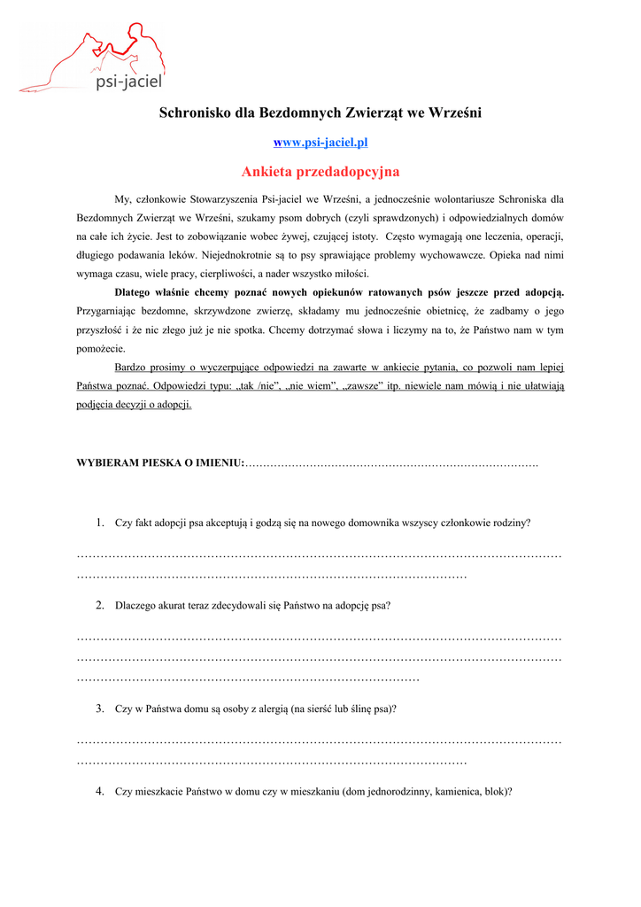 Schronisko dla Bezdomnych Zwierząt we Wrześni www.psi-jaciel.pl Ankieta przedadopcyjna My, członkowie Stowarzyszenia Psi-jaciel we Wrześni, a jednocześnie wolontariusze Schroniska dla Bezdomnych Zwierząt we Wrześni, szukamy psom dobrych (czyli sprawdzonych) i odpowiedzialnych domów na całe ich życie. Jest to zobowiązanie wobec żywej, czującej istoty. Często wymagają one leczenia, operacji, długiego podawania leków. Niejednokrotnie są to psy sprawiające problemy wychowawcze. Opieka nad nimi wymaga czasu, wiele pracy, cierpliwości, a nader wszystko miłości. Dlatego właśnie chcemy poznać nowych opiekunów ratowanych psów jeszcze przed adopcją. Przygarniając bezdomne, skrzywdzone zwierzę, składamy mu jednocześnie obietnicę, że zadbamy o jego przyszłość i że nic złego już je nie spotka. Chcemy dotrzymać słowa i liczymy na to, że Państwo nam w tym pomożecie. Bardzo prosimy o wyczerpujące odpowiedzi na zawarte w ankiecie pytania, co pozwoli nam lepiej Państwa poznać. Odpowiedzi typu: „tak /nie”, „nie wiem”, „zawsze” itp. niewiele nam mówią i nie ułatwiają podjęcia decyzji o adopcji. WYBIERAM PIESKA O IMIENIU:………………………………………………………………………. 1. Czy fakt adopcji psa akceptują i godzą się na nowego domownika wszyscy członkowie rodziny? …………………………………………………………………………………………………………… ……………………………………………………………………………………… 2. Dlaczego akurat teraz zdecydowali się Państwo na adopcję psa? …………………………………………………………………………………………………………… …………………………………………………………………………………………………………… …………………………………………………………………………… 3. Czy w Państwa domu są osoby z alergią (na sierść lub ślinę psa)? …………………………………………………………………………………………………………… ……………………………………………………………………………………… 4. Czy mieszkacie Państwo w domu czy w mieszkaniu (dom jednorodzinny, kamienica, blok)? …………………………………………………………………………………………………………… ……………………………………………………………………………………… 5. Czy pies będzie mieszkał z Państwem czy na zewnątrz? …………………………………………………………………………………………………………… …………………………………………………………………………………………………………… …………………………………………………………………………… 6. Czy w Państwa rodzinie są dzieci (jeśli tak to w jakim są wieku)? …………………………………………………………………………………………………………… ……………………………………………………………………………………… 7. Czy obecnie w Państwa domu mieszkają jakieś zwierzęta, jeśli tak to jakie? …………………………………………………………………………………………………………… …………………………………………………………………………………………………………… …………………………………………………………………………… 8. Czy w Państwa rodzinie były wcześniej zwierzęta i jakie były ich losy? (prosimy krótko opisać ich historię oraz powiedzieć dlaczego już ich z Państwem nie ma). …………………………………………………………………………………………………………… …………………………………………………………………………………………………………… …………………………………………………………………………… …………………………………………………………………………………………………………… …………………………………………………………………………………………………………… …………………………………………………………………………… …………………………………………………………………………………………………………… …………………………………………………………………………………………………………… …………………………………………………………………………… …………………………………………………………………………………………………………… …………………………………………………………………………………………………………… …………………………………………………………………………… 9. Ile czasu pies będzie spędzał w domu sam? …………………………………………………………………………………………………………… ……………………………………………………………………………………… 10. Czy pies będzie miał możliwość wychodzenia na zewnątrz bez opieki? …………………………………………………………………………………………………………… …………………………………………………………………………………………………………… …………………………………………………………………………… 11. Co się będzie działo z psem w czasie Państwa wyjazdów, wakacji, itp.? 