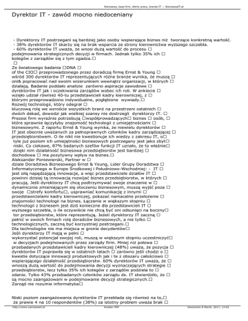 Warszawa, baza firm, oferty pracy, branża IT :: WarszawaIT.pl Dyrektor IT - zawód mocno niedoceniany - Dyrektorzy IT postrzegani są bardziej jako osoby wspierające biznes niż tworzące konkretną wartość. - 38% dyrektorów IT skarży się na brak wsparcia ze strony kierownictwa wyższego szczebla. - 60% dyrektorów IT uważa, że wnosi dużą wartość do procesu podejmowania strategicznych decyzji w firmach. Jednak tylko 35% ich kolegów z zarządów się z tym zgadza. Ze światowego badania DNA of the CIO przeprowadzonego przez doradczą firmę Ernst & Young wśród 300 dyrektorów IT reprezentujących różne branże wynika, że muszą oni& popracować nad swoim wizerunkiem wewnątrz organizacji, w których działają. Badanie poddało analizie zarówno aspiracje zawodowe dyrektorów IT jak i oczekiwania zarządów wobec ich roli. W ankiecie wzięło udział również 40-tu przedstawicieli kadry kierowniczej, z którymi przeprowadzono indywidualne, pogłębione wywiady. Rozwój technologii, który odegrał kluczową rolę we wzroście wszystkich branż na przestrzeni ostatnich dwóch dekad, dowodzi jak wielkiej szansy nie dostrzegli dyrektorzy IT. Prezesi firm wyraźnie potrzebują współprowadzących biznes osób, które sprawnie łączyłyby znajomość technologii z umiejętnościami biznesowymi. Z raportu Ernst & Young wynika, że niewielu dyrektorów IT jest obecnie uważanych za pełnoprawnych członków kadry zarządzającej przedsiębiorstwem. O ile nikt nie kwestionuje ich wiedzy z zakresu IT, o tyle już poziom ich umiejętności biznesowych postrzegany jest jako zbyt niski. Co ciekawe, 87% badanych szefów funkcji IT uznało, że to właśnie dzięki nim działalność biznesowa przedsiębiorstw jest bardziej dochodowa ma pozytywny wpływ na biznes. Aleksander Poniewierski, Partner w dziale Doradztwa Biznesowego Ernst & Young, Lider Grupy Doradztwa Informatycznego w Europe Środkowej i Południowo-Wschodniej: - IT jest siłą napędzającą innowacje, a więc przedstawiciele działów IT powinni dzisiaj tą innowacją rozwijać biznes przedsiębiorstw, w których pracują. Jeśli dyrektorzy IT chcą podtrzymywać swoje znaczenie w dynamicznie zmieniającym się otoczeniu biznesowym, muszą wyjść poza swoje strefy komfortu, usprawniać komunikację z innymi przedstawicielami kadry kierowniczej, pokazać namacalne przełożenie znajomości technologii na biznes. Łączenie w większym stopniu technologii z biznesem jest dziś konieczne dla przedstawicieli IT wyższego szczebla, o ile oczywiście nie chcą być oni odsunięci na boczny tor przedsiębiorstw, które reprezentują. Jeżeli dyrektorzy IT zaczną pełnić w swoich firmach rolę doradców biznesowych, a nie tylko technologicznych, zaczną być korzystniej postrzegani. Dla technologów nie ma miejsca w gronie decydentów Jeśli dyrektorzy IT mają w pełni wykorzystać potencjał swojej roli, muszą w większym stopniu uczestniczyć w decyzjach podejmowanych przez zarządy firm. Mniej niż połowa przebadanych przedstawicieli kadry kierowniczej (48%) uważa, że pozycja dyrektorów IT poprawiła się w ostatnich latach zarówno jeśli chodzi o kwestie dotyczące innowacji produktowych jak i te z obszaru całościowo wspierającego działalność przedsiębiorstw. 60% dyrektorów IT uważa, że wnoszą dużą wartość do podejmowania decyzji wyznaczających strategie przedsiębiorstw, lecz tylko 35% ich kolegów z zarządów podziela to zdanie. Tylko 43% przebadanych członków zarządu ds. IT stwierdziło, że są mocno zaangażowani w podejmowanie decyzji strategicznych. Zarząd nie rozumie informatyka Niski poziom zaangażowania dyrektorów IT przekłada się również na to, że prawie 4 na 10 respondentów (38%) za istotny problem uważa brak http://www.warszawait.pl Kreator PDF Utworzono 8 March, 2017, 13:02 Warszawa, baza firm, oferty pracy, branża IT :: WarszawaIT.pl wsparcia ze strony kadry kierowniczej, szczególnie w większych firmach, gdzie przychody sięgają ponad miliarda dolarów (46%). Większość liderów stara się ograniczać dyskusje z członkami zarządu ds. IT do tematów związanych z budżetami IT, nie poruszają natomiast kwestii dotyczących wartości technologii i sposobu, w jaki może ona przyczyniać się do wzrostu i rozwoju przedsiębiorstw. Zarządy firm postrzegają IT jako centrum kosztów. Jedynie kilku ze znanych mi CIO udało się uczynić z IT akceleratora dla przychodów firmy, w której pracują. Ten kierunek (nie tylko redukcja kosztów ale przede wszystkim wzrost przychodów) to przyszłość roli IT w firmach dodaje Aleksander Poniewierski. CIO musi wyciągnąć rękę do& prezesa Członkowie zarządu ds. IT przyznali też, że trudno będzie zmienić powszechnie panującą opinię, że ich funkcja sprowadza się jedynie do kontrolowania budżetów przeznaczanych na IT. W przeszłości liderzy działów IT niedostatecznie starali się wyjść naprzeciw pozostałym członkom zarządu i stworzyć z nimi długoterminowe relacje, które mogłyby pomóc we wprowadzaniu istotnych dla przedsiębiorstw zmian. Ponieważ w przeszłości funkcja dyrektorów IT sprowadzała się głównie do kontrolowania kosztów, bliższe relacje nawiązali oni z dyrektorami finansowymi. Z przeprowadzonego przez Ernst & Young badania wynika, że udział w rozmowach z innymi członkami zarządu mógłby w końcu wywołać tematy dotyczące przełożenia znajomości technologii na biznes. 48% przebadanych członków zarządu jest zdania, że dyrektorzy IT nie wystarczająco angażują się w dyskusje dotyczące wyzwań oraz wydajności ich przedsiębiorstw. Potrzebna aktualizacja oprogramowania 79% przepytanych dyrektorów ds. IT zdecydowanie zgodziło się, że muszą poprawić umiejętność komunikacji, a 81% stwierdziło, że na udoskonalenie zasługują również ich zdolności przywódcze. Co ciekawe, dyrektorzy IT nie uznali że w podobnie wysokim stopniu kluczowe jest pogłębianie