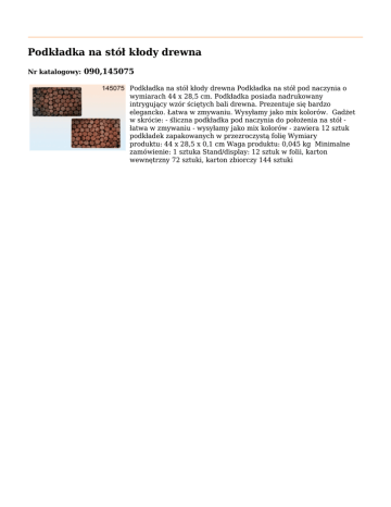 Podkładka na stół kłody drewna Nr katalogowy: 090,145075 Podkładka na stół kłody drewna Podkładka na stół pod naczynia o wymiarach 44 x 28,5 cm. Podkładka posiada nadrukowany intrygujący wzór ściętych bali drewna. Prezentuje się bardzo elegancko. Łatwa w zmywaniu. Wysyłamy jako mix kolorów. Gadżet w skrócie: - śliczna podkładka pod naczynia do położenia na stół łatwa w zmywaniu - wysyłamy jako mix kolorów - zawiera 12 sztuk podkładek zapakowanych w przezroczystą folię Wymiary produktu: 44 x 28,5 x 0,1 cm Waga produktu: 0,045 kg Minimalne zamówienie: 1 sztuka Stand/display: 12 sztuk w folii, karton wewnętrzny 72 sztuki, karton zbiorczy 144 sztuki