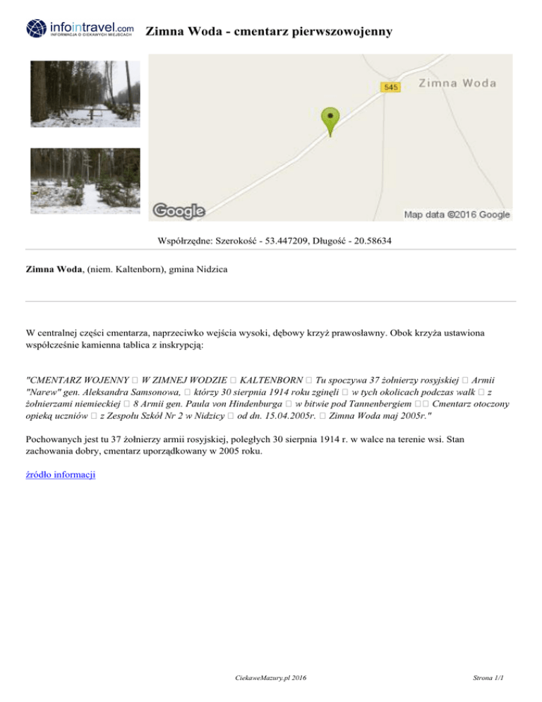 Zimna Woda - cmentarz pierwszowojenny Współrzędne: Szerokość - 53.447209, Długość - 20.58634 Zimna Woda, (niem. Kaltenborn), gmina Nidzica W centralnej części cmentarza, naprzeciwko wejścia wysoki, dębowy krzyż prawosławny. Obok krzyża ustawiona współcześnie kamienna tablica z inskrypcją: "CMENTARZ WOJENNY W ZIMNEJ WODZIE KALTENBORN Tu spoczywa 37 żołnierzy rosyjskiej Armii "Narew" gen. Aleksandra Samsonowa, którzy 30 sierpnia 1914 roku zginęli w tych okolicach podczas walk z żołnierzami niemieckiej 8 Armii gen. Paula von Hindenburga w bitwie pod Tannenbergiem Cmentarz otoczony opieką uczniów z Zespołu Szkół Nr 2 w Nidzicy od dn. 15.04.2005r. Zimna Woda maj 2005r." Pochowanych jest tu 37 żołnierzy armii rosyjskiej, poległych 30 sierpnia 1914 r. w walce na terenie wsi. Stan zachowania dobry, cmentarz uporządkowany w 2005 roku. źródło informacji CiekaweMazury.pl 2016 Strona 1/1