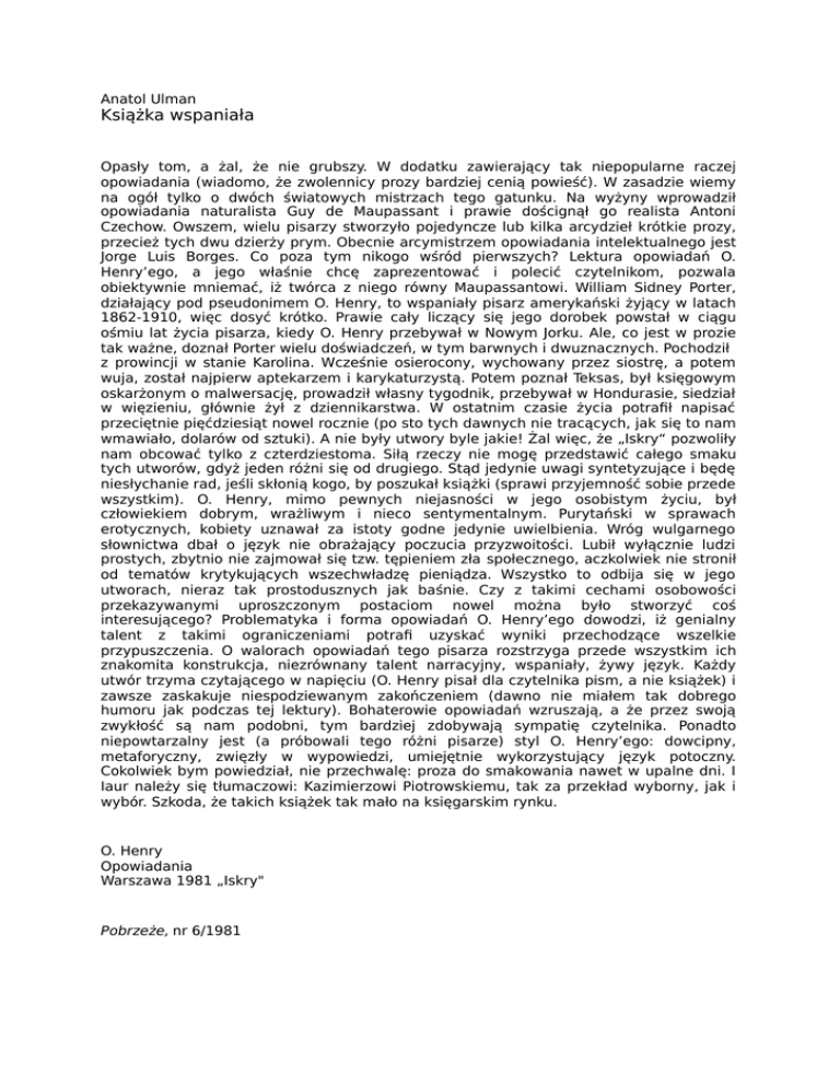 Anatol Ulman Książka wspaniała Opasły tom, a żal, że nie grubszy. W dodatku zawierający tak niepopularne raczej opowiadania (wiadomo, że zwolennicy prozy bardziej cenią powieść). W zasadzie wiemy na ogół tylko o dwóch światowych mistrzach tego gatunku. Na wyżyny wprowadził opowiadania naturalista Guy de Maupassant i prawie doścignął go realista Antoni Czechow. Owszem, wielu pisarzy stworzyło pojedyncze lub kilka arcydzieł krótkie prozy, przecież tych dwu dzierży prym. Obecnie arcymistrzem opowiadania intelektualnego jest Jorge Luis Borges. Co poza tym nikogo wśród pierwszych? Lektura opowiadań O. Henry’ego, a jego właśnie chcę zaprezentować i polecić czytelnikom, pozwala obiektywnie mniemać, iż twórca z niego równy Maupassantowi. William Sidney Porter, działający pod pseudonimem O. Henry, to wspaniały pisarz amerykański żyjący w latach 1862-1910, więc dosyć krótko. Prawie cały liczący się jego dorobek powstał w ciągu ośmiu lat życia pisarza, kiedy O. Henry przebywał w Nowym Jorku. Ale, co jest w prozie tak ważne, doznał Porter wielu doświadczeń, w tym barwnych i dwuznacznych. Pochodził z prowincji w stanie Karolina. Wcześnie osierocony, wychowany przez siostrę, a potem wuja, został najpierw aptekarzem i karykaturzystą. Potem poznał Teksas, był księgowym oskarżonym o malwersację, prowadził własny tygodnik, przebywał w Hondurasie, siedział w więzieniu, głównie żył z dziennikarstwa. W ostatnim czasie życia potrafił napisać przeciętnie pięćdziesiąt nowel rocznie (po sto tych dawnych nie tracących, jak się to nam wmawiało, dolarów od sztuki). A nie były utwory byle jakie! Żal więc, że „Iskry“ pozwoliły nam obcować tylko z czterdziestoma. Siłą rzeczy nie mogę przedstawić całego smaku tych utworów, gdyż jeden różni się od drugiego. Stąd jedynie uwagi syntetyzujące i będę niesłychanie rad, jeśli skłonią kogo, by poszukał książki (sprawi przyjemność sobie przede wszystkim). O. Henry, mimo pewnych niejasności w jego osobistym życiu, był człowiekiem dobrym, wrażliwym i nieco sentymentalnym. Purytański w sprawach erotycznych, kobiety uznawał za istoty godne jedynie uwielbienia. Wróg wulgarnego słownictwa dbał o język nie obrażający poczucia przyzwoitości. Lubił wyłącznie ludzi prostych, zbytnio nie zajmował się tzw. tępieniem zła społecznego, aczkolwiek nie stronił od tematów krytykujących wszechwładzę pieniądza. Wszystko to odbija się w jego utworach, nieraz tak prostodusznych jak baśnie. Czy z takimi cechami osobowości przekazywanymi uproszczonym postaciom nowel można było stworzyć coś interesującego? Problematyka i forma opowiadań O. Henry’ego dowodzi, iż genialny talent z takimi ograniczeniami potrafi uzyskać wyniki przechodzące wszelkie przypuszczenia. O walorach opowiadań tego pisarza rozstrzyga przede wszystkim ich znakomita konstrukcja, niezrównany talent narracyjny, wspaniały, żywy język. Każdy utwór trzyma czytającego w napięciu (O. Henry pisał dla czytelnika pism, a nie książek) i zawsze zaskakuje niespodziewanym zakończeniem (dawno nie miałem tak dobrego humoru jak podczas tej lektury). Bohaterowie opowiadań wzruszają, a że przez swoją zwykłość są nam podobni, tym bardziej zdobywają sympatię czytelnika. Ponadto niepowtarzalny jest (a próbowali tego różni pisarze) styl O. Henry’ego: dowcipny, metaforyczny, zwięzły w wypowiedzi, umiejętnie wykorzystujący język potoczny. Cokolwiek bym powiedział, nie przechwalę: proza do smakowania nawet w upalne dni. I Iaur należy się tłumaczowi: Kazimierzowi Piotrowskiemu, tak za przekład wyborny, jak i wybór. Szkoda, że takich książek tak mało na księgarskim rynku. O. Henry Opowiadania Warszawa 1981 „Iskry" Pobrzeże, nr 6/1981