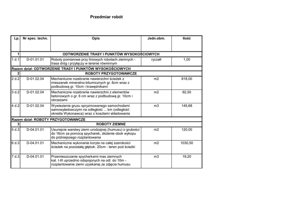 Przedmiar robót Lp. Nr spec. techn. 1 1 d.1 D-01.01.01 Opis Jedn.obm. ODTWORZENIE TRASY I PUNKTÓW WYSOKOŚCIOWYCH ryczałt Roboty pomiarowe przy liniowych robotach ziemnych trasa dróg i przyłączy w terenie równinnym Ilość 1,00 Razem dział: ODTWORZENIE TRASY I PUNKTÓW WYSOKOŚCIOWYCH 2 ROBOTY PRZYGOTOWAWCZE 2 d.2 D-01.02.04 Mechaniczne rozebranie nawierzchni ścieżek z mieszanek mineralno-bitumicznych gr. 6cm wraz z podbudową gr. 10cm i krawężnikami m2 818,00 3 d.2 D-01.02.04 Mechaniczne rozebranie nawierzchni z elementów betonowych o gr. 6 cm wraz z podbudową gr. 10cm i obrzeżami m2 92,50 4 d.2 D-01.02.04 Wywiezienie gruzu spryzmowanego samochodami samowyładowczymi na odległość ... km (odległość określa Wykonawca) wraz z kosztami składowania m3 145,68 Razem dział: ROBOTY PRZYGOTOWAWCZE 3 ROBOTY ZIEMNE 5 d.3 D-04.01.01 Usunięcie warstwy ziemi urodzajnej (humusu) o grubości do 16cm za pomocą spycharek, złożenie obok wykopu do późniejszego rozplantowania m2 120,00 6 d.3 D-04.01.01 Mechaniczne wykonanie koryta na całej szerokości ścieżek na pozostałą głębok. 20cm - teren pod ścieżki m2 1030,50 7 d.3 D-04.01.01 Przemieszczanie spycharkami mas ziemnych kat. I-III uprzednio odspojonych na odl. do 10m rozplantowanie ziemi uzyskanej ze zdjęcia humusu m3 19,20 8 d.3 D-04.01.01 Roboty ziemne wykonywane koparkami podsiębiernymi o poj.łyżki 0.60 m3 w gr.kat. I-III w ziemi uprzednio zmagazynowanej w hałdach z transportem urobku na odległość ... km (odległość określa Wykonawca) wraz z kosztami składowania Razem dział: ROBOTY ZIEMNE 4 9 d.4 D-04.02.01 10 d.4 D-04.04.02 m3 206,10 m2 1030,50 m2 1030,50 m2 1030,50 m 886,00 PODBUDOWA Warstwy odsączające wykonane i zagęszczane mechanicznie o gr. 10 cm Warstwa górna podbudowy z kruszywa łamanego bazaltowego 0/31,5 gr. 15cm Razem dział: PODBUDOWA 5 11 d.5 D-05.03.23A NAWIERZCHNIA Nawierzchnia z kostki brukowej betonowej gr.8cm układana mechanicznie na podsypce z miału kamiennego 0/4mm gr.3 cm Razem dział: NAWIERZCHNIA 6 12 d.6 D-08.03.01 Razem dział: OBRZEŻA OBRZEŻA Obrzeża betonowe o wymiarach 30x8 cm na ławie betonowej C16/20 i podsypce cementowo-piaskowej, spoiny wypełnione zaprawą cementową