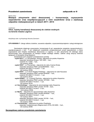 Przedmiot zamówienia załącznik nr 9 Nazwa usług : BieŜące utrzymanie sieci deszczowej – konserwacja, czyszczenie separatorów oraz współpracujących z nimi osadników wraz z utylizacją odpadów niebezpiecznych w latach 2011- 2014 Lokalizacja : Ulice, wyloty kanalizacji deszczowej do cieków wodnych na terenie miasta Legnica Klasyfikacja robót wg Wspólnego Słownika Zamówień : CPV-9000000-7- Usługi odbioru ścieków, usuwania odpadów, czyszczenia/sprzątania i usługi ekologiczne Zamówienie obejmuje czyszczenie, konserwacje 8 szt. separatorów związków ropopochodnych i współpracujących z nimi 7 szt. odrębnych osadników umiejscowionych przed separatorami, w które wyposaŜona jest miejska kanalizacja deszczowa w Legnicy, w celu utrzymania ich dobrego stanu technicznego oraz prowadzenie na bieŜąco ksiąŜki kaŜdego obiektu. Zakres usług dotyczy terenów będących w Zarządzie Dróg Miejskich. Zestawienie tych urządzeń przedstawiono poniŜej - wylot KD11 – ul. Wrocławska -Wandy, włączenie do potoku Kopanina separator lamelowy Ecopur 100-1000 – 1szt., osadnik Os 11000 – 1szt., rok budowy 2008r - wylot KD27 – ul. Poznańska , włączenie do cieku Czarna Woda separator lamelowy PSW Lamela90/900S – 1szt., osadnik DN 2500 V=10,0m3 – 1 szt. rok budowy 2009r - wylot KD51 – ul. II Armii Wojska Polskiego – włączenie do rzeki Kaczawa separator lamelowy PSW Lamela 40/400S – 1szt., osadnik DN 2500 V=10,0m3 – 1 szt. rok budowy 2010r - wylot KD69/1 – ul. V Dywizji Piechoty– włączenie do potoku Kopanina separator lamelowy PSW Lamela 10/100S – 1szt., osadnik DN 2000 V=5,0m3 – 1 szt. rok budowy 2010r - ul. Gumińskiego – włączenie do zarurowanego cieku Kopanina separator lamelowy PSW Lamela 15/150 – 2szt., osadnik DN 2000 V=5,0m3 – 2 szt., - rok budowy 2008r - ul. Myrka - włączenie do zarurowanego cieku Kopanina separator lamelowy PSW Lamela 40/400S – 1szt., osadnik DN 2000 V=5,0m3 – 1 szt. rok budowy 2007r, separator lamelowy PSW Lamela 15/150 – 1szt., osadnik DN 2000 V=5,0m3 – 1 szt. rok budowy 2006r - ul. Pszczelarska – włączenie do potoku Pawłówka separator koalescencyjny Magnus-tech ATOL-OH 6/60 – 1szt., rok budowy 2009r Szczegółowy zakres przedmiotu zamówienia Niniejsze zamówienie dotyczy jednokrotnego w 2011r oraz przeprowadzanie 2 razy w 2012, 2013, 2014roku czyszczenie separatorów i osadników, przeglądów eksploatacyjnych urządzeń oczyszczających, prowadzenie rejestru czynności związanych z eksploatacją urządzeń oczyszczających. Oczyszczanie jednego separatora i osadnika obejmuje: dojazd na miejsce wykonania usługi, oznakowanie miejsca robót, zdjęcie włazu i oczyszczenie urządzeń, zebranie i wywóz zanieczyszczeń, załoŜenie włazu, utylizacja odpadów zgodnie z ustawą o odpadach. Przy kalkulacji ceny jednostkowej za usługę naleŜy uwzględnić: -roboty przygotowawcze, oznakowanie robót, -dostawę i pracę sprzętu do wykonania robót, -oczyszczenie urządzenia, -odbiór oraz utylizację odpadów, -kontrolę stanu technicznego urządzenia, -odtransportowanie sprzętu z miejsca robót. Szczegółowy zakres obowiązków Wykonawcy składający się na przedmiot zamówienia przedstawia się następująco: - dokładne badanie optyczne stanu technicznego włazów; - kontrola ilości szlamu i osadu; - usunięcie zgromadzonych w separatorze związków ropopochodnych – odpompowanie zawartości separatora, usunięcie szlamów, osadów i wody, - wyciągnięcie sekcji Ŝaluzjowych, wkładu lamelowego i ich oczyszczenie, - oczyszczenie i osuszenie poszczególnych komór separatora, - optyczne sprawdzenie powłoki wewnętrznej separatora, - ewentualne wykonanie innych prac konserwatorskich, niezbędnych dla prawidłowego działania separatora, - zamontowanie sekcji Ŝaluzjowych, włoŜenie filtru lamelowego, - napełnienie separatora wodą, aŜ do przelewu na wylocie, - sprawdzenie poprawności działania całego urządzenia, - usunięcie zawartości odrębnych osadników, usunięcie szlamów,osadów i wody, - czyszczenie osadnika, - optyczne sprawdzenie powłoki wewnętrznej osadnika, - załoŜenie włazów, - transport osadów do neutralizacji, - unieszkodliwienie odebranych odpadów niebezpiecznych, - uporządkowanie terenu wokół separatora i osadnika, koszenie traw na terenie separatora i osadnika, - inne prace związane z utrzymaniem separatorów i osadników powstałe na skutek np. awarii, wandalizmu itp. - sporządzenie dokumentów związanych z konserwacją separatora i odbiorem odpadów niebezpiecznych (wymaganych prawem) i niezwłoczne przekazanie ich Zamawiającemu, - dokonanie przeglądu eksploatacyjnego separatorów i osadników, okresowa kontrola stanu napełnienia osadnika szlamem i substancjami ropopochodnymi separatora, - przy kalkulowaniu ceny za wykonanie zamówienia Wykonawca musi uwzględnić kwotę zakupu wody do zalania separatorów oraz koszt energii elektrycznej, które zabezpieczy we własnym zakresie. Wykonawca ponosi wszelkie koszty związane z: a) Wykonaniem tymczasowej organizacji ruchu (w zakresie wynikającym z potrzeb zamówienia) oraz zabezpieczeniem i oznakowaniem terenu usługi, b) Transportem i unieszkodliwianiem odpadów niebezpiecznych, c) przyjęciem osadów na Składowisko Odpadów d) Naprawę urządzeń kanalizacyjnych i drogowych w przypadku wystąpienia awarii w trakcie prowadzonych prac konserwacyjnych i w okresie rękojmi Zamówienie naleŜy wykonać zgodnie z Polskimi Normami, wytycznymi określonymi w tomie II warunków technicznych wykonania i odbioru robót budowlano-montaŜowych – Instalacje sanitarne i przemysłowe. Termin wykonania zamówienia od daty zawarcia umowy do 31 grudnia 2014r Zestawienie wylotów kanalizacji deszczowej do cieków wodnych Nr wylotu do Km zrzutu cieku wodnego w Opis – lokalizacja Zamontowane urządzenia zarządzie ZDM KOPANINA KD11 4+345 KD2 3+535 KD3 3+995 KD4 3+785 Poligonowa, dopływ kolektora kan. deszcz. 