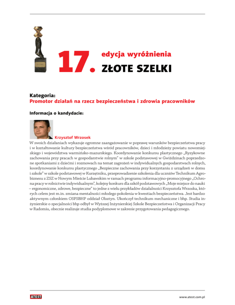 17. edycja wyróżnienia ZŁOTE SZELKI Kategoria: Promotor działań na rzecz bezpieczeństwa i zdrowia pracowników Informacja o kandydacie: Krzysztof Wrzosek W swoich działaniach wykazuje ogromne zaangażowanie w poprawę warunków bezpieczeństwa pracy i w kształtowanie kultury bezpieczeństwa wśród pracowników, dzieci i młodzieży powiatu nowomiej‑ skiego i województwa warmińsko‑mazurskiego. Koordynowanie konkursu plastycznego „Ryzykowne zachowania przy pracach w gospodarstwie rolnym” w szkole podstawowej w Gwiździnach poprzedzo‑ ne spotkaniami z dziećmi i rozmowach na temat zagrożeń w indywidualnych gospodarstwach rolnych, koordynowanie konkursu plastycznego „Bezpieczne zachowania przy korzystaniu z urządzeń w domu i szkole” w szkole podstawowej w Kurzętniku, przeprowadzenie szkolenia dla uczniów Technikum Agro‑ biznesu z ZSZ w Nowym Mieście Lubawskim w ramach programu informacyjno‑promocyjnego „Ochro‑ na pracy w rolnictwie indywidualnym”, kolejny konkurs dla szkół podstawowych „Moje miejsce do nauki – ergonomiczne, zdrowe, bezpieczne” to jedne z wielu przykładów działalności Krzysztofa Wrzoska, któ‑ rych celem jest m.in. zmiana mentalności młodego pokolenia w kwestiach bezpieczeństwa. Jest bardzo aktywnym członkiem OSPSBHP oddział Olsztyn. Ukończył technikum mechaniczne i bhp. Studia in‑ żynierskie o specjalności bhp odbył w Wyższej Inżynierskiej Szkole Bezpieczeństwa i Organizacji Pracy w Radomiu, obecnie realizuje studia podyplomowe w zakresie przygotowania pedagogicznego. www.atest.com.pl