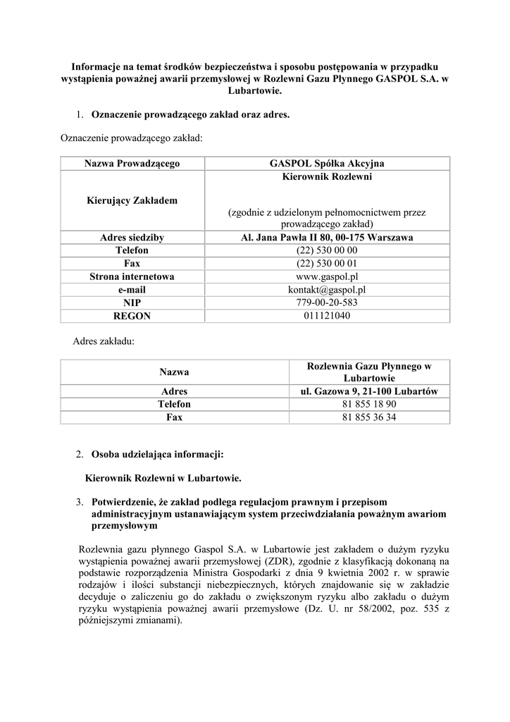 Informacje na temat środków bezpieczeństwa i sposobu postępowania w przypadku wystąpienia poważnej awarii przemysłowej w Rozlewni Gazu Płynnego GASPOL S.A. w Lubartowie. 1. Oznaczenie prowadzącego zakład oraz adres. Oznaczenie prowadzącego zakład: Nazwa Prowadzącego GASPOL Spółka Akcyjna Kierownik Rozlewni Kierujący Zakładem Adres siedziby Telefon Fax Strona internetowa e-mail NIP REGON (zgodnie z udzielonym pełnomocnictwem przez prowadzącego zakład) Al. Jana Pawła II 80, 00-175 Warszawa (22) 530 00 00 (22) 530 00 01 www.gaspol.pl [email protected] 779-00-20-583 011121040 Adres zakładu: Nazwa Adres Telefon Fax Rozlewnia Gazu Płynnego w Lubartowie ul. Gazowa 9, 21-100 Lubartów 81 855 18 90 81 855 36 34 2. Osoba udzielająca informacji: Kierownik Rozlewni w Lubartowie. 3. Potwierdzenie, że zakład podlega regulacjom prawnym i przepisom administracyjnym ustanawiającym system przeciwdziałania poważnym awariom przemysłowym Rozlewnia gazu płynnego Gaspol S.A. w Lubartowie jest zakładem o dużym ryzyku wystąpienia poważnej awarii przemysłowej (ZDR), zgodnie z klasyfikacją dokonaną na podstawie rozporządzenia Ministra Gospodarki z dnia 9 kwietnia 2002 r. w sprawie rodzajów i ilości substancji niebezpiecznych, których znajdowanie się w zakładzie decyduje o zaliczeniu go do zakładu o zwiększonym ryzyku albo zakładu o dużym ryzyku wystąpienia poważnej awarii przemysłowe (Dz. U. nr 58/2002, poz. 535 z późniejszymi zmianami). Zgodnie z wymaganiami prawnymi wszystkie obowiązki spoczywające na prowadzącym zakład zostały zrealizowane. Lubelski Komendant Wojewódzki Państwowej Straży Pożarnej w Lublinie wydał, na podstawie pozytywnej opinii Wojewódzkiego Inspektora Ochrony Środowiska w Lublinie, decyzję nr WZ.5586.9.2013 z dnia 05 września 2013 r. zatwierdzającą Raport o Bezpieczeństwie dla Rozlewni Gazu Płynnego w Lubartowie. Stanowi to potwierdzenie dopełnienia wszystkich obowiązków spoczywających na prowadzącym „zakład o dużym ryzyku". 4. Charakter działalności w Rozlewni Gazu Płynnego w Lubartowie GASPOL S.A. prowadzi działalność opartą na dystrybucji rozwiązań energetycznych, a w jednostkach operacyjnych/zakładach prowadzimy szereg operacji technologicznych związanych z dystrybucją gazu płynnego. Do podstawowej działalności operacyjnej w Rozlewni Gazu Płynnego w Lubartowie zaliczamy: 1. rozładunki cystern drogowych i przepompowywanie gazu płynnego do zbiorników ciśnieniowych 2. magazynowanie gazu płynnego w ciśnieniowych zbiornikach magazynowych 3. załadunki cystern drogowych gazem płynnych 4. rozlewanie gazu płynnego do butli gazowych (napełnianie butli gazowych gazem płynnym) 5. Rodzaje substancji niebezpiecznych występujących na terenie terminala W Rozlewni Gazu Płynnego w Lubartowie znajdują się następujące substancje niebezpieczne: Skroplone gazy węglowodorowe : Propan techniczny , propan-butan: są to substancje skrajnie łatwo palne, które w połączeniu z powietrzem tworzą mieszaniny wybuchowe, lub palne; są cięższe od powietrza, a więc mogą zalegać w zagłębieniach terenu. Główne produkty Gaz propan techniczny ( luzem) w cysternach drogowych Gaz propan-butan (luzem) w cysternach drogowych Gaz propan techniczny w butlach o ładowności 10 kg i 30 kg Gaz propan-butan w butlach o ładowności: 2 kg , 3 kg, 11 kg i 30 kg 6. Informacje związane z charakterem zagrożenia poważną awarią z uwzględnieniem skutków dla ludzi i środowiska Substancje znajdujące się na terenie rozlewni gazu w Lubartowie stwarzają zagrożenia, ale zagrożenia mogące wystąpić na terenie rozlewni w większości przypadków awaryjnych nie zagrażają osobom i obiektom poza terenem zakładu. Wyjątkiem są następujące zdarzenia awaryjne: 1. wybuch „BLEVE" zbiornika kulistego V=600m³, dla którego strefy zagrożenia obejmują tereny wokół rozlewni: o w promieniu 3200 m , dla fali nadciśnienia o wartości 2 kPa spowodowanej wybuchem. W zasięgu strefy nadciśnienia 2 kPa znajdują się miejscowości m.in.: Skrobów, Lisów, Wincentów, miasto Lubartów, Kol. Annobór, Annobór, Nowodwór- Piaski, Nowodwór ,Łucka ; w zasięgu strefy nadciśnienia 2 kPa możliwe jest pękanie 10% powierzchni szklanych i urazy wśród ludzi od odłamków szklanych. o w promieniu 1400 m , dla fali nadciśnienia o wartości 5kPa W zasięgu strefy nadciśnienia 5 kPa, znajdują się miejscowości i osiedla m.Lubartowa , m.in.: - od wschodu i płd.-wschodu : zachodnia część m. Lubartów (granica ul. Legionów) ,część Os.3-Maja , część Os. Powstańców W-wy, bloki mieszkalne przy ul. Nowodworskiej , zakłady przemysłowe i obiekty handlowe w strefie przemysłowo-handlowej przy ul. Nowodworskiej , ul. Krańcowej i ul. Kozłowieckiej , od północy : Os. Zwycięstwa, Os. Lipowa , - od zachodu Kol. Nowodwór Piaski, Kol. Skrobów ; W obszarze tym możliwe są poważniejsze zniszczenia stolarki okiennej oraz zniszczenia powierzchni szklanych, a także możliwość powstania urazów u ludzi. o w promieniu 1400 m , dla fali nadciśnienia o wartości 5kPa W zasięgu strefy nadciśnienia 5 kPa, znajdują się miejscowości i osiedla m.Lubartowa , m.in.: - od wschodu i płd.-wschodu : zachodnia część m. Lubartów (granica ul. Legionów) ,część Os.3-Maja , część Os. Powstańców W-wy, bloki mieszkalne przy ul. Nowodworskiej , zakłady przemysłowe i obiekty handlowe w strefie przemysłowo-handlowej przy ul. Nowodworskiej , ul. Krańcowej i ul. Kozłowieckiej , Os. Lipowa , od północy : Os. Zwycięstwa, - od zachodu Kol. Nowodwór Piaski, Kol. Skrobów ; W obszarze tym możliwe są poważniejsze zniszczenia stolarki okiennej oraz zniszczenia powierzchni szklanych, a także możliwość powstania urazów u ludzi. o w promieniu 600 m , dla fali nadciśnienia o wartości 10 kPa W zasięgu strefy nadciśnienia 10 kPa, znajdują się obiekty przemysłowohandlowe przy ul. Nowodworskiej i ul. Gazowej : SOLB