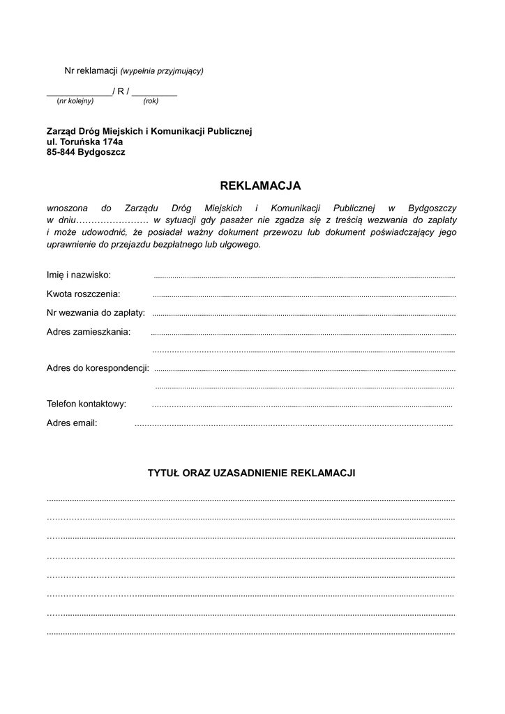 Nr reklamacji (wypełnia przyjmujący) _____________/ R / _________ (nr kolejny) (rok) Zarząd Dróg Miejskich i Komunikacji Publicznej ul. Toruńska 174a 85-844 Bydgoszcz REKLAMACJA wnoszona do Zarządu Dróg Miejskich i Komunikacji Publicznej w Bydgoszczy w dniu…………………… w sytuacji gdy pasażer nie zgadza się z treścią wezwania do zapłaty i może udowodnić, że posiadał ważny dokument przewozu lub dokument poświadczający jego uprawnienie do przejazdu bezpłatnego lub ulgowego. Imię i nazwisko: .................................................................................................................................................. Kwota roszczenia: ................................................................................................................................................... Nr wezwania do zapłaty: ................................................................................................................................................... Adres zamieszkania: .................................................................................................................................................... ………………………………….................................................................................................... Adres do korespondencji: .................................................................................................................................................. ................................................................................................................................................. Telefon kontaktowy: Adres email: ………….…….............................……....................................................................................... ……………….……………………………………………………………………………………………….. TYTUŁ ORAZ UZASADNIENIE REKLAMACJI .................................................................................................................................................................................. ……………................................................................................................................................................................ ……........................................................................................................................................................................... ………………………….............................................................................................................................................. ………………………….............................................................................................................................................. …………………………….......................................................................................................................................... ……........................................................................................................................................................................... .................................................................................................................................................................................. ……........................................................................................................................................................................... ………....................................................................................................................................................................... ………………………….............................................................................................................................................. …………………………….......................................................................................................................................... …………………………….......................................................................................................................................... …………………………….......................................................................................................................................... ………………………….............................................................................................................................................. ………………………….............................................................................................................................................. ………………………….............................................................................................................................................. ………………………................................................................................................................................................. ……………………….................................................................................................................................................. ……………………….................................................................................................................................................. ………………………………………………………………………………………………………………………………….. Wykaz załączonych dokumentów (do reklamacji powinny być dołączone, odpowiednio do przedmiotu roszczenia, oryginały dokumentów dotyczących zawarcia umowy przewozu (w szczególności papierowy bilet na przejazd lub nr Bydgoskiej Karty Miejskiej) oraz potwierdzone kopie innych dokumentów związanych z rodzajem i wysokością roszczenia, w tym poświadczających uprawni