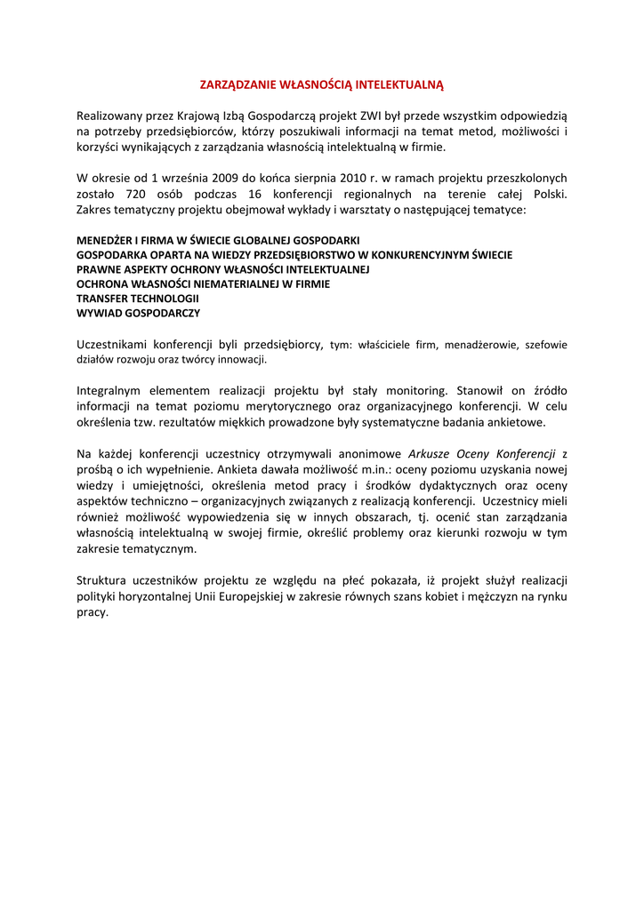 ZARZĄDZANIE WŁASNOŚCIĄ INTELEKTUALNĄ Realizowany przez Krajową Izbą Gospodarczą projekt ZWI był przede wszystkim odpowiedzią na potrzeby przedsiębiorców, którzy poszukiwali informacji na temat metod, możliwości i korzyści wynikających z zarządzania własnością intelektualną w firmie. W okresie od 1 września 2009 do końca sierpnia 2010 r. w ramach projektu przeszkolonych zostało 720 osób podczas 16 konferencji regionalnych na terenie całej Polski. Zakres tematyczny projektu obejmował wykłady i warsztaty o następującej tematyce: MENEDŻER I FIRMA W ŚWIECIE GLOBALNEJ GOSPODARKI GOSPODARKA OPARTA NA WIEDZY PRZEDSIĘBIORSTWO W KONKURENCYJNYM ŚWIECIE PRAWNE ASPEKTY OCHRONY WŁASNOŚCI INTELEKTUALNEJ OCHRONA WŁASNOŚCI NIEMATERIALNEJ W FIRMIE TRANSFER TECHNOLOGII WYWIAD GOSPODARCZY Uczestnikami konferencji byli przedsiębiorcy, tym: właściciele firm, menadżerowie, szefowie działów rozwoju oraz twórcy innowacji. Integralnym elementem realizacji projektu był stały monitoring. Stanowił on źródło informacji na temat poziomu merytorycznego oraz organizacyjnego konferencji. W celu określenia tzw. rezultatów miękkich prowadzone były systematyczne badania ankietowe. Na każdej konferencji uczestnicy otrzymywali anonimowe Arkusze Oceny Konferencji z prośbą o ich wypełnienie. Ankieta dawała możliwość m.in.: oceny poziomu uzyskania nowej wiedzy i umiejętności, określenia metod pracy i środków dydaktycznych oraz oceny aspektów techniczno – organizacyjnych związanych z realizacją konferencji. Uczestnicy mieli również możliwość wypowiedzenia się w innych obszarach, tj. ocenić stan zarządzania własnością intelektualną w swojej firmie, określić problemy oraz kierunki rozwoju w tym zakresie tematycznym. Struktura uczestników projektu ze względu na płeć pokazała, iż projekt służył realizacji polityki horyzontalnej Unii Europejskiej w zakresie równych szans kobiet i mężczyzn na rynku pracy. Spośród respondentów biorących udział w ewaluacji najliczniejszą grupę stanowiły osoby z grupy wiekowej 30 – 50 lat, aż 59%. Osoby z przedziału 51-65 lat oraz do – 30 lat odpowiednio 22% i 18%. Najliczniejszą grupą biorącą udział w projekcie stanowiły osoby z wykształceniem wyższym82%. Respondenci z wykształceniem średnim stanowili pozostałe 18%. Wśród respondentów uczestniczących w projekcie największy procent (40%) stanowiły osoby będące właścicielem firmy bądź pełniące funkcję zarządzającą, następnie kadra kierownicza (27%) i specjaliści (24%). 9% stanowiły osoby zajmujące inne stanowiska w firmie. Ankietowani oceniali program konferencji i metody pracy korzystając ze skali pięciostopniowej, gdzie 1 oznaczało najsłabsza oceną a 5 najlepszą. Należy zauważyć że każdy z poniżej ocenianych obszarów, jak: zdobycie nowej wiedzy, uzyskanie nowych umiejętności oraz metody pracy, rytm pracy i środki dydaktyczne zostały ocenione bardzo pozytywnie otrzymując kolejno oceny: 4,29, 4,06 i 4,40. Można zatem wnioskować, że wiedza zdobyta podczas konferencji była przydatna, rzetelna i w dużej mierze nowa dla większości uczestników. Uczestnicy badania ewaluacyjnego dokonali również subiektywnej oceny największych problemów z zakresu zarządzania własnością intelektualną (ZWI) w swojej firmie. W pierwszej trójce najczęściej wybieranych obszarów były: zbyt mała ilość szkoleń na rynku polskim poświęcona tematyce ZWI -54,88%, zbyt mała wiedza pracowników na temat ZWI 43,23% oraz zbyt mała wiedza kadry zarządzającej na temat ZWI -37,6%. Najrzadziej wybieraną odpowiedzą przez badanych był problem kradzieży intelektualnej stanowiący zaledwie 15,43%. Wyniki uzyskane w tej części ankiety pokazują, że na polskim rynku nadal istnieje duże zapotrzebowanie na konferencje i szkolenia poświęcone tematyce własności intelektualnej w firmach. Ważne jest przedstawienie przedsiębiorcom nie tylko korzyści wynikających z ZWI, ale również zagrożeń, które mogą pojawić się z zaniedbania tej kwestii. Po oszacowaniu problemów związanych z zarządzaniem własnością intelektualną, ankietowani mogli określić kierunki rozwoju ZWI w swojej firmie w najbliższym czasie. Najczęściej wybieraną opcją spośród 8 możliwych było przeprowadzenia akcji informacyjnej na temat ZWI uzyskując wartość 30,99%. Drugą pozycję zajęły szkolenia na temat ZWI z wynikiem 27,24%. Najmniej popularnym kierunkiem okazało się zgłoszenie wynalazku przez firmę, tylko 4,21% odpowiedzi. Poniższe wyniki traktujące o wartości procentowej przychodów jaką stanowi zarządzanie własnością intelektualną w firmie, pokazują jak bardzo zróżnicowana jest sytuacja wśród polskich przedsiębiorców i jak trudne jest to do oszacowania. Najczęściej wybieraną odpowiedzią przez ankietowanych było trudno powiedzieć – aż 30%, co stanowi prawie 1/3 wszystkich ankietowanych. Na wyrównanym poziomie znalazły się kolejno odpowiedzi: 2550% - 19% ankietowanych i po 18% dla przedziału wartości: 11-25% i 50% i więcej. Ostatnim punktem badania ewaluacyjnego była ocena wagi i aktualny stan zarządzania własnością intelektualną w firmie. Wyniki uzyskane na skali wartości (bardzo dobra/duży, dobra/dobry, przeciętna/y, mała/y, bardzo mała/mały) pokazują średni poziom zarówno pierwszego zjawiska jak drugiego. Uzyskane wartości różnią się między sobą 0,03%. Arkusz Oceny Konferencji został przekazany ostatecznym beneficjentom projektu wraz z wszystkimi potrzebnymi materiałami dydaktycznymi. Zapewniono również odpowiednie warunki kształcenia. Wartością dodaną w projekcie stanowiła możliwość indywidualnych konsultacji z ekspertami z zakresu zarządzania własnością intelektualną. O trafności i użyteczności podjętych działań w ramach projektu świadczy pozytywna opinia uczestników badania ewaluacyjnego w obszarze zdobycia nowej wiedzy, 