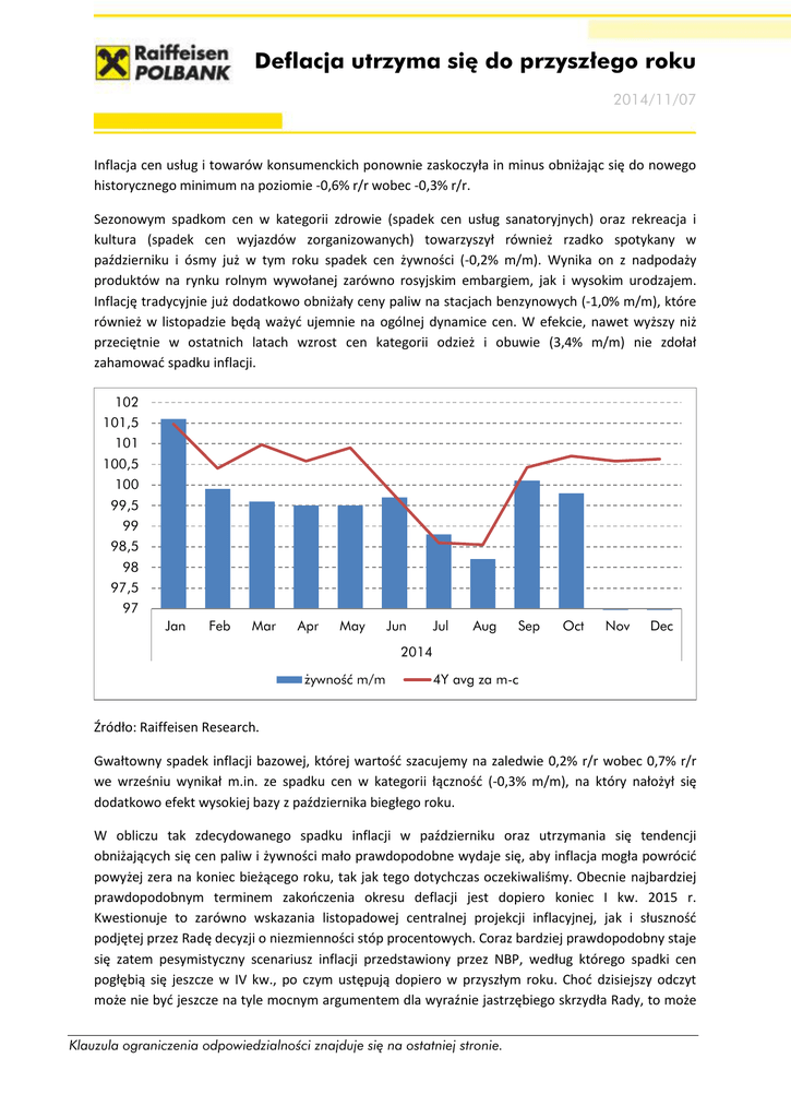 Deflacja utrzyma się do przyszłego roku 2014/11/07 Inflacja cen usług i towarów konsumenckich ponownie zaskoczyła in minus obniżając się do nowego historycznego minimum na poziomie -0,6% r/r wobec -0,3% r/r. Sezonowym spadkom cen w kategorii zdrowie (spadek cen usług sanatoryjnych) oraz rekreacja i kultura (spadek cen wyjazdów zorganizowanych) towarzyszył również rzadko spotykany w październiku i ósmy już w tym roku spadek cen żywności (-0,2% m/m). Wynika on z nadpodaży produktów na rynku rolnym wywołanej zarówno rosyjskim embargiem, jak i wysokim urodzajem. Inflację tradycyjnie już dodatkowo obniżały ceny paliw na stacjach benzynowych (-1,0% m/m), które również w listopadzie będą ważyć ujemnie na ogólnej dynamice cen. W efekcie, nawet wyższy niż przeciętnie w ostatnich latach wzrost cen kategorii odzież i obuwie (3,4% m/m) nie zdołał zahamować spadku inflacji. 102 101,5 101 100,5 100 99,5 99 98,5 98 97,5 97 Jan Feb Mar Apr May Jun Jul Aug Sep Oct Nov Dec 2014 żywność m/m 4Y avg za m-c Źródło: Raiffeisen Research. Gwałtowny spadek inflacji bazowej, której wartość szacujemy na zaledwie 0,2% r/r wobec 0,7% r/r we wrześniu wynikał m.in. ze spadku cen w kategorii łączność (-0,3% m/m), na który nałożył się dodatkowo efekt wysokiej bazy z października biegłego roku. W obliczu tak zdecydowanego spadku inflacji w październiku oraz utrzymania się tendencji obniżających się cen paliw i żywności mało prawdopodobne wydaje się, aby inflacja mogła powrócić powyżej zera na koniec bieżącego roku, tak jak tego dotychczas oczekiwaliśmy. Obecnie najbardziej prawdopodobnym terminem zakończenia okresu deflacji jest dopiero koniec I kw. 2015 r. Kwestionuje to zarówno wskazania listopadowej centralnej projekcji inflacyjnej, jak i słuszność podjętej przez Radę decyzji o niezmienności stóp procentowych. Coraz bardziej prawdopodobny staje się zatem pesymistyczny scenariusz inflacji przedstawiony przez NBP, według którego spadki cen pogłębią się jeszcze w IV kw., po czym ustępują dopiero w przyszłym roku. Choć dzisiejszy odczyt może nie być jeszcze na tyle mocnym argumentem dla wyraźnie jastrzębiego skrzydła Rady, to może Klauzula ograniczenia odpowiedzialności znajduje się na ostatniej stronie. się on już stać wystarczający dla tych, którzy poparli cięcia w październiku, a nie zdecydowali się na to w listopadzie. W tym kontekście istotne będą jeszcze jutrzejsze dane o PKB, jak i odczyt produkcji przemysłowej w przyszłym tygodniu. Wyraźnie niższy od prognoz odczyt inflacji zaszkodził złotemu. Kurs EURPLN wzrósł niemal do 4,23, po wcześniejszej wąskiej konsolidacji przy 4,22. Para póki co pozostaje jednak w kluczowym zakresie 4,20-4,24 i dopiero wybicie z niego istotnie zmieniłoby sytuację w notowaniach. Ważnym impulsem będą jutrzejsze dane o PKB. Michał Burek Dorota Strauch Raiffeisen Polbank ul. Piękna 20. 00-549 Warszawa www.raiffeisenpolbank.com Klauzula Ograniczenia Odpowiedzialności Raiffeisen Bank Polska SA: Niniejsza wiadomość została przesłana zgodnie z Pani/Pana zleceniem. Informujemy, że zgoda na otrzymywanie informacji może zostać w każdej chwili odwołana. Jeżeli nie życzy sobie Pani/ Pan dalszego otrzymywania materiałów przygotowanych przez Zespół Analiz Ekonomicznych Raiffeisen Bank Polska S.A (dalej: RBPL lub Bank) lub niniejszy materiał został wysłany na Pani/Pana adres przez pomyłkę, prosimy o przesłanie e-maila o tytule "REZYGNACJA" na skrzynkę e-mailową: [email protected]. Opracowanie to nie stanowi oferty w rozumieniu art. 66 Kodeksu Cywilnego i zostało przesłane na podstawie ustnej zgody, która w każdej chwili może być odwołana. Ma ono charakter wyłącznie informacyjny. Powielanie bądź publikowanie go lub jego części bez pisemnej zgody Banku jest zabronione. Decyzja inwestycyjna w odniesieniu do papieru wartościowego, produktu finansowego lub inwestycji powinna być podjęta na podstawie opublikowanego prospektu emisyjnego lub kompletnej dokumentacji dla papieru wartościowego, produktu finansowego lub inwestycji. Ostateczna decyzja zawarcia transakcji należy wyłącznie do Klienta. Bank nie występuje w roli pośrednika ani przedstawiciela Klienta. Przed zawarciem każdej transakcji Klient powinien nie opierając się na informacjach przekazanych przez Bank określić jej ryzyko, potencjalne korzyści oraz straty z nią związane, jak również w szczególności charakterystykę, konsekwencje prawne, podatkowe i księgowe transakcji oraz konsekwencje zmieniających się czynników rynkowych, a także w sposób niezależny ocenić czy jest w stanie sam lub po konsultacjach ze swoimi doradcami podjąć takie ryzyko. Niniejszy dokument nie stanowi rekomendacji kupna lub sprzedaży instrumentów finansowych. Dokument, ani żadna z jego części nie stanowi podstawy do zawarcia jakiejkolwiek umowy lub powstania zobowiązania. Opracowanie to nie zastępuje niezbędnych porad odnośnie zakupu lub sprzedaży papieru wartościowego, inwestycji lub innego produktu finansowego. Analiza oparta jest na informacjach publicznie dostępnych – do jej sporządzenia nie wykorzystano żadnych informacji poufnych. Wyrażane opinie są niezależnymi opiniami Banku. W opracowaniu wykorzystano źródła informacji, które Bank uważa za wiarygodne i dokładne, lecz nie istnieje gwarancja, że są one wyczerpujące i w pełni odzwierciedlają stan faktyczny. Wykresy i diagramy przestawione w niniejszym opracowaniu mają charakter wyłącznie ilustracyjny oraz nie są doradztwem inwestycyjnym ani prognozą. Informacje zawarte w tej publikacji są aktualne na datę utworzenia dokumentu i mogą ulec zmianie w przyszłości. Analitycy zatrudnieni przez RBPL nie są wynagradzani z tytułu konkretnych transakcji inwestycyjnych zawartych w związku z niniejszym opracowaniem. Wynagrodzenie autorów niniejszego raportu oparte jest na ogólnym zysku RBPL