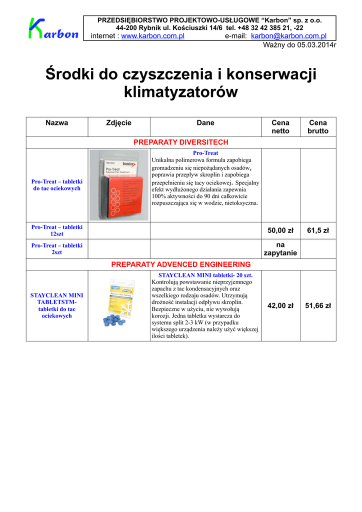 PRZEDSIĘBIORSTWO PROJEKTOWO-USŁUGOWE “Karbon” sp. z o.o. 44-200 Rybnik ul. Kościuszki 14/6 tel. +48 32 42 385 21, -22 internet : www.karbon.com.pl e-mail: [email protected] Ważny do 05.03.2014r Środki do czyszczenia i konserwacji klimatyzatorów Nazwa Zdjęcie Dane Cena netto Cena brutto Pro-Treat – tabletki 12szt 50,00 zł 61,5 zł Pro-Treat – tabletki 2szt na zapytanie PREPARATY DIVERSITECH Pro-Treat – tabletki do tac ociekowych Pro-Treat Unikalna polimerowa formuła zapobiega gromadzeniu się niepożądanych osadów, poprawia przepływ skroplin i zapobiega przepełnieniu się tacy ociekowej. Specjalny efekt wydłużonego działania zapewnia 100% aktywności do 90 dni całkowicie rozpuszczająca się w wodzie, nietoksyczna. PREPARATY ADVENCED ENGINEERING STAYCLEAN MINI TABLETSTMtabletki do tac ociekowych STAYCLEAN MINI tabletki- 20 szt. Kontrolują powstawanie nieprzyjemnego zapachu z tac kondensacyjnych oraz wszelkiego rodzaju osadów. Utrzymują drożność instalacji odpływu skroplin. Bezpieczne w użyciu, nie wywołują korozji. Jedna tabletka wystarcza do systemu split 2-3 kW (w przypadku większego urządzenia należy użyć większej ilości tabletek). 42,00 zł 51,66 zł Nazwa Zdjęcie Dane Cena netto Cena brutto PREPARATY RECTORSEAL RENEWZ zmywacz do lamel skraplaczy RENEWZ zmywacz do lamel skraplaczy Renewz jest bezkwasowym, pieniącym się zmywaczem, przeznaczonym głównie do skraplaczy chłodzonych powietrzem. Powierzchniowo czynna piana tworząca się z Renewz silnie penetruje powierzchnie wymiennika, oddziela brud i tlenki, wypychając je z przestrzeni międzyżebrowych. Renewz skutecznie usuwa trudno zmywalne osady tłuszczu, smoły, brudu z wymienników ciepła zainstalowanych w kuchniach i restauracjach. Skutecznie radzi sobie z osadami tytoniowymi zebranymi na filtrach powietrza. Dodatkowo Renewz rozjaśnia i nabłyszcza powierzchnie wymiennika. Działanie: Czyszczący, odtłuszczający, rozjaśniający. Zastosowanie: Skraplacze, elektroniczne filtry powietrza. RENEWZ aerozol 0,4 l 98,47 zł 121,12 zł RENEWZ 3,8 l 3,8 l 212,00 zł 260,76 zł RENEWZ 5 l 5l 285,00 zł 350,55 zł Nazwa Zdjęcie Dane Cena netto Cena brutto 99,97 zł PREPARATY RECTORSEAL CLEAN-N-SAFE zmywacz do lamel skraplaczy i parowników CLEAN-N-SAFE jest zmywaczem do lamelowych wymienników ciepła, nie zawierającym kwasów i substancji żrących. CLEAN-N-SAFE stosowany jest do miedziano-aluminiowych wymienników ciepła w układach chłodniczych i klimatyzacyjnych. Skutecznie usuwa brud i naloty z rur lub żeber parowników i skraplaczy, rozjaśnia ściemniałe powierzchnie wymienników oraz działa jako inhibitor korozji. Ulega całkowicie biodegradacji i nie stwarza zagrożeń dla ludzi, zwierząt, fauny wodnej i roślin. Nie powoduje korozji wymienników, ani ich obudów, innych części urządzeń, nie niszczy też materiałów pokryć dachowych. Działanie: Czyszczący, rozjaśniający. Zastosowanie: Parowniki, skraplacze. CLEAN-N aerozol aerozol 81,28 zł CLEAN-N-SAFE (3,8 l) koncentrat 3,8 l na zapytanie CLEAN-N-SAFE (5 l) koncentrat 5l 218,40 zł 268,63 zł Nazwa Zdjęcie Dane Cena netto Cena brutto 121,45 zł PREPARATY RECTORSEAL COIL DISINFECTANT zmywacz odkażający do lamel skraplaczy i parowników COIL DISINFECTANT uniwersalny środek o działaniu dezynfekującym, czyszczącym i dezodoryzującym. Zabija bakterie chorobotwórcze i grzyby. Niszczy i powstrzymuje rozwój pleśni oraz związane z tym przykre zapachy. Zapobiega powstawaniu chorób, uczuleń i innych dolegliwości, wywoływanych przez skażone drobnoustrojami powietrze, a przyjemny zapach odświeża powietrze w pomieszczeniach. Działanie: Dezynfekujący (bakteriobójczy, grzybobójczy, pleśniobójczy), czyszczący, odświeżający powietrze. Zastosowanie: Lamelowe wymienniki ciepła, tace ociekowe klimatyzatorów, pompy ciepła, kanały wentylacyjne, urządzenia filtrujące powietrze, wszelkie powierzchnie ze stali nierdzewnej, tworzyw sztucznych, metali, drewna, ceramiki oraz powierzchnie emaliowane. Może być użyty do powierzchni mających kontakt z żywnością. COIL DISINFECTANT aerozol aerozol 98,74 zł COIL DISINFECTANT (3,8 l) koncentrat 3,8 l na zapytanie COIL DISINFECTANT (5 l) koncentrat 5l 252,49 zł 310,56 zł Nazwa Zdjęcie Dane Cena netto Cena brutto 231,24 zł 284,42 zł 190,10 zł 233,82 zł PREPARATY RECTORSEAL CONCOIL zmywacz lamel skraplaczy i elektrofiltrów z wybielaczem CONCOIL pianowy, kwasowy środek czyszczący i rozjaśniający do skraplaczy lamelowych chłodzonych powietrzem, a także do innych powierzchni aluminiowych, miedzianych oraz mosiężnych. Doskonale nadaje się do mycia elektrofiltrów, które przy czyszczeniu tradycyjnym (strumieniem cieczy pod ciśnieniem) łatwo mogą ulec uszkodzeniu. Powierzchniowo aktywna piana dokładnie penetruje przestrzenie pomiędzy lamelami, rozdrabniając wszelkie zanieczyszczenia, ograniczające przedmuch powietrza i umożliwiając spłukanie ich wodą. Con-Coil szybko i efektywnie usuwa brud, resztki owadów, trawę, puch topoli i inne pyłki roślinne, sierść, pióra a także nalot tlenkowy nawet z najbardziej niedostępnych miejsc. Rozjaśnia i nabłyszcza czyszczone powierzchnie. W czasie krótszym niż 5 minut pozostawia je całkowicie czyste, jasne i lśniące a przy tym pozbawione warstwy izolacji cieplnej - poprawiając tym samym wydajność wymiennika i korzystnie wpływając na bezawaryjność pracy i czas eksploatacji całego układu. Działanie: Czyszczący, rozjaśniający, nabłyszczający. Zastosowanie: Skraplacze lamelowe, elektroniczne filtry powietrza, powierzchnie aluminiowe, miedziane oraz mosiężne. CONCOIL (3,8 l) koncentrat 3,8 l COIL-RITE zmywacz parowników COIL-RITE bezkwasowy środek czyszczący i odtłuszczający przeznaczony do baterii skraplaczy i parowaczy, urządzeń do rozdziału powietrza, urządzeń mechanicznych, filtrów powietrza oraz wszelkich powierzchni metalowych. Skutecznie, w ciągu kilku m