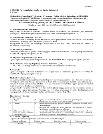D-05.03.23 D-05.03.23 Nawierzchnia z brukowej kostki betonowej 1. Wstęp 1.1. Przedmiot Specyfikacji Technicznej Wykonania i Odbioru Robót Budowlanych (STWiORB) Przedmiotem niniejszej STWiORB są wymagania dotyczące wykonania i odbioru robót związanych z wykonaniem nawierzchni z brukowej kostki betonowej w ramach zadania pn. Przebudowa dróg gminnych - ul. Lipowa i Wrzosowa w Mielcu (działka nr ewid.: 345, 346, 423, 187; obręb: 0005-Smoczka) 1.2. Zakres stosowania STWiORB Specyfikacja Techniczna Wykonania i Odbioru Robót Budowlanych jest stosowana jako Dokument Przetargowy i Kontraktowy przy zlecaniu i realizacji Robót wymienionych w punkcie 1.1. 1.3. Zakres Robót objętych STWiORB Ustalenia zawarte w niniejszej STWiORB dotyczą zasad prowadzenia robót związanych z wykonaniem nawierzchni z brukowej kostki betonowej o grubości 6 i 8 cm. Szczegółowa lokalizacja poszczególnych nawierzchni z brukowej kostki betonowej jak podano w dokumentacji projektowej. 1.4. Określenia podstawowe Określenia podstawowe są zgodne z obowiązującymi odpowiednimi normami i z definicjami podanymi w DM.00.00.00. „Wymagania ogólne” pkt. 1.4. 1.5. Ogólne wymagania dotyczące Robót Ogólne wymagania dotyczące Robót podano w STWiORB D-M.00.00.00 „Wymagania ogólne” pkt. 1.5. 1.6. Kod i nazwa robót wg Wspólnego Słownika Zamówień (CPV) 45 23 32 22-1: Roboty budowlane w zakresie układania chodników i asfaltowania. 2. Materiały Ogólne wymagania dotyczące materiałów, ich pozyskiwania i składowania podano w STWiORB DM.00.00.00. „Wymagania ogólne” pkt. 2. 2.1. Brukowa kostka betonowa Do wykonania robót należy użyć brukowej kostki jednowarstwowej o grubości 6 cm i 8 cm koloru szarego. Wymagania techniczne stawiane betonowym kostkom brukowym, mającym kontakt z solą odladzającą w warunkach mrozu określa norma PN-EN 1338. Do wykonania nawierzchni ciągów pieszo-rowerowych należy stosować kostkę betonową bezfazową. Uwaga: Naloty wapienne (wykwity w postaci białych plam) mogą pojawić się na powierzchni kostek w początkowym okresie eksploatacji. Powstają one w wyniku naturalnych procesów fizykochemicznych występujących w betonie i zanikają w trakcie użytkowania w okresie do 2-3 lat. 2.2.1. Aspekty wizualne Aspekty wizualne 1 Wygląd J 2 Tekstura J 3 Zabarwienie (barwiona może być warstwa ścieralna lub cały element) a) górna powierzchnia kostki nie powinna mieć rys i odprysków, b) ewentualne wykwity nie są uważane za istotne a) kostki z powierzchnią o specjalnej teksturze – producent powinien opisać rodzaj tekstury, b) tekstura lub zabarwienie kostki powinny być porównane z próbką producenta, zatwierdzoną przez odbiorcę, c) ewentualne różnice w jednolitości tekstury lub zabarwienia, spowodowane nieuniknionymi zmianami we właściwościach surowców i zmianach warunków twardnienia nie są uważane za istotne 2.2.2. Kształt i wymiary Dopuszczalne odchyłki wymiarów nominalnych dla kostek brukowych Grubość kostki mm Długość w mm Szerokość w mm Grubość w mm < 100 mm ±2 ±2 ±3 D-05.03.23 Różnica pomiędzy dwoma pomiarami grubości, tej samej kostki, powinna być ≤ 3mm 2.2.3. Wytrzymałość na rozciąganie przy rozłupywaniu (zginanie) Oznaczenie Charakterystyczna wytrzymałość na zginanie MPa Minimalna wytrzymałość na zginanie MPa T ≥3,6 Żaden pojedynczy wynik nie powinien być mniejszy niż 2,9MPa i nie powinien wykazywać obciążenia niszczącego mniejszego niż 250 N/mm długości rozłupania 2.2.4. Odporność na zamrażanie/rozmrażanie z udziałem soli odladzającej Klasa Oznaczenie 3 D Ubytek masy po badaniu zamrażania/rozmrażania kg/m2 Wartość średnia ≤ 1,0 przy czym każdy pojedynczy wynik < 1,5 2.2.5. Nasiąkliwość Klasa Oznaczenie Nasiąkliwość*) % masy 2 B Wartość średnia ≤5,0 *) Wymagania dla wyrobu dotyczące nasiąkliwości betonów określają przepisy krajowe – ustalenia zostały zawarte w piśmie GDDKiA-DT-WM-zk-520/10/10 z dnia 06.03.2010r 2.2.6. Odporność na ścieranie Klasa Oznaczenie Pomiar wykonany na Tarczy Boehmego 4 I ≤18 000mm3/ 5 000mm2 Badanie dodatkowe: a) wytrzymałość na ściskanie wg PN-B-06250 - średnia z sześciu kostek: 60 MPa; najmniejsza pojedynczej kostki: 50 MPa 2.2. Materiały na podsypkę i wypełnienia szczelin Należy stosować mieszankę cementowo-piaskową: dla podsypki: w stosunku 1:4 z cementu powszechnego użytku klasy 32,5 wg PN-EN 197-1 i z kruszywa drobnego spełniającego wymagania PN-EN 13242 pod względem uziarnienia (kategoria uziarnienia GF85), wody wg PN-EN 1008 dla wypełnienia szczelin: w stosunku 1:2 z cementu powszechnego użytku klasy 32,5 wg PN-EN 197-1 i z kruszywa drobnego spełniającego wymagania PN-EN 13139 , wody wg PN-EN 1008. 2.3. Materiały do wypełnienia szczelin dylatacyjnych Do uszczelniania szczelin dylatacyjnych można stosować masy zalewowe na stosowane na gorąco lub stosowane na zimno. Masa uszczelniająca powinna posiadać aprobatę techniczną, wydaną przez uprawnioną jednostkę. Masa uszczelniająca powinna odpowiadać wymaganiom określonym w aprobacie technicznej. 2.4. Przechowywanie i składowanie materiałów Kostki betonowe powinny być składowane w pozycji wbudowania na otwartej przestrzeni, na podłożu wyrównanym i odwodnionym z zastosowaniem podkładek i przekładek lub na paletach transportowych. Piasek należy gromadzić w pryzmach na dobrze odwodnionym placu w warunkach zabezpieczających go zanieczyszczeniem i przed wymieszaniem różnych rodzajów i frakcji. Cement należy przechowywać nie dłużej niż 3 miesiące wg BN-88/6731-08. 3. Sprzęt Ogólne wymagania dotyczące sprzętu podano w STWiORB D-M.00.00.00. „Wymagania ogólne” pkt. 3. D-05.03.23 Wykonawca przystępujący do wykonania nawierzchni z kostek kamiennych powinien wykazać się możliwością korzystania z następującego sprzętu: betoniarki, do wytwarzania zapraw oraz przygotowywania podsypki cementowo-piaskowej, u