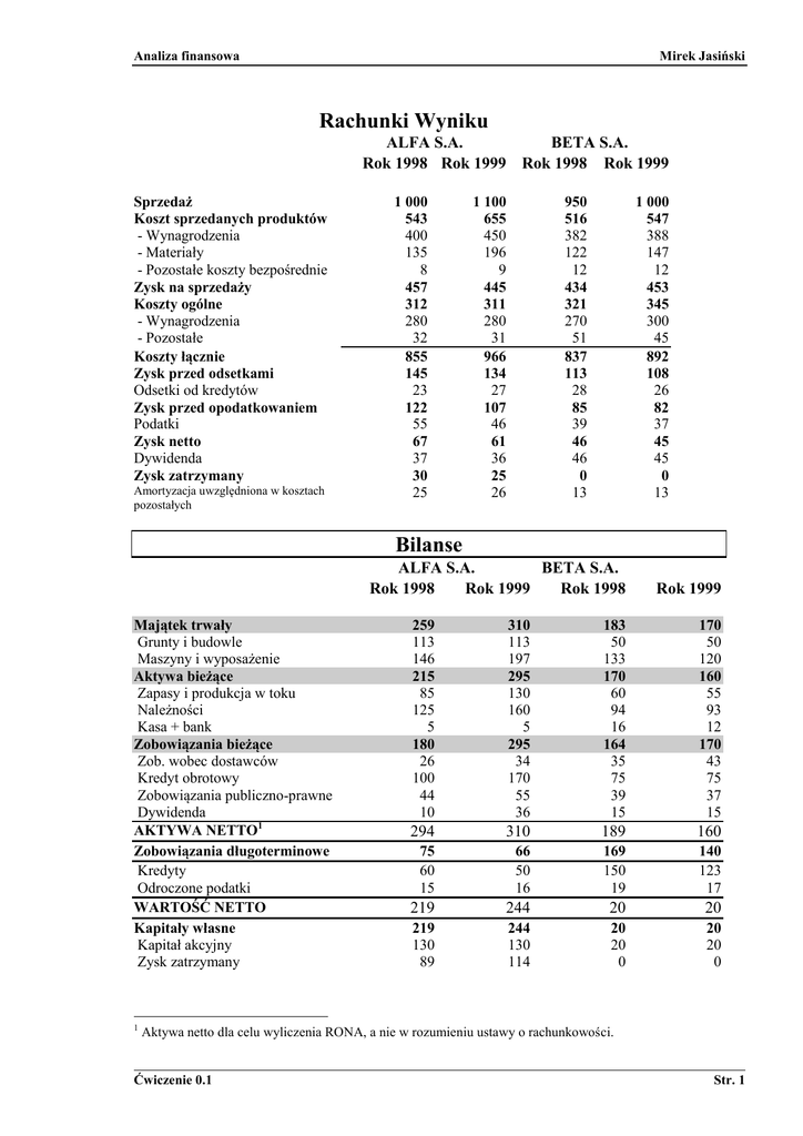 Mirek Jasiński Analiza finansowa Rachunki Wyniku ALFA S.A. BETA S.A. Rok 1998 Rok 1999 Rok 1998 Rok 1999 Sprzedaż Koszt sprzedanych produktów - Wynagrodzenia - Materiały - Pozostałe koszty bezpośrednie Zysk na sprzedaży Koszty ogólne - Wynagrodzenia - Pozostałe Koszty łącznie Zysk przed odsetkami Odsetki od kredytów Zysk przed opodatkowaniem Podatki Zysk netto Dywidenda Zysk zatrzymany Amortyzacja uwzględniona w kosztach pozostałych 1 000 543 400 135 8 457 312 280 32 855 145 23 122 55 67 37 30 25 1 100 655 450 196 9 445 311 280 31 966 134 27 107 46 61 36 25 26 950 516 382 122 12 434 321 270 51 837 113 28 85 39 46 46 0 13 1 000 547 388 147 12 453 345 300 45 892 108 26 82 37 45 45 0 13 Bilanse ALFA S.A. BETA S.A. Rok 1998 Rok 1999 Rok 1998 Majątek trwały Grunty i budowle Maszyny i wyposażenie Aktywa bieżące Zapasy i produkcja w toku Należności Kasa + bank Zobowiązania bieżące Zob. wobec dostawców Kredyt obrotowy Zobowiązania publiczno-prawne Dywidenda AKTYWA NETTO1 Zobowiązania długoterminowe Kredyty Odroczone podatki WARTOŚĆ NETTO Kapitały własne Kapitał akcyjny Zysk zatrzymany 1 Rok 1999 259 113 146 215 85 125 5 180 26 100 44 10 310 113 197 295 130 160 5 295 34 170 55 36 183 50 133 170 60 94 16 164 35 75 39 15 170 50 120 160 55 93 12 170 43 75 37 15 294 310 189 160 75 60 15 66 50 16 169 150 19 140 123 17 219 244 20 20 219 130 89 244 130 114 20 20 0 20 20 0 Aktywa netto dla celu wyliczenia RONA, a nie w rozumieniu ustawy o rachunkowości. Ćwiczenie 0.1 Str. 1