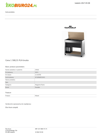 Izabelin 2017-03-08 Karta produktu: Cena 1 588,55 PLN brutto Basic product parameters Numer produktu w systemie 29102 Nr dostawcy 3074 Nr Celcen 21-01958 Kod kreskowy 8710968532421 Nazwa produktu Opis Kategoria Magazine Racks Brand Durable Feature Product Wózek Serdecznie zapraszamy do współpracy Eko biuro zespół. Eko biuro ul Krasińskiego 23a 05-080 Izabelin NIP: 527-000-75-75 22 864 54 84
