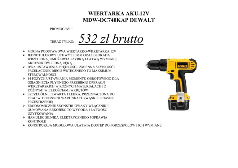 WIERTARKA AKU.12V MDW-DC740KAP DEWALT PROMOCJA!!!! TERAZ TYLKO: 532 zł brutto MOCNA PODSTAWOWA WIERTARKO-WKRĘTARKA 12V JEDNOTULEJOWY UCHWYT 10MM ORAZ BLOKADA WRZECIONA, UMOśLIWIA SZYBKĄ I ŁATWĄ WYMIANĘ AKCESORIÓW JEDNĄ RĘKĄ DWA USTAWIENIA PRĘDKOŚCI, ZMIENNA SZYBKOŚĆ I PRZEŁĄCZNIK BIEGU WSTECZNEGO TO MAKSIMUM STEROWALNOŚCI 14 POZYCJI USTAWIANIA MOMENTU OBROTOWEGO DLA OSIĄGNIĘCIA PŁYNNEGO PRZEBIEGU OPERACJI WKRĘTARSKICH W RÓśNYCH MATERIAŁACH I Z RÓśNYMI WIELKOŚCIAMI WKRĘTÓW SZCZEGÓLNIE ZWARTA I LEKKA, PRZEZNACZONA DO PRAC W TRUDNYCH WARUNKACH (WĄSKIE I CIASNE PRZESTRZENIE) ERGONOMICZNIE SKONSTRUOWANY WŁĄCZNIK I GUMOWANA RĘKOJEŚĆ TO WYGODA I ŁATWOŚĆ UśYTKOWANIA HAMULEC SILNIKA ELEKTRYCZNEGO POPRAWIA KONTROLĘ KONSTRUKCJA MODUŁOWA UŁATWIA DOSTEP DO PODZESPOŁÓW I ICH WYMIANĘ MŁOTOWIERTARKA SDS Z FUNKCJĄ KUCIA 800W 26MM 3,4J DEWALT MDW- D25113KA PROMOCJA!!!! TERAZ TYLKO: 655 zł brutto DOSKONAŁA PRZY WIERCENIACH POD KOTWY I MOCOWANIA W CEGLE I BETONIE OD 4-26MM ELEKTRONIKA PEŁNOFALOWA UMOZLIWIA BARDZO PRECYZYJNE STEROWANIE PRĘDKOŚCIĄ OBROTOWĄ FUNKCJA WYŁĄCZENIA OBROTÓW DO DŁUTOWANIA W CEGLE, MURZE, OKAZJONALNIE W BETONIE FUNKCJA WYŁĄCZENIA UDARU DO WIERCENIA W DREWNIE, STALI, CERAMICE I DO WKRĘCANIA SPRZĘGŁO BEZPIECZEŃSTWA ZAPOBIEGA ODBICIOM ORAZ KONSEKWENCJOM ZAKLESZCZENIA WIERTŁA W MATERIALE ERGONOMICZNA, POKRYTA MIĘKKĄ GUMOWĄ WYKŁADZINĄ TYLNA RĘKOJEŚĆ ZAPEWNIA WIĘKSZĄ WYGODĘ UśYTKOWANIA ERGONOMICZNA, ZAOKRĄGLONA KONSTRUKCJA UMOśLIWIA WYGODNE UśYCIE W KAśDYM ZASTOSOWANIU MBD-EPC14CABK WKRĘTARKA AKUMULATOROWA 14 V BLACK&DECKER PROMOCJA!!!! TERAZ TYLKO: 272 zł brutto 24-RY NASTAWIANE WARTOŚCI MOMENTU OBROTOWEGO UMOśLIWIAJĄ OPTYMALNE WKRĘCANIE RÓśNEJ WIELKOŚCI WKRĘTÓW W RÓZNE MATERIAŁY WSUWANY SYSTEM MOCOWANIA AKUMULATORA – SZYBKA I PROSTA WYMIANA AKUMULATORA ZMIANA KIERUNKU OBROTÓW ZWIĘKSZA WSZECHSTRONNOŚĆ ZASTOSOWAŃ DODATKOWY AKUMULATOR