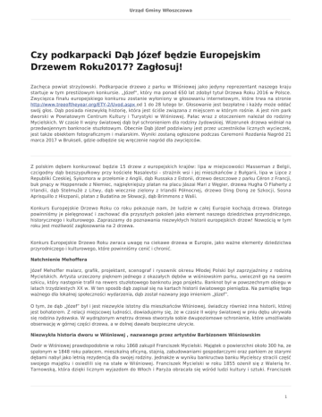 Urząd Gminy Włoszczowa Czy podkarpacki Dąb Józef będzie Europejskim Drzewem Roku2017? Zagłosuj! Zachęca powiat strzyżowski. Podkarpacie drzewo z parku w Wiśniowej jako jedyny reprezentant naszego kraju startuje w tym prestiżowym konkursie. „Józef", który ma ponad 650 lat zdobył tytuł Drzewa Roku 2016 w Polsce. Zwycięzca finału europejskiego konkursu zostanie wyłoniony w głosowaniu internetowym, które trwa na stronie http://www.treeoftheyear.org/ETY-2/Uvod.aspx od 1 do 28 lutego br. Głosowanie jest bezpłatne i każdy może oddać swój głos. Dąb posiada niezwykłą historię, która jest ściśle związana z miejscem w którym rośnie. A jest nim park dworski w Powiatowym Centrum Kultury i Turystyki w Wiśniowej. Pałac wraz z otoczeniem należał do rodziny Mycielskich. W czasie II wojny światowej dąb był schronieniem dla rodziny żydowskiej. Wizerunek drzewa widniał na przedwojennym banknocie stuzłotowym. Obecnie Dąb Józef podziwiany jest przez uczestników licznych wycieczek, jest także obiektem fotograficznym i malarskim. Wyniki zostaną ogłoszone podczas Ceremonii Rozdania Nagród 21 marca 2017 w Brukseli, gdzie odbędzie się wręczenie nagród dla zwycięzców. Z polskim dębem konkurować będzie 15 drzew z europejskich krajów: lipa w miejscowości Masseman z Belgii, czcigodny dąb bezszypułkowy przy kościele Nasalevtsi - strażnik wsi i jej mieszkańców z Bułgarii, lipa w Lipce z Republiki Czeskiej, Sykomora w przełomie z Anglii, dąb Russaka z Estonii, drzewo deszczowe z parku Céron z Francji, buk pnący w Hoppenrade z Niemiec, najpiękniejszy platan na placu Jászai Mari z Węgier, drzewa Hugha O Flaherty z Irlandii, dąb Stelmužė z Litwy, dąb wiecznie zielony z Irlandii Północnej, drzewo Ding Dong ze Szkocji, Sosna Aprisquillo z Hiszpanii, platan z Budatina ze Słowacji, dąb Brimmons z Walii. Konkurs Europejskie Drzewo Roku co roku pokazuje nam, że ludzie w całej Europie kochają drzewa. Dlatego powinniśmy je pielęgnować i zachować dla przyszłych pokoleń jako element naszego dziedzictwa przyrodniczego, historycznego i kulturowego. Zapraszamy do poznawania niezwykłych historii europejskich drzew! Nowością w tym roku jest możliwość zagłosowania na 2 drzewa. Konkurs Europejskie Drzewo Roku zwraca uwagę na ciekawe drzewa w Europie, jako ważne elementy dziedzictwa przyrodniczego i kulturowego, które powinniśmy cenić i chronić. Natchnienie Mehoffera Józef Mehoffer malarz, grafik, projektant, scenograf i rysownik okresu Młodej Polski był zaprzyjaźniny z rodziną Mycielskich. Artysta urzeczony pięknem jednego z okazałych dębów w wiśniowskim parku, uwiecznił go na swoim szkicu, który następnie trafił na rewers stuzłotowego banknotu jego projektu. Banknot był w powszechnym obiegu w latach trzydziestych XX w. W ten sposób dąb zapisał się na kartach historii światowego pieniądza. Na pamiątkę tego ważnego dla lokalnej społeczności wydarzenia, dąb został nazwany jego imieniem „Józef”. O tym, że dąb „Józef” był i jest niezwykle istotny dla mieszkańców Wiśniowej, świadczy również inna historii, której jest bohaterem. Z relacji miejscowej ludności, dowiadujemy się, że w czasie II wojny światowej w pniu dębu ukrywała się rodzina żydowska. W wydrążonym wnętrzu drzewa stworzyła sobie dwupoziomowe schronienie, które umożliwiało obserwację w górnej części drzewa, a w dolnej dawało bezpieczne ukrycie. Niezwykła historia dworu w Wiśniowej , nazwanego przez artystów Barbizonem Wiśniowskim Dwór w Wiśniowej prawdopodobnie w roku 1868 zakupił Franciszek Mycielski. Majątek o powierzchni około 300 ha, ze spalonym w 1848 roku pałacem, mieszkalną oficyną, stajnią, zabudowaniami gospodarczymi oraz parkiem ze starymi dębami nabył jako letnią rezydencją dla swojej rodziny. Jednakże w wyniku bankructwa banku Mycielscy stracili część swojego majątku i osiedlili się na stałe w Wiśniowej. Franciszek Mycielski w roku 1855 ożenił się z Walerią hr. Tarnowską, która dzięki licznym wyjazdom do Włoch i Paryża obracała się wśród ludzi kultury i sztuki. Franciszek 1 Urząd Gminy Włoszczowa Mycielski był przede wszystkim znakomitym gospodarzem. W latach 1871-1872 przeprowadził remont i przebudowę pałacu według projektu cenionego krakowskiego architekta Filipa Pokutyńskiego, który zachował dawny prostokątny rzut planu z pokojami w dwóch traktach, zmienił natomiast całkowicie wewnętrzne podziały, a z holu na parterze wywiódł obszerne kamienne łukowe schody na piętro, które podwyższył i nakrył niskim czterospadowym dachem z profilowanym gzymsem podokapowym z kroksztynami. Ponadto za czasów Franciszka Mycielskiego została wykonana melioracja, założył on hodowlę bydła, zmienił wygląd ogrodu dworskiego w park krajobrazowy typu angielskiego. Wraz z żoną stworzyli w Wiśniowej nie tylko jeden z najbardziej rentownych majątków w Galicji lecz również miejsce skupiające elitę intelektualną i artystyczną. Ponadto w 1877 roku Franciszek Mycielski został posłem do sejmu krajowego w powiecie jasielskim. Następnie w 1895 roku mianowano go dożywotnio członkiem Izby Panów w Wiedniu. Był, również Prezesem Towarzystwa Rolniczego w Krakowie w latach 1894-1898. Mieli pięcioro dzieci: Jerzego, Kazimierza, Cecylię, Karolinę oraz Jana, który przed wybuchem I wojny światowej przejął opiekę nad majątkiem. Zaślubił on w 1898 roku Marię z Szembeków Dzieduszycką, która powiększyła zbiory biblioteczne oraz kolekcję porcelany. Nawiązała kontakty z Józefem Mehofferem, Tadeuszem Stryjeńskim i Alfonsem Karpińskim. Wraz z żoną doprowadzili do rozwoju majątku. Jan Mycielski założył w Wiśniowej stadninę koni, gorzelnię, tartak, fabrykę serów oraz wznowił hodowlę bydła. W Wiśniowej wytwarzano w okresie międzywojennym sery szwajcarskie typu gruyere. Niemal całe życie spędziła w Wiśniowej Cecylia Myc