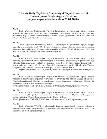 Uchwały Rady Wydziału Matematyki Fizyki i Informatyki Uniwersytetu Gdańskiego w Gdańsku podjęte na posiedzeniu w dniu 23.09.2010 r. Ad. 8. Rada Wydziału Matematyki, Fizyki i Informatyki w głosowaniu tajnym podjęła uchwałę o powołaniu prof. dr hab. Mirosława Lachowicza na recenzenta rozprawy doktorskiej mgr ElŜbiety Puźniakowskiej -Gałuch. Wynik głosowania: TAK -30, NIE - 0, Wstrz. - 0. Obecnych 30 osób, uprawnionych 44. Ad. 8i. Rada Wydziału Matematyki, Fizyki i Informatyki w głosowaniu tajnym podjęła uchwałę o powołaniu prof. UJ, dr hab. Antoniego Leona Dawidowicza na recenzenta rozprawy doktorskiej mgr ElŜbiety Puźniakowskiej -Gałuch. Wynik głosowania: TAK -30, NIE -0, Wstrz. -0. Obecnych 30 osób, uprawnionych 44. Ad. 8ii. Rada Wydziału Matematyki, Fizyki i Informatyki w głosowaniu tajnym podjęła uchwałę o powołaniu Komisji egzaminacyjnej z dyscypliny podstawowej w przewodzie mgr ElŜbiety Puźniakowskiej -Gałuch w składzie: prof. UG. dr hab. Henryk Leszczyński – przewodniczący, prof. UG, dr hab. Antoni Augustynowicz, prof. UG, dr hab. Tomasz Czapiński, prof. dr hab. Zdzisław Kamont, prof. dr hab. Tomasz Szarek. Wynik głosowania: TAK -30, NIE -0, Wstrz. -0. Obecnych 30 osób, uprawnionych 44. Ad. 20. Rada Wydziału Matematyki, Fizyki i Informatyki w głosowaniu tajnym poparła wniosek o nostryfikacje dyplomu: Certificate of awarding the Master Degree of SciencePhysics/Experimental Physics wystawionego przez Mansoura University (Egipt) dla Mohameda Abd ElAziza Ibrahima Nawarega. Wynik głosowania: TAK -29, NIE -0, Wstrz. -1. Obecnych 30 osób, uprawnionych 44. Ad. 20i. Rada Wydziału Matematyki, Fizyki i Informatyki w głosowaniu tajnym poparła wniosek o nostryfikacje dyplomu: Diploma: Master of Science In Physics, wydanego przez Indian Institute of Technology Madras (Indie) dla Arijit Dutta. Wynik głosowania: TAK -28, NIE -0, Wstrz. -1. Obecnych 29 osób, uprawnionych 44. Ad. 22. Rada Wydziału WMFiI w głosowaniu jawnym jednogłośnie poparła wniosek o zatwierdzenie zasad przyznawania stypendiów doktoranckich na Wydziale MFiI UG. Obecnych 34 osób, uprawnionych 60.