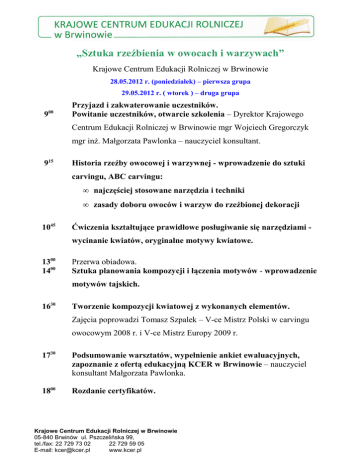 „Sztuka rzeźbienia w owocach i warzywach” Krajowe Centrum Edukacji Rolniczej w Brwinowie 28.05.2012 r. (poniedziałek) – pierwsza grupa 29.05.2012 r. ( wtorek ) – druga grupa 9 00 Przyjazd i zakwaterowanie uczestników. Powitanie uczestników, otwarcie szkolenia – Dyrektor Krajowego Centrum Edukacji Rolniczej w Brwinowie mgr Wojciech Gregorczyk mgr inż. Małgorzata Pawlonka – nauczyciel konsultant. 915 Historia rzeźby owocowej i warzywnej - wprowadzenie do sztuki carvingu, ABC carvingu: • najczęściej stosowane narzędzia i techniki • zasady doboru owoców i warzyw do rzeźbionej dekoracji 1045 Ćwiczenia kształtujące prawidłowe posługiwanie się narzędziami wycinanie kwiatów, oryginalne motywy kwiatowe. 1300 1400 Przerwa obiadowa. Sztuka planowania kompozycji i łączenia motywów - wprowadzenie motywów tajskich. 1630 Tworzenie kompozycji kwiatowej z wykonanych elementów. Zajęcia poprowadzi Tomasz Szpalek – V-ce Mistrz Polski w carvingu owocowym 2008 r. i V-ce Mistrz Europy 2009 r. 1730 Podsumowanie warsztatów, wypełnienie ankiet ewaluacyjnych, zapoznanie z ofertą edukacyjną KCER w Brwinowie – nauczyciel konsultant Małgorzata Pawlonka. 1800 Rozdanie certyfikatów. Krajowe Centrum Edukacji Rolniczej w Brwinowie 05-840 Brwinów ul. Pszczelińska 99, tel./fax: 22 729 73 02 22 729 59 05 E-mail: [email protected] www.kcer.pl