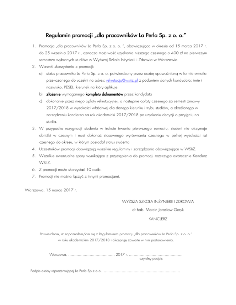 Regulamin Regulamin promocji „dla „dla pracowników La Perla Sp. z o. o.” o.” 1. Promocja „dla pracowników La Perla Sp. z o. o. ”, obowiązująca w okresie od 15 marca 2017 r. do 25 września 2017 r., oznacza możliwość uzyskania niższego czesnego o 400 zł na pierwszym semestrze wybranych studiów w Wyższej Szkole Inżynierii i Zdrowia w Warszawie. 2. Warunki skorzystania z promocji: a) status pracownika La Perla Sp. z o. o. potwierdzony przez osobę upoważnianą w formie e-maila przekazanego do uczelni na adres: [email protected] z podaniem danych kandydata: imię i nazwisko, PESEL, kierunek na który aplikuje. b) złożenie wymaganego kompletu dokumentów przez kandydata c) dokonanie przez niego opłaty rekrutacyjnej, a następnie opłaty czesnego za semestr zimowy 2017/2018 w wysokości właściwej dla danego kierunku i trybu studiów, a określonego w zarządzeniu kanclerza na rok akademicki 2017/2018 po uzyskaniu decyzji o przyjęciu na studia. 3. W przypadku rezygnacji studenta w trakcie trwania pierwszego semestru, student nie otrzymuje obniżki w czesnym i musi dokonać stosownego wyrównania czesnego w pełnej wysokości rat czesnego do okresu, w którym posiadał status studenta 4. Uczestników promocji obowiązują wszelkie regulaminy i zarządzania obowiązujące w WSIiZ. 5. Wszelkie ewentualne spory wynikające z przystąpienia do promocji rozstrzyga ostatecznie Kanclerz WSIiZ. 6. Z promocji może skorzystać 10 osób. 7. Promocji nie można łączyć z innymi promocjami. Warszawa, 15 marca 2017 r. WYŻSZA SZKOŁA INŻYNIERII I ZDROWIA dr hab. Marcin Jarosław Geryk KANCLERZ Potwierdzam, iż zapoznałem/am się z Regulaminem promocji „dla pracowników La Perla Sp. z o. o.” w roku akademickim 2017/2018 i akceptuję zawarte w nim postanowienia. Warszawa, ………………………………… 2017 r. ……………………………………… czytelny podpis Podpis osoby reprezentującej La Perla Sp z o.o. ……………………………………………………….