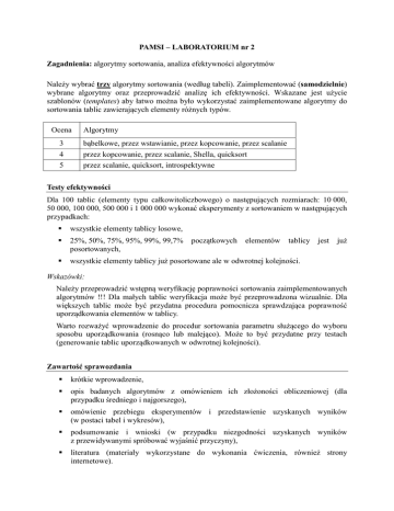 PAMSI – LABORATORIUM nr 2 Zagadnienia: algorytmy sortowania
