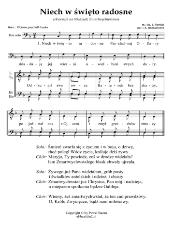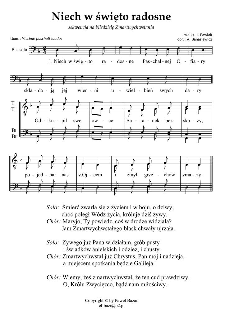 Niech w święto radosne sekwencja na Niedzielę Zmartwychwstania tłum.: Victime paschali laudes Bas solo ? ? b 42 b œJ j œ œ J œ J jej j œ J j b œ V J j œ J ?b j œ J j œ J j œ J j œ J j œ J Od - ku - pił BI BII V b œj J j œ J j œ J j œ J po - jed - nał ? b œj J nas j œ J œ œ œ J u - j œ J ow - ce œ z Oj - cem œ œ œ J j œ J j œ J i j œ J j œ J zmył j œ J j œ J j œ J j œ J œ œ O - fia - ry œ swych j œ J j œ J œ J œ J œ J wiel - bień j œ J œ J Pas - chal - nej Ba - ra - nek œ œ œ œ œ J œ J j œ J œ œ œ swe œ ra - dos - ne wier - ni j œ J œ œ J œ J 1. Niech w świę - to skła - da - ją TI TII j œ œ J m.: ks. I. Pawlak opr.: A. Banasiewicz j œ J j œœ J bez j œ J j œ J grze - chów da - ry. œœ œœ ska - zy, œ œ œ œ œ œ zma - zy. œ Solo: Śmierć zwarła się z życiem i w boju, o dziwy, choć poległ Wódz życia, króluje dziś żywy. Chór: Maryjo, Ty powiedz, coś w drodze widziała? Jam Zmartwychwstałego blask chwały ujrzała. Solo: Żywego już Pana widziałam, grób pusty i świadków anielskich i odzież, i chusty. Chór: Zmartwychwstał już Chrystus, Pan mój i nadzieja, a miejscem spotkania będzie Galileja. Chór: Wiemy, żeś zmartwychwstał, że ten cud prawdziwy. O, Królu Zwycięzco, bądź nam miłościwy. Copyright © by Paweł Bazan [email protected] œ œ