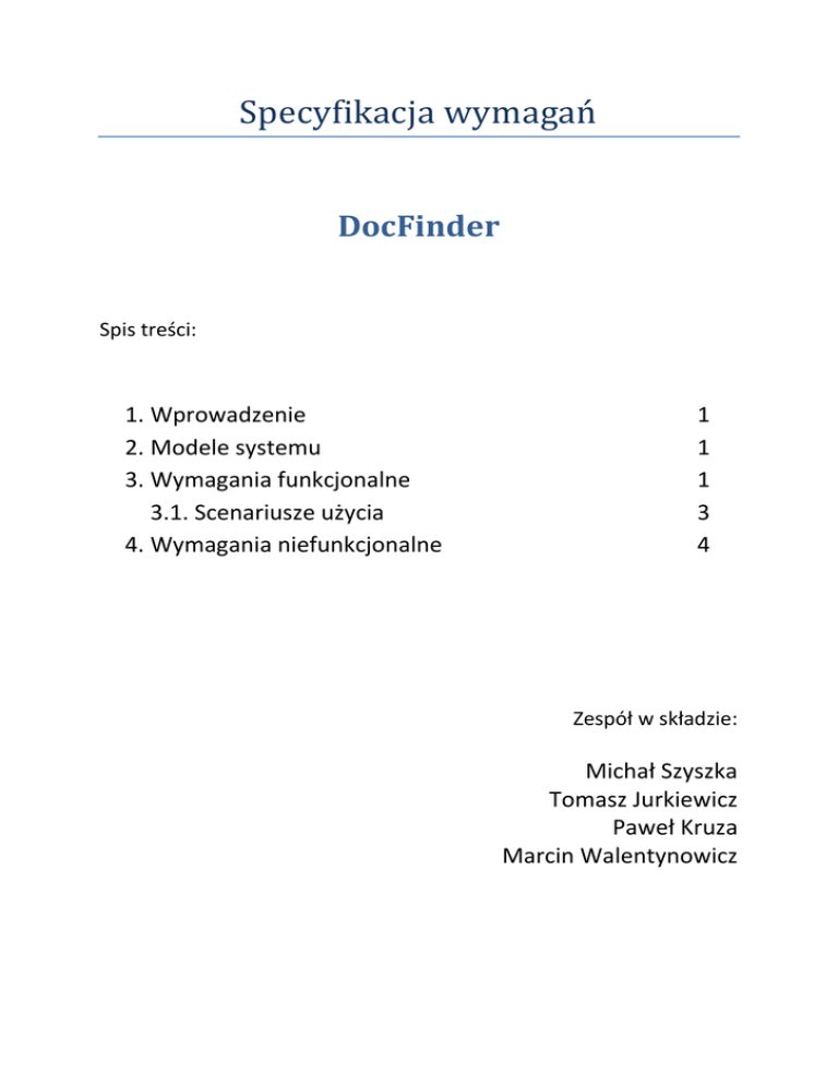 Specyfikacja wymagań DocFinder Spis treści: 1. Wprowadzenie 2. Modele systemu 3. Wymagania funkcjonalne 3.1. Scenariusze użycia 4. Wymagania niefunkcjonalne 1 1 1 3 4 Zespół w składzie: Michał Szyszka Tomasz Jurkiewicz Paweł Kruza Marcin Walentynowicz 1. Wprowadzenie Celem naszego systemu jest wprowadzenie możliwości przeszukiwania zawartości plików w pewnych zadanych kontekstach. Często jest tak, że mamy porozrzucane dokumenty na dyskach logicznych (e-booki, maile etc.) i w momencie, gdy potrzebujemy znaleźd jakąś informację w nich zawartą pojawia się problem – musimy otwierad każdy dokument z osobna i go przeszukiwad. Nasz program ma usprawnid ten system. 2. Modele systemu (załącznik 1.) 3. Wymagania funkcjonalne 3.1 Scenariusze użycia U1: Szukanie dokumentu. Główny scenariusz: 1. Użytkownik chce znaleźd odpowiedni plik \ grupę plików. 2. Podaje odpowiednie kryterium w postaci frazy \ dokumentu. 3. System wyszukuje pliki, grupuje je i prezentuje użytkownikowi. Rozszerzenia: 2.A. Użytkownik nie podał odpowiedniej frazy \ dokumentu. 2.A.1. System prosi o ponowne wprowadzenie kryterium. (powrót do 2) 3.A. Brak wyników wyszukiwania. 3.A.1. System informuje użytkownika o braku wyników wyszukiwania. U2: Wyszukiwanie po frazie. Główny scenariusz: 1. Użytkownik chce znaleźd odpowiedni plik \ grupę plików. 2. Podaje odpowiednie kryterium w postaci frazy. 3. System wyszukuje pliki, grupuje je i prezentuje użytkownikowi. Rozszerzenia: 2.A. Użytkownik nie podał odpowiedniej frazy. 2.A.1. System prosi o ponowne wprowadzenie kryterium. (powrót do 2) 3.A. Brak wyników wyszukiwania. 3.A.1. System informuje użytkownika o braku wyników wyszukiwania. U3: Wyszukiwanie po dokumencie. Główny scenariusz: 1. Użytkownik chce znaleźd odpowiedni plik \ grupę plików. 2. Podaje odpowiednie kryterium w postaci dokumentu. 3. System wyszukuje pliki, grupuje je i prezentuje podobne pliki użytkownikowi. Rozszerzenia: 2.A. Użytkownik nie podał odpowiedniego dokumentu (za krótki\niezrozumiały). 2.A.1. System prosi o ponowne wprowadzenie kryterium. (powrót do 2) 3.A. Brak wyników wyszukiwania. 3.A.1. System informuje użytkownika o braku wyników wyszukiwania. U4: Określenie zakresu wyszukiwania. Główny scenariusz: 1. Użytkownik chce określid zakres wyszukiwania w zakresie daty i lokalizacji. 2. Podaje odpowiedni zakres dat i\lub lokalizację. 3. System zapisuje konfigurację. (diagramy większej ilości przypadków użycia w załączniku 2.) 4. Wymagania niefunkcjonalne a. interfejs użytkownika minimalistyczny, ale nowoczesny interfejs użytkownika b. praca z systemem możliwośd pracy programu w trybie gotowości (w tle) możliwośd wyszukiwania w tle c. wydajnośd i bezpieczeostwo uwzględnienie polityki prywatności systemu operacyjnego (pliki ukryte \ niedostępne ) d. utrzymanie i przenośnośd praca na maszynach z dostępnym środowiskiem uruchomieniowym .NET 4.0