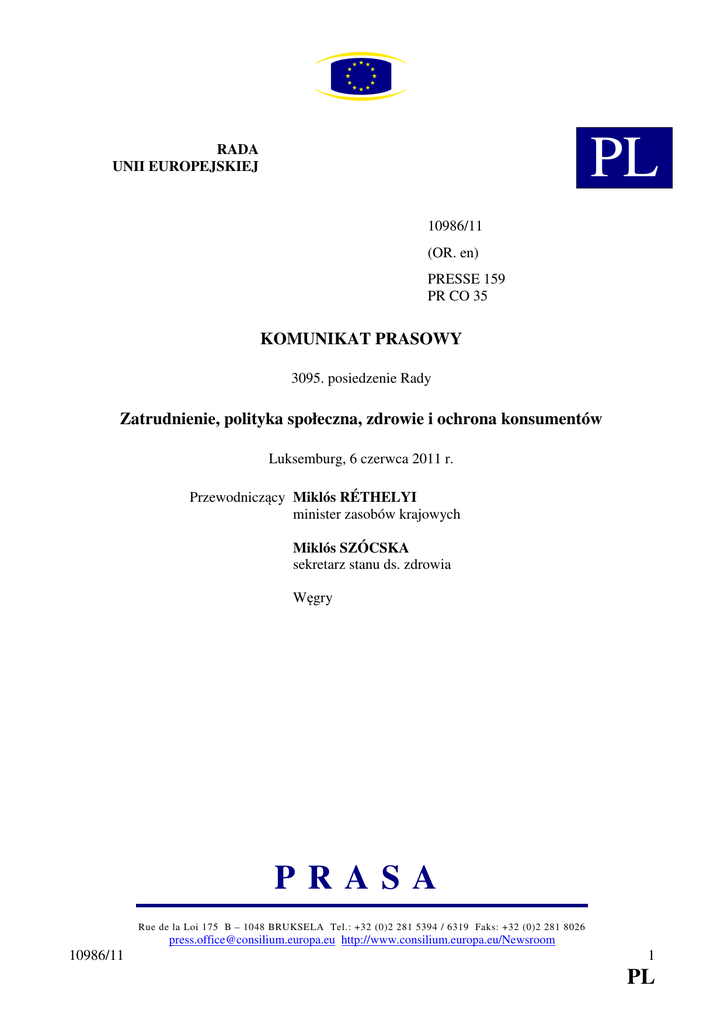 PL RADA UNII EUROPEJSKIEJ 10986/11 (OR. en) PRESSE 159 PR CO 35 KOMUNIKAT PRASOWY 3095. posiedzenie Rady Zatrudnienie, polityka społeczna, zdrowie i ochrona konsumentów Luksemburg, 6 czerwca 2011 r. Przewodniczący Miklós RÉTHELYI minister zasobów krajowych Miklós SZÓCSKA sekretarz stanu ds. zdrowia Węgry PRASA Rue de la Loi 175 B – 1048 BRUKSELA Tel.: +32 (0)2 281 5394 / 6319 Faks: +32 (0)2 281 8026 [email protected] http://www.consilium.europa.eu/Newsroom 10986/11 1 PL 6 VI 2011 Główne wyniki posiedzenia Rady Ministrowie przeprowadzili wymianę poglądów na temat szczepień ochronnych dzieci oraz na temat nowoczesnych, elastycznych i stabilnych systemów opieki zdrowotnej, a takŜe przyjęli konkluzje na powyŜsze dwa tematy. Ponadto Rada przyjęła konkluzje na następujące tematy: • Europejski pakt na rzecz zdrowia i dobrostanu psychicznego, oraz • Innowacje w sektorze wyrobów medycznych W punkcie sprawy róŜne ministrowie podsumowali sytuację w związku z wybuchem epidemii zakaŜeń E. coli. 10986/11 2 PL 6 VI 2011 SPIS TREŚCI1 UCZESTNICY ................................................................................................................................... 5 OMAWIANE PUNKTY EUROPEJSKI PAKT NA RZECZ ZDROWIA I DOBROSTANU PSYCHICZNEGO .................... 7 INNOWACJE W SEKTORZE WYROBÓW MEDYCZNYCH ........................................................ 8 SZCZEPIENIA OCHRONNE DZIECI ............................................................................................... 9 KU NOWOCZESNYM, ELASTYCZNYM I STABILNYM SYSTEMOM OPIEKI ZDROWOTNEJ................................................................................................................................. 11 SPRAWY RÓŻNE............................................................................................................................. 12 Konferencje........................................................................................................................................ 12 Posiedzenie Grupy Roboczej Wysokiego Szczebla ds. Zdrowia Publicznego .................................. 12 Informacje o produktach leczniczych ................................................................................................ 12 Partnerstwo na rzecz aktywnego i zdrowego starzenia się ................................................................ 12 Śródokresowa ocena unijnego programu ochrony zdrowia i europejskiej strategii zdrowia ............ 12 Zachorowania wywołane bakterią E. coli .......................................................................................... 13 Przedstawienie programu prac kolejnej prezydencji ......................................................................... 13 INNE ZATWIERDZONE PUNKTY POLITYKA SPOŁECZNA – Koordynacja systemów zabezpieczenia społecznego – UE/Europejski Obszar Gospodarczy .............................. 14 SPRAWY GOSPODARCZE I FINANSOWE – 1 Dostęp do danych w celach naukowych................................................................................................................ 14 Jeżeli deklaracje, konkluzje lub rezolucje zostały przez Radę formalnie przyjęte, jest to zaznaczone w tytule danego punktu, a tekst jest umieszczony w cudzysłowie. Dokumenty, do których odesłano w tekście, są dostępne na internetowej stronie Rady (http://www.consilium.europa.eu). Gwiazdką oznaczono akty przyjęte wraz z oświadczeniami do protokołu Rady przeznaczonymi do wiadomości publicznej; oświadczenia te można znaleźć na wyżej wspomnianej internetowej stronie Rady lub uzyskać z biura prasowego. 10986/11 3 PL 6 VI 2011 RYNEK WEWNĘTRZNY – Wyroby włókiennicze – dwuskładnikowe włókno polipropylenowo-poliamidowe.............................................. 15 UNIA CELNA – Zawieszenie ceł na niektóre rodzaje monitorów.................................................................................................... 15 10986/11 4 PL 6 VI 2011 UCZESTNICY Belgia: Jean-Marc DELIZĖE sekretarz stanu do spraw społecznych Bułgaria: Peter STEFANOW zastępca stałego przedstawiciela Republia Czeska: Lucie ŠESTÁKOVÁ zastępca stałego przedstawiciela Dania: Jonas BERING LIISBERG zastępca stałego przedstawiciela Niemcy: Annette WIDMANN-MAUZ parlamentarny sekretarz stanu przy Federalnym Ministrze Zdrowia Estonia: Hanno PEVKUR minister spraw społecznych Irlandia: Géraldine BYRNE NASON zastępca stałego przedstawiciela Grecja: Andreas LOVERDOS minister ds. zatrudnienia i ochrony socjalnej Hiszpania: Leire PAJÍN IRAOLA minister zdrowia, polityki społecznej i równości Francja Philippe LEGLISE-COSTA zastępca stałego przedstawiciela Włochy: Ferruccio FAZIO minister zdrowia Cypr: Christos PATSALIDES minister zdrowia Łotwa: Juris BĀRZDIŅŠ minister zdrowia Litwa: Raimondas ŠUKYS minister zdrowia Luksemburg: Mars DI BARTOLOMEO minister zdrowia i zabezpieczenia społecznego Węgry: Miklòs RÉTHELYI Miklós SZÓCSKA minister zasobów narodowych sekretarz stanu ds. polityki zdrowia publicznego Malta: Joe CASSAR minister ds. zdrowia, osób starszych i opieki społecznej Niderlandy: Derk OLDENBURG zastępca stałego przedstawiciela Austria: Harald GÜNTHER zastępca stałego przedstawiciela Polska: Ewa KOPACZ minister zdrowia Portugalia: Pedro COSTA PEREIRA zastępca stałego przedstawiciela Rumunia: Adrian STREINU CERCEL sekretarz stanu, Ministerstwo Zdrowia Słowenia: Dorijan MARUŜIČ minister zdrowia 10986/11 5 PL 6 VI 2011 Słowacja: Jan PORUBSKY sekretarz stanu, Ministerstwo Zdrowia Finlandia: Marja RISLAKKI zastępca stałego przedstawiciela Szwecja: Jan Roland OLSSON zastępca stałego przedstawiciela Zjednoczone Królestwo: Andy LEBRECHT zastępca stałego przedstawiciela Komisja: John DALLI członek 10986/11 6 PL 6 VI 2011 OMAWIANE PUNKTY EUROPEJSKI PAKT NA RZECZ ZDROWIA I DOBROSTANU PSYCHICZNEGO Rada przyjęła konkluzje zatytułowane „Europejski pakt na rzecz zdrowia i dobrost