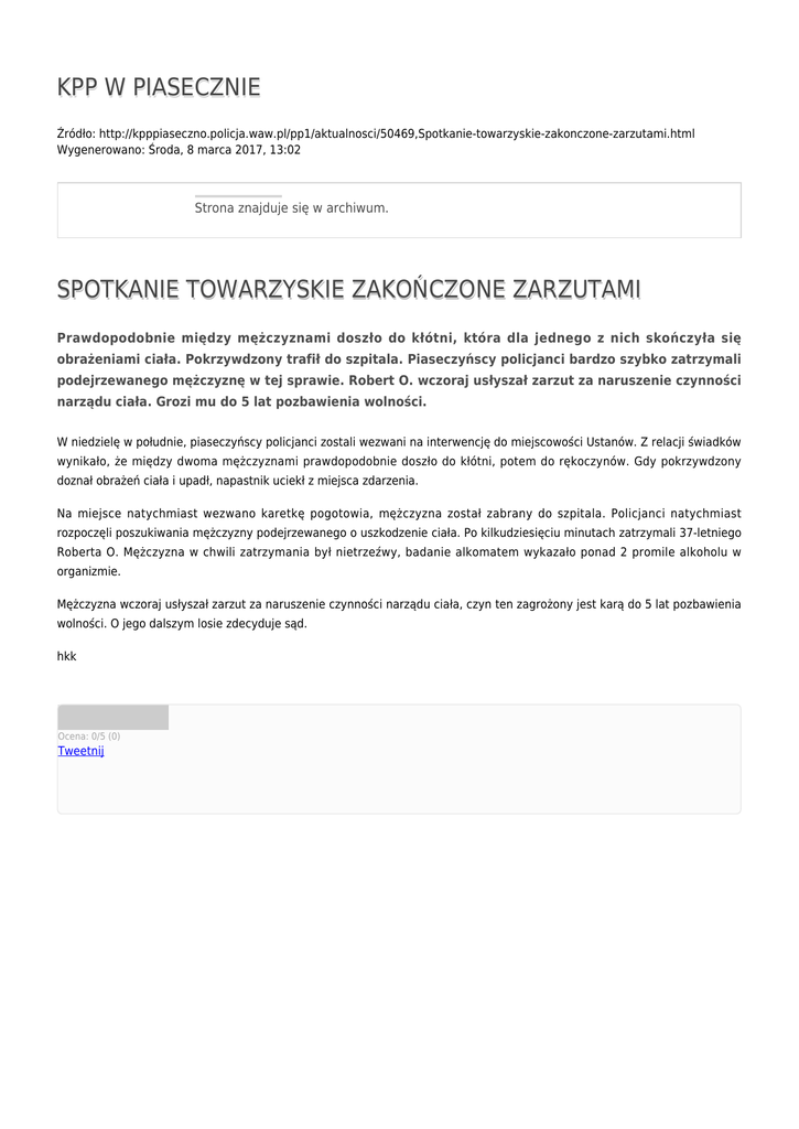 KPP W PIASECZNIE Źródło: http://kpppiaseczno.policja.waw.pl/pp1/aktualnosci/50469,Spotkanie-towarzyskie-zakonczone-zarzutami.html Wygenerowano: Środa, 8 marca 2017, 13:02 Strona znajduje się w archiwum. SPOTKANIE TOWARZYSKIE ZAKOŃCZONE ZARZUTAMI Prawdopodobnie między mężczyznami doszło do kłótni, która dla jednego z nich skończyła się obrażeniami ciała. Pokrzywdzony trafił do szpitala. Piaseczyńscy policjanci bardzo szybko zatrzymali podejrzewanego mężczyznę w tej sprawie. Robert O. wczoraj usłyszał zarzut za naruszenie czynności narządu ciała. Grozi mu do 5 lat pozbawienia wolności. W niedzielę w południe, piaseczyńscy policjanci zostali wezwani na interwencję do miejscowości Ustanów. Z relacji świadków wynikało, że między dwoma mężczyznami prawdopodobnie doszło do kłótni, potem do rękoczynów. Gdy pokrzywdzony doznał obrażeń ciała i upadł, napastnik uciekł z miejsca zdarzenia. Na miejsce natychmiast wezwano karetkę pogotowia, mężczyzna został zabrany do szpitala. Policjanci natychmiast rozpoczęli poszukiwania mężczyzny podejrzewanego o uszkodzenie ciała. Po kilkudziesięciu minutach zatrzymali 37-letniego Roberta O. Mężczyzna w chwili zatrzymania był nietrzeźwy, badanie alkomatem wykazało ponad 2 promile alkoholu w organizmie. Mężczyzna wczoraj usłyszał zarzut za naruszenie czynności narządu ciała, czyn ten zagrożony jest karą do 5 lat pozbawienia wolności. O jego dalszym losie zdecyduje sąd. hkk Ocena: 0/5 (0) Tweetnij