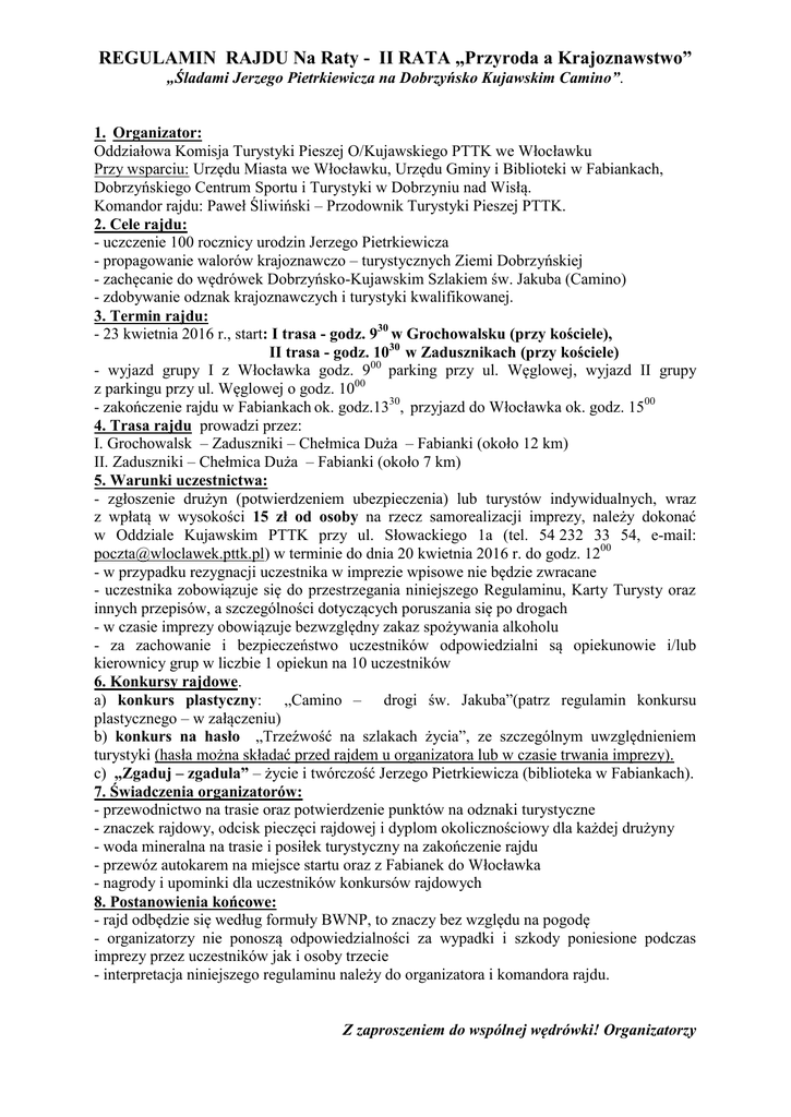 REGULAMIN RAJDU Na Raty - II RATA „Przyroda a Krajoznawstwo” „Śladami Jerzego Pietrkiewicza na Dobrzyńsko Kujawskim Camino”. 1. Organizator: Oddziałowa Komisja Turystyki Pieszej O/Kujawskiego PTTK we Włocławku Przy wsparciu: Urzędu Miasta we Włocławku, Urzędu Gminy i Biblioteki w Fabiankach, Dobrzyńskiego Centrum Sportu i Turystyki w Dobrzyniu nad Wisłą. Komandor rajdu: Paweł Śliwiński – Przodownik Turystyki Pieszej PTTK. 2. Cele rajdu: - uczczenie 100 rocznicy urodzin Jerzego Pietrkiewicza - propagowanie walorów krajoznawczo – turystycznych Ziemi Dobrzyńskiej - zachęcanie do wędrówek Dobrzyńsko-Kujawskim Szlakiem św. Jakuba (Camino) - zdobywanie odznak krajoznawczych i turystyki kwalifikowanej. 3. Termin rajdu: - 23 kwietnia 2016 r., start: I trasa - godz. 930 w Grochowalsku (przy kościele), II trasa - godz. 1030 w Zadusznikach (przy kościele) - wyjazd grupy I z Włocławka godz. 900 parking przy ul. Węglowej, wyjazd II grupy z parkingu przy ul. Węglowej o godz. 1000 - zakończenie rajdu w Fabiankach ok. godz.1330, przyjazd do Włocławka ok. godz. 1500 4. Trasa rajdu prowadzi przez: I. Grochowalsk – Zaduszniki – Chełmica Duża – Fabianki (około 12 km) II. Zaduszniki – Chełmica Duża – Fabianki (około 7 km) 5. Warunki uczestnictwa: - zgłoszenie drużyn (potwierdzeniem ubezpieczenia) lub turystów indywidualnych, wraz z wpłatą w wysokości 15 zł od osoby na rzecz samorealizacji imprezy, należy dokonać w Oddziale Kujawskim PTTK przy ul. Słowackiego 1a (tel. 54 232 33 54, e-mail: [email protected]) w terminie do dnia 20 kwietnia 2016 r. do godz. 1200 - w przypadku rezygnacji uczestnika w imprezie wpisowe nie będzie zwracane - uczestnika zobowiązuje się do przestrzegania niniejszego Regulaminu, Karty Turysty oraz innych przepisów, a szczególności dotyczących poruszania się po drogach - w czasie imprezy obowiązuje bezwzględny zakaz spożywania alkoholu - za zachowanie i bezpieczeństwo uczestników odpowiedzialni są opiekunowie i/lub kierownicy grup w liczbie 1 opiekun na 10 uczestników 6. Konkursy rajdowe. a) konkurs plastyczny: „Camino – drogi św. Jakuba”(patrz regulamin konkursu plastycznego – w załączeniu) b) konkurs na hasło „Trzeźwość na szlakach życia”, ze szczególnym uwzględnieniem turystyki (hasła można składać przed rajdem u organizatora lub w czasie trwania imprezy). c) „Zgaduj – zgadula” – życie i twórczość Jerzego Pietrkiewicza (biblioteka w Fabiankach). 7. Świadczenia organizatorów: - przewodnictwo na trasie oraz potwierdzenie punktów na odznaki turystyczne - znaczek rajdowy, odcisk pieczęci rajdowej i dyplom okolicznościowy dla każdej drużyny - woda mineralna na trasie i posiłek turystyczny na zakończenie rajdu - przewóz autokarem na miejsce startu oraz z Fabianek do Włocławka - nagrody i upominki dla uczestników konkursów rajdowych 8. Postanowienia końcowe: - rajd odbędzie się według formuły BWNP, to znaczy bez względu na pogodę - organizatorzy nie ponoszą odpowiedzialności za wypadki i szkody poniesione podczas imprezy przez uczestników jak i osoby trzecie - interpretacja niniejszego regulaminu należy do organizatora i komandora rajdu. Z zaproszeniem do wspólnej wędrówki! Organizatorzy REGULAMIN KONKURSU PLASTYCZNEGO „Śladami Jerzego Pietrkiewicza na Dobrzyńsko Kujawskim Camino”. „Rajd na Raty” – II rata 23 kwietnia 2016 r. 1. Konkurs adresowany jest do grup uczestniczących w rajdzie „Śladami Jerzego Pietrkiewicza na Dobrzyńsko Kujawskim Camino”. Cele konkursu: - przypomnienie i popularyzacja sylwetki prof. J. Pietrkiewicza, wybitnego poety i tłumacza, syna Ziemi Dobrzyńskiej w 100 rocznicę urodzin, - popularyzacja wiedzy na temat Camino w Polsce ze szczególnym uwzględnieniem jego przebiegu na Pomorzu, Ziemi Dobrzyńskiej oraz Kujawach, - przedstawienie dorobku artystycznego uczestników rajdu na wystawie prac w Gminnej Bibliotece Publicznej w Fabiankach. 2. Prace mogą być wykonane w dowolnej technice plastycznej w formacie A- 4 lub większym. 3. Prace należy składać w Oddziale Kujawskim PTTK przy ul. Słowackiego 1a oraz Gminnej Bibliotece Publicznej w Fabiankach do dnia 22 kwietnia 2016 r. do godz. 1200 4. Jury oceniać będzie przede wszystkim oryginalność prac, ich zgodność z tematem konkursu oraz technikę i walory estetyczne wykonania. 5. Wszystkie prace zaprezentowane zostaną podczas zakończenia rajdu, a dla zwycięzców przewidziane są nagrody i wyróżnienia. ZAPRASZAMY DO UDZIAŁU W KONKURSIE !