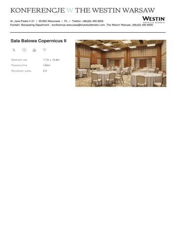 KONFERENCJE W THE WESTIN WARSAW Al. Jana Pawła II 21 • 00-854 Warszawa • PL • Telefon: (48)(22) 450 8000 Kontakt: Banqueting Department , [email protected], The Westin Warsaw, (48)(22) 450 6500 Sala Balowa Copernicus II Wielkość sali 7.7m x 15.8m Powierzchnia 140m² Wysokość sufitu 0.0 KONFERENCJE W THE WESTIN WARSAW Al. Jana Pawła II 21 • 00-854 Warszawa • PL • Telefon: (48)(22) 450 8000 Kontakt: Banqueting Department , [email protected], The Westin Warsaw, (48)(22) 450 6500 Sala Balowa Copernicus II • Bankiet Maks. Pojemność: 130 KONFERENCJE W THE WESTIN WARSAW Al. Jana Pawła II 21 • 00-854 Warszawa • PL • Telefon: (48)(22) 450 8000 Kontakt: Banqueting Department , [email protected], The Westin Warsaw, (48)(22) 450 6500 Sala Balowa Copernicus II • Teatr Maks. Pojemność: 140 KONFERENCJE W THE WESTIN WARSAW Al. Jana Pawła II 21 • 00-854 Warszawa • PL • Telefon: (48)(22) 450 8000 Kontakt: Banqueting Department , [email protected], The Westin Warsaw, (48)(22) 450 6500 Sala Balowa Copernicus II • Sala zajęciowa Maks. Pojemność: 80 KONFERENCJE W THE WESTIN WARSAW Al. Jana Pawła II 21 • 00-854 Warszawa • PL • Telefon: (48)(22) 450 8000 Kontakt: Banqueting Department , [email protected], The Westin Warsaw, (48)(22) 450 6500 Sala Balowa Copernicus II • W kształcie litery U Maks. Pojemność: 54 KONFERENCJE W THE WESTIN WARSAW Al. Jana Pawła II 21 • 00-854 Warszawa • PL • Telefon: (48)(22) 450 8000 Kontakt: Banqueting Department , [email protected], The Westin Warsaw, (48)(22) 450 6500 Sala Balowa Copernicus II • Oficjalne przyjęcie z tańcami Maks. Pojemność: 80 KONFERENCJE W THE WESTIN WARSAW Al. Jana Pawła II 21 • 00-854 Warszawa • PL • Telefon: (48)(22) 450 8000 Kontakt: Banqueting Department , [email protected], The Westin Warsaw, (48)(22) 450 6500 Sala Balowa Copernicus II • Boardroom Maks. Pojemność: 60