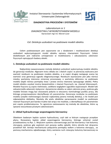 Instytut Sterowania i Systemów Informatycznych Uniwersytet Zielonogórski DIAGNOSTYKA PROCESÓW I SYSTEMÓW Laboratorium nr 1 DIAGNOSTYKA Z WYKORZYSTANIEM MODELU Opracował: mgr inż. Marcel Luzar Cel: Detekcja uszkodzeń na podstawie modeli obiektu Celem podstawowym jest zapoznanie sie z działaniem i możliwościami detekcji uszkodzeń wykorzystującymi model obiektu opisany równaniami fizycznymi. Celem dodatkowym jest nabranie umiejętności w modelowaniu i odczytywaniu zależności fizycznych opisujących badany obiekt. 1. Detekcja uszkodzeń na podstawie modeli obiektu Najbardziej zaawansowane metody detekcji uszkodzeń wykorzystują modele obiektu do generacji residuów. Algorytm testu składa sie z dwóch części: w pierwszej wyliczana jest wartość residuum na podstawie modelu obiektu, a w części drugiej następuje ocena tej wartości oraz generacja sygnału diagnostycznego. Residuum wyznaczane jest jako różnica miedzy wartością mierzona zmiennej procesowej, a wartością obliczona na podstawie modelu (bądź różnica pomiędzy lewa i prawa strona równania opisującego obiekt). Pełny model obiektu uzyskać można bezpośrednio z równań fizycznych, np. równań bilansowych. Modele fizyczne są często nieliniowe, uwikłane względem sygnałów wyjściowych. Model taki odzwierciedla własności statyczne i dynamiczne obiektu w całym zakresie pracy, podczas gdy modele liniowe mogą być stosowane jedynie w otoczeniu nominalnego punktu pracy, dla którego przeprowadzono identyfikacje ich parametrów. Generacja residuów na podstawie modelu (zwykle nieliniowego) stanowi najbardziej pewna metodę detekcji, o ile model jest odpowiednio dokładny. Niestety dla wielu obiektów opracowanie modeli na podstawie równań fizycznych jest bardzo trudne lub wręcz nie możliwe, a identyfikacja ich parametrów jest często problematyczna. To ogranicza zastosowanie tej metody do obiektów, które są opisane stosunkowo prostymi zależnościami. 2. Układ hydraulicznego wspomagania kierownicy Obiektem badanym będzie system hydrauliczny, czyli taki w którym następuje przepływ płynu. Rozważany będzie układ wspomagania kierownicy, którego schemat został przedstawiony na Rys. 1. Wejściem systemu sterowniczego jest kat kierownicy i kat kolumny sterującej, podczas gdy wyjściem jest pozycja wałka zębatki, która określa kat skręcenia przednich kół. Istnieje mechaniczne połączenia pomiędzy wałem a kolumna sterującą , za pomocą mechanizmu zębatkowego, który zamienia ruch rotacyjny kolumny kierowniczej na 1 ruch posuwisty wału skręcającego koła. Wspomaganie siłowe jest realizowane poprzez hydrauliczny tłok podłączony do wału. Na kolumnie sterującej znajduje sie drążek skrętny (zawór). Różnica pozycji kątowej pomiędzy kierownica, a pozycja kątowa zębatki wałka determinuje częściowe otwarcie zaworu skrętnego. Jeżeli różnica kątowa jest dodatnia to ciśnienie jest podawane na jedna stronę tłoka, a dla negatywnej różnicy na przeciwna stronę tłoka. Wspomaganie siłowe jest kontynuowane dopóki różnica w pozycji kierownicy i zębatki nie jest bliska zeru. Rys. 1. Schemat układu wspomagania kierownicy 2.1. Zmienne W poniższej tabeli znajdują sie definicje i wartości zmiennych użytych w tym przykładzie: 2.2. Krzywa wspomagania Drążek skrętny posiada wrodzona martwa strefę, w wyniku której dla odpowiednio małych różnic kątowych nie następuje przepływ przez zawór. Po martwej strefie, wspomaganie jest w przybliżeniu liniowe dla małych różnic w katach i rośnie wykładniczo dla zwiększających sie różnic kątowych. Dodatkowym ograniczeniem dla zaworu w pełni otwartego 2 jest maksymalne ciśnienie dostarczane przez pompę, która powoduje nasycenia w obu kierunkach. Krzywa wspomagania można aproksymować następującym równaniem: 2 P(u ) = 4.41⋅10 7 u + 4.59 ⋅1018 u 9 z martwą strefą o wartości 0.04 i saturacją dla wartości 107. 3. Program ćwiczenia 1. Utwórz model obiektu w środowisku Matlab/Simulink i dokonać jego symulacji zgodnie z załącznikiem nr 1. 2. Utworzyć podsystemy zawierające model obiektu i model rzeczywisty (system). 3. W podsystemie modelu rzeczywistego dołączyć wejście oznaczające uszkodzenie systemu wspomagania (bądź jego sprawność), zakres sygnału to <0,1> (0-100%). W jaki sposób można efektywnie symulować uszkodzenia? 4. Wygenerować sygnał residuum i dokonać detekcji uszkodzeń na jego podstawie. 5. Należy zaszumić wyjście modelu rzeczywistego i porównać sygnały residuum z poprzednim przypadkiem. Zaproponować efektywna metodę diagnostyki w takim przypadku (zastosować progowanie sygnału residuum). 6. Wykonać sprawozdanie z wykonanego ćwiczenia. 4. Literatura 1. Diagnostyka procesów. Modele, metody sztucznej inteligencji, zastosowania. Red: Korbicz J., Koscielny J.M., Kowalczuk Z., Cholewa W. - Wydawnictwo Naukowo- Techniczne, Warszawa, 2002. 2. Koscielny J.M.: Diagnostyka zautomatyzowanych procesów przemysłowych. – Akademicka Oficyna Wydawnicza EXIT, Warszawa, 2001. 3. Pieczynski A.: Komputerowe systemy diagnostyczne procesów przemysłowych. Wydawnictwo Politechniki Zielonogórskiej, Zielona Góra, 1999. 4. Pieczynski A.: Reprezentacja wiedzy w diagnostycznych systemach ekspertowych. Lubuskie Towarzystwo Naukowe, Zielona Góra, 2003. 5. Piegat A.: Modelowanie i sterowanie rozmyte. - Akademicka Oficyna Wydawnicza EXIT, Warszawa, 1999. 6. Rutkowska D.: Inteligentne systemy obliczeniowe, Algorytmy genetyczne i sieci neuronowe w systemach rozmytych. - Akademicka Oficyna Wydawnicza, Warszawa, 1997 7. Rutkowska D., Pilinski M., Rutkowski L.: Sieci neuronowe, algorytmy genetyczne i zbiory rozmyte, - Wydawnictwo Naukowe PWN, Warszawa, 1999. 8. Yager R.R., Filev D.P.: Podstawy modelowania i sterowania rozmytego, - J.Wiley & Sons. Inc. 1994. 3 Aneks 1. Budowanie modelu w Simulinku ze strony http://web.archive.org/web/20070610152306/http://www.me.cmu.edu/ct